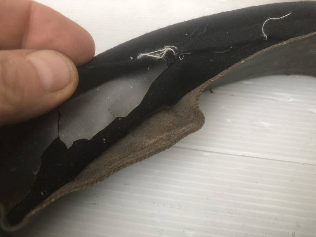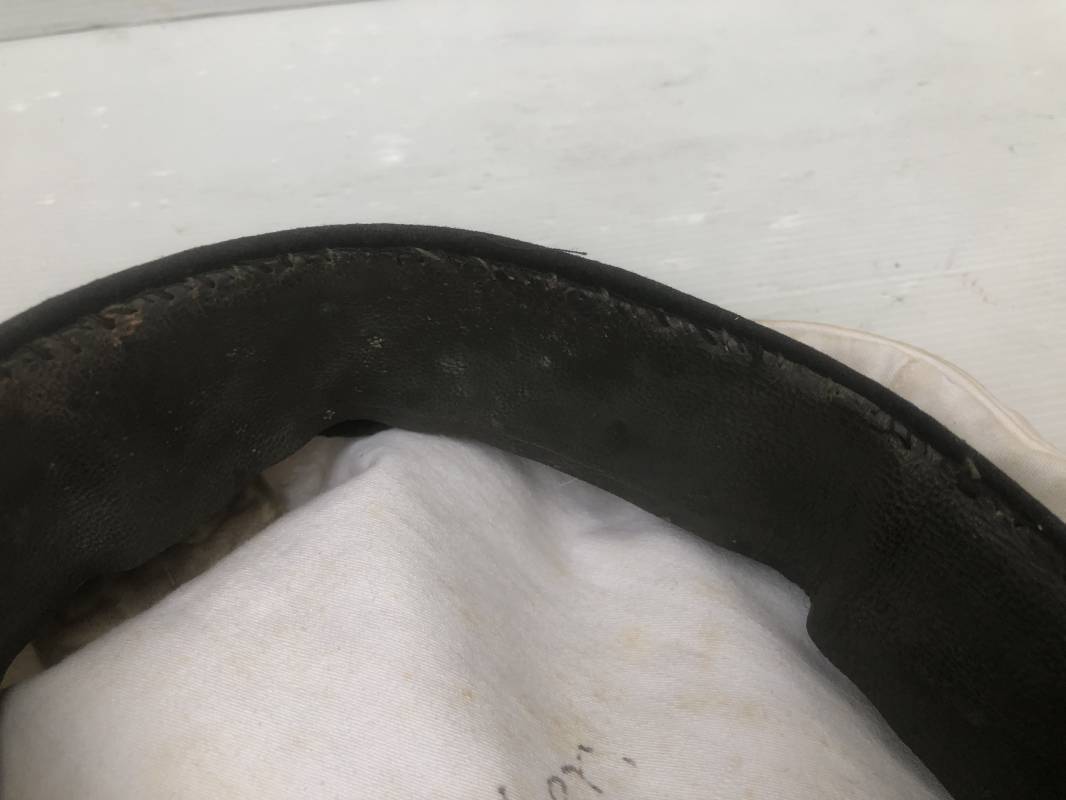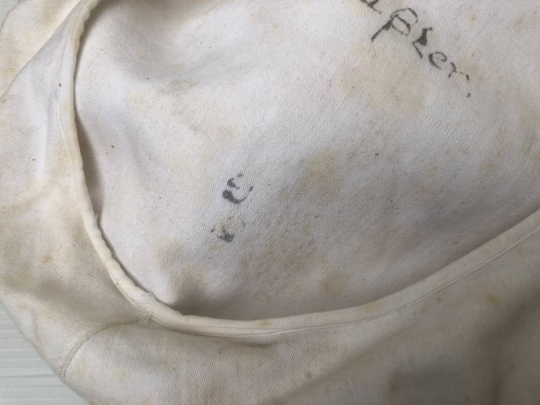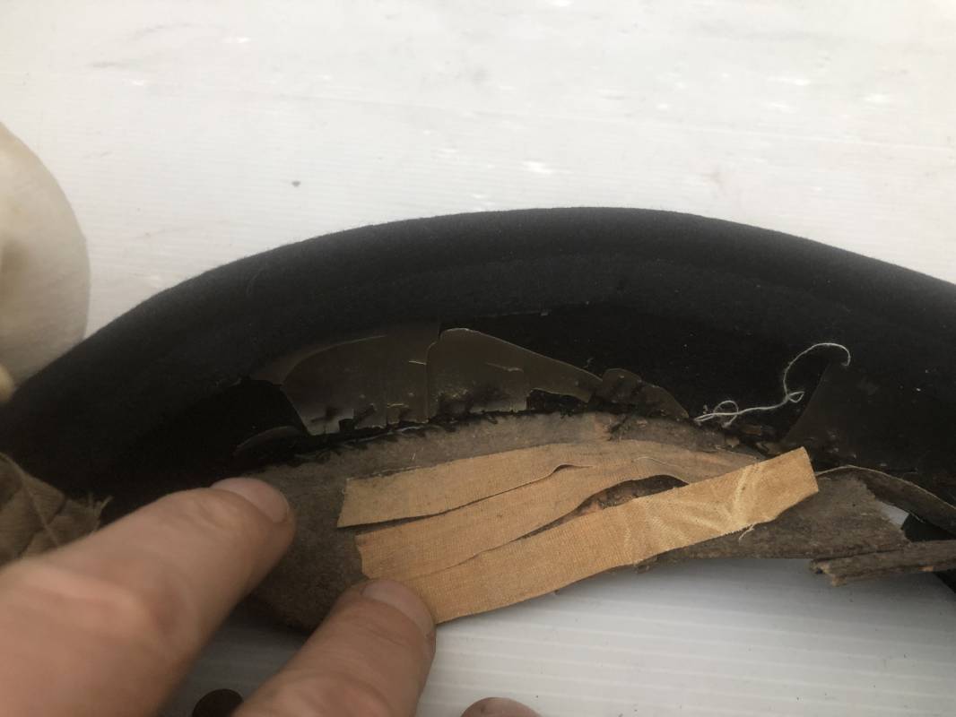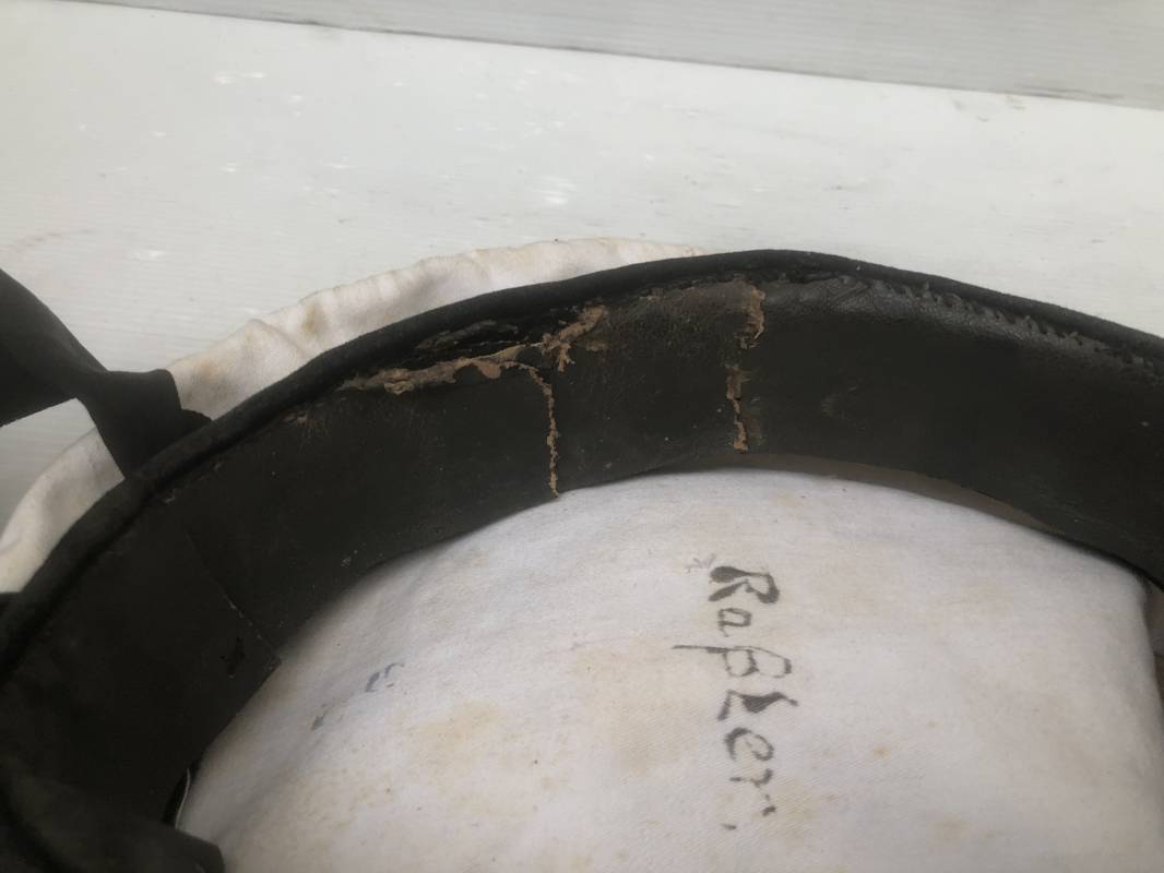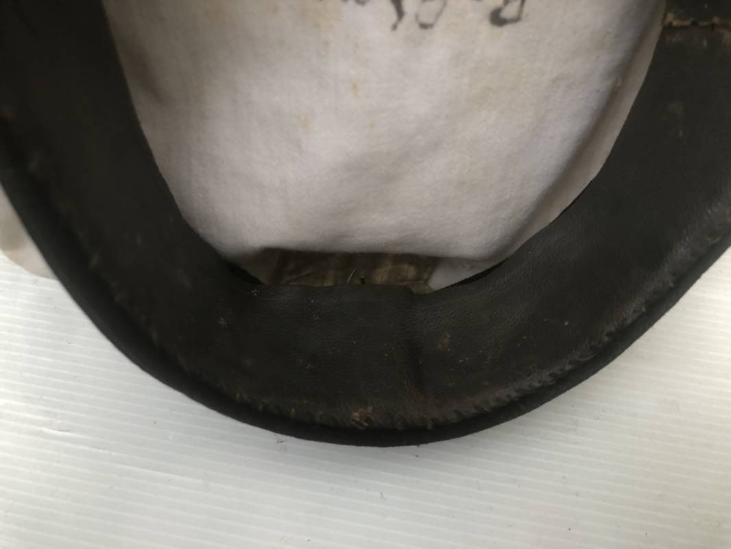 Rare bachis réglementaire d'un matelot de la Kriegsmarine . Bachis amovible avec sa coiffe en coton blanc Bachis en coton bleu nuit , bande de bachis en soie noire tissée BEVO en fil doré ' KRIEGSMARINE' Pourtour de coiffe en célléon translucide typique des bonne fabrication 2éme guerre . Célléon cassé avec manque ( voir photos ) Bandeau de coiffe intérieure en cuir gris . Cuir souple taille 57 Peties déchirures . Coiffe en coton blanc de dotation avec marquage encre de taille 57 , nom du matelot manuscrit en fond de coiffe . Insignes mono bloc , aigle doré et cocarde métalliques avec fixation par épingle verticale . Bachis porté , trés belle patine générale . Rare coiffure 100 % dans son jus et totalement intouchée 1940/45 Ref 19526