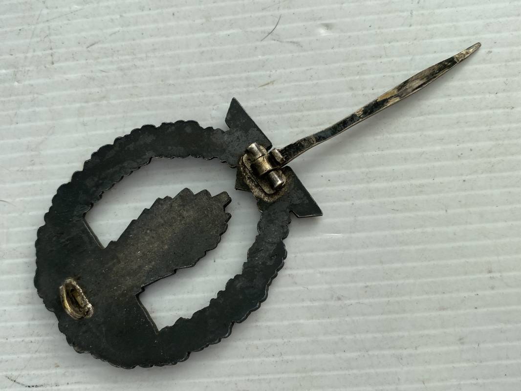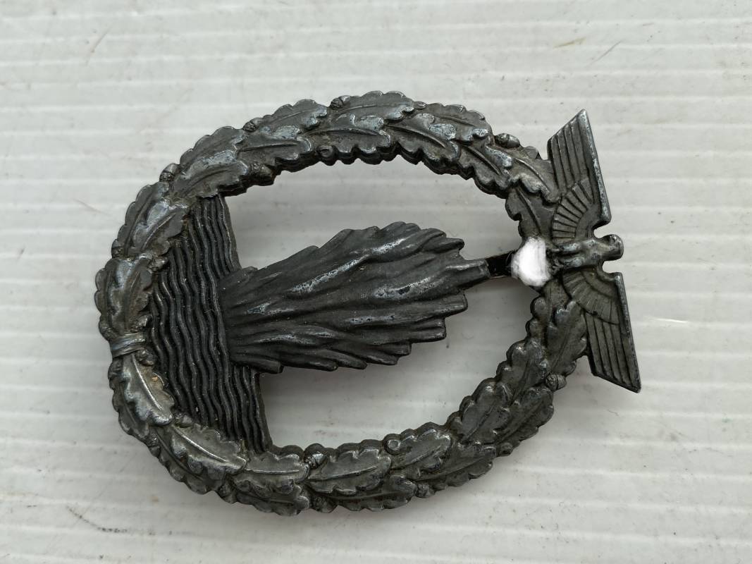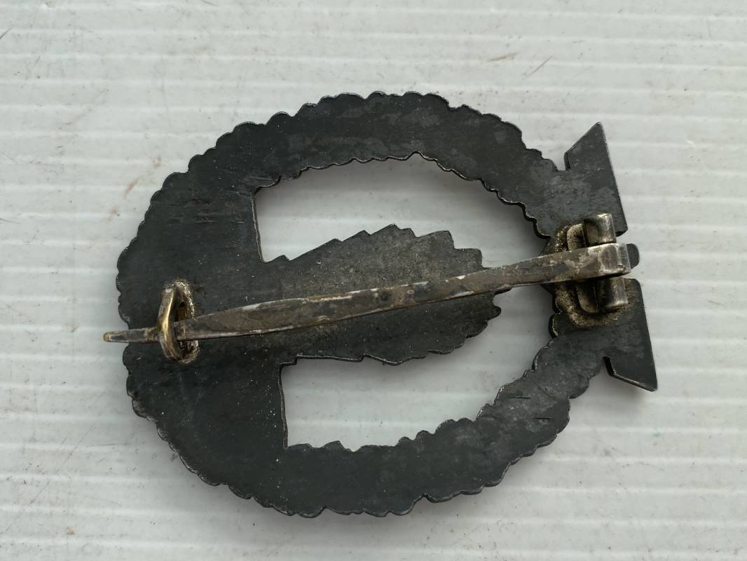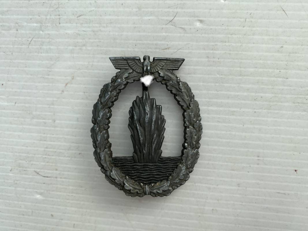 Beau badge d'un mouilleur de mines de la Kriegsmarine. Fabrication massive légèrement bombée. Beaux reliefs, bonne peinture grise d'origine. Porté en bon état. Attache et crochet au dos d'origines. Ref 17326
