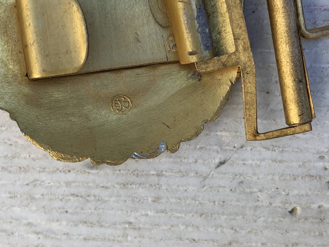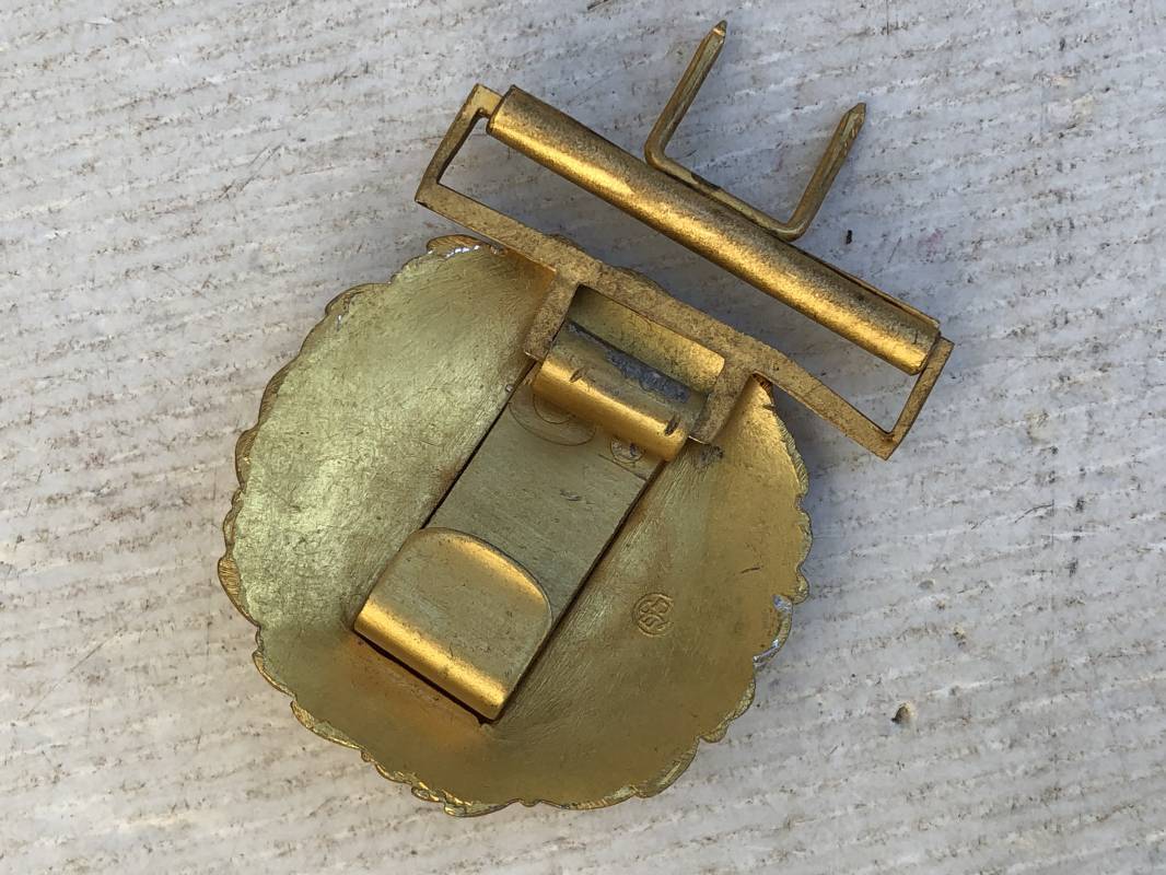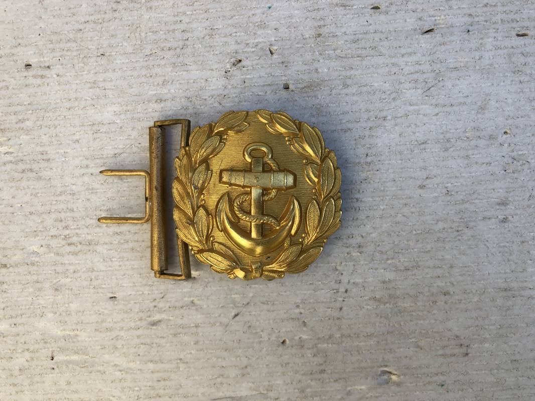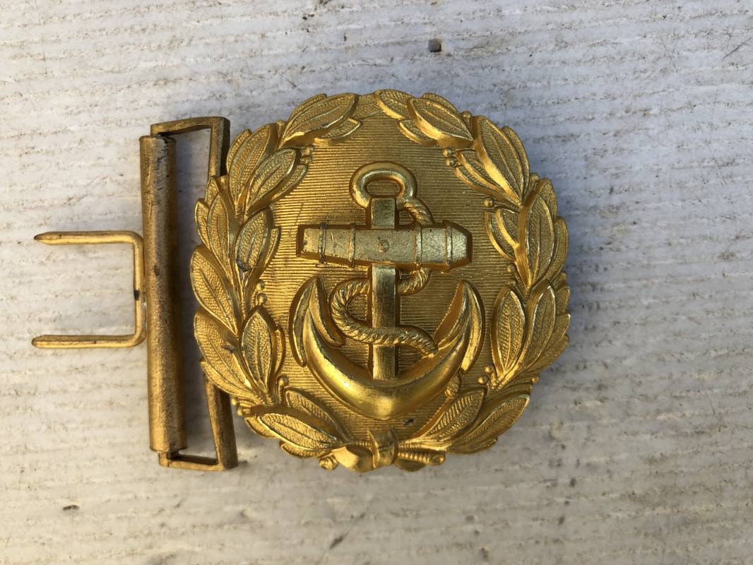 Boucle ronde dorée d'un officier de la Kriegsmarine . Boucle ronde pour ceinturon feldbinde pour tenue de sortie . Diamétre 60 mm . Fabrication massive , dorure d'origine Marquage code fabricant au dos . Passant et crochet fer pour fixation , légérement porté en parfait état Ref 13707