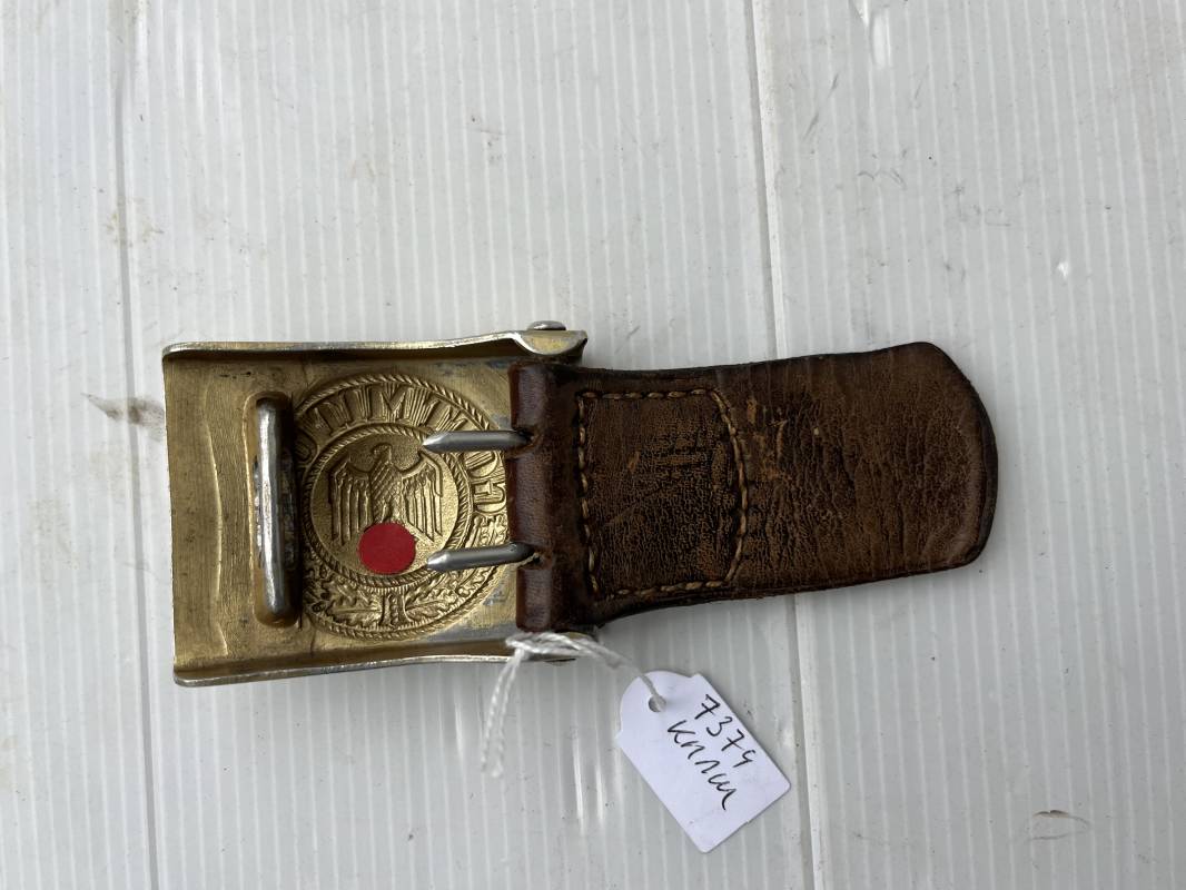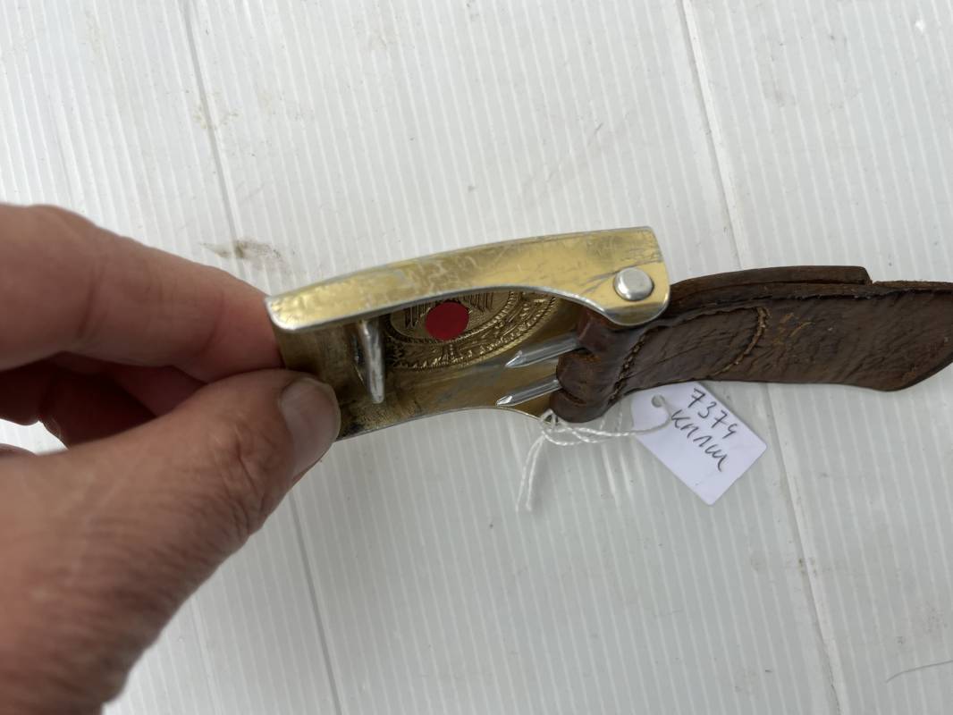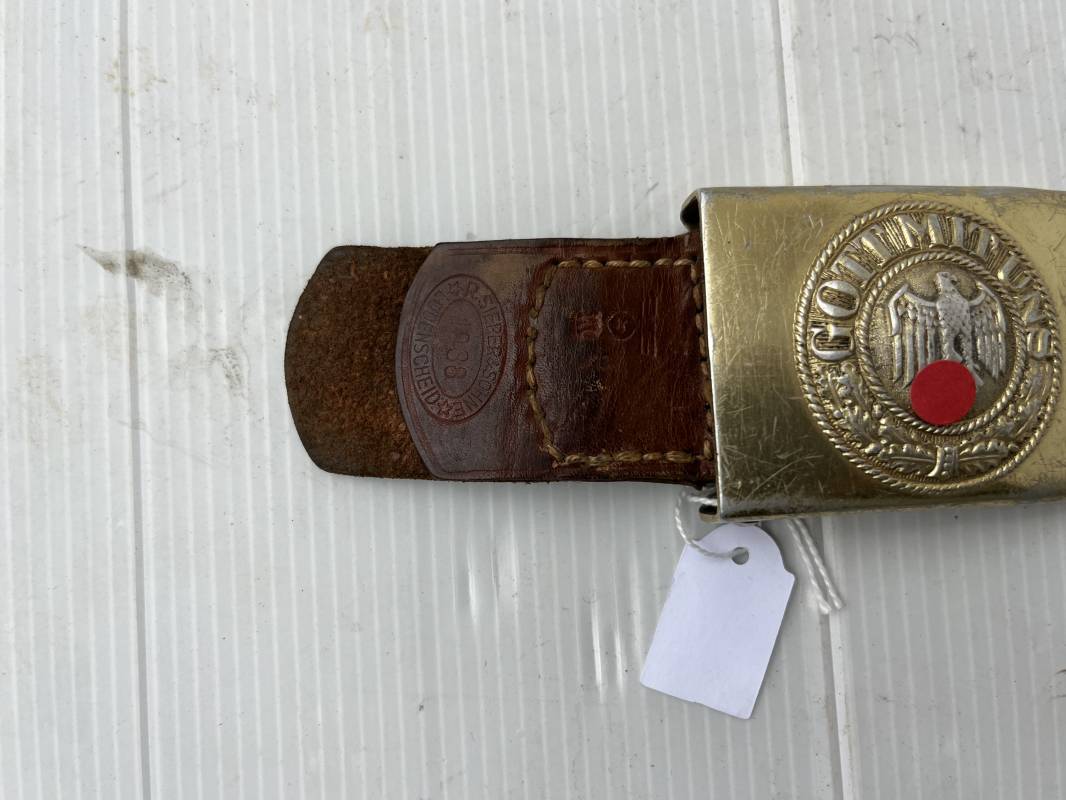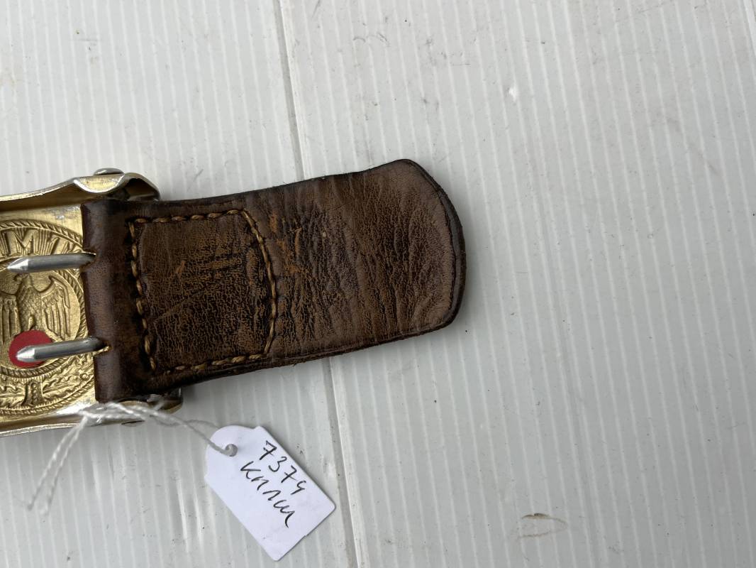 Rare boucle troupe mdle 1935 de la Kriegsmarine en aluminium doré . Languette en cuir marron avec marquage fabricant R. Sieper Sohne Ludencheid 1938 , aigle de réception de la KM . Boucle avec passant et crochet de fixation . Belle dorure d origine , légérement porté en parfait état 1935/45 Ref 7374