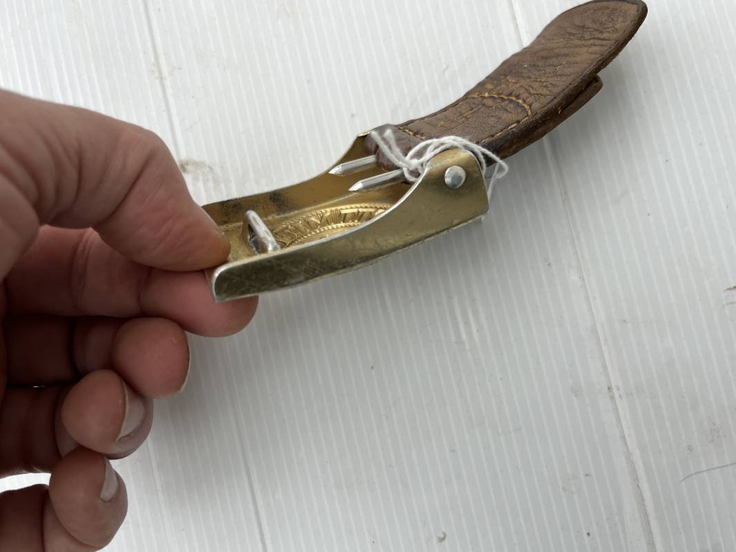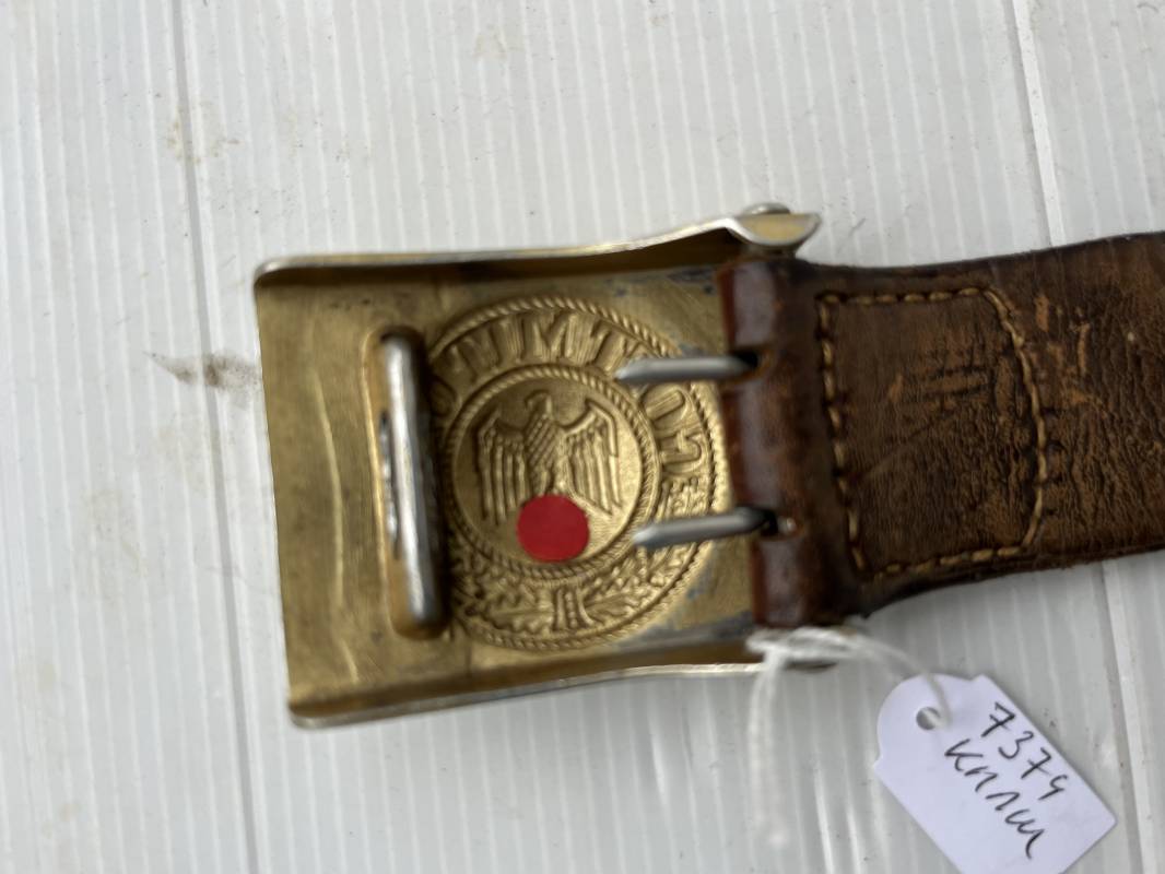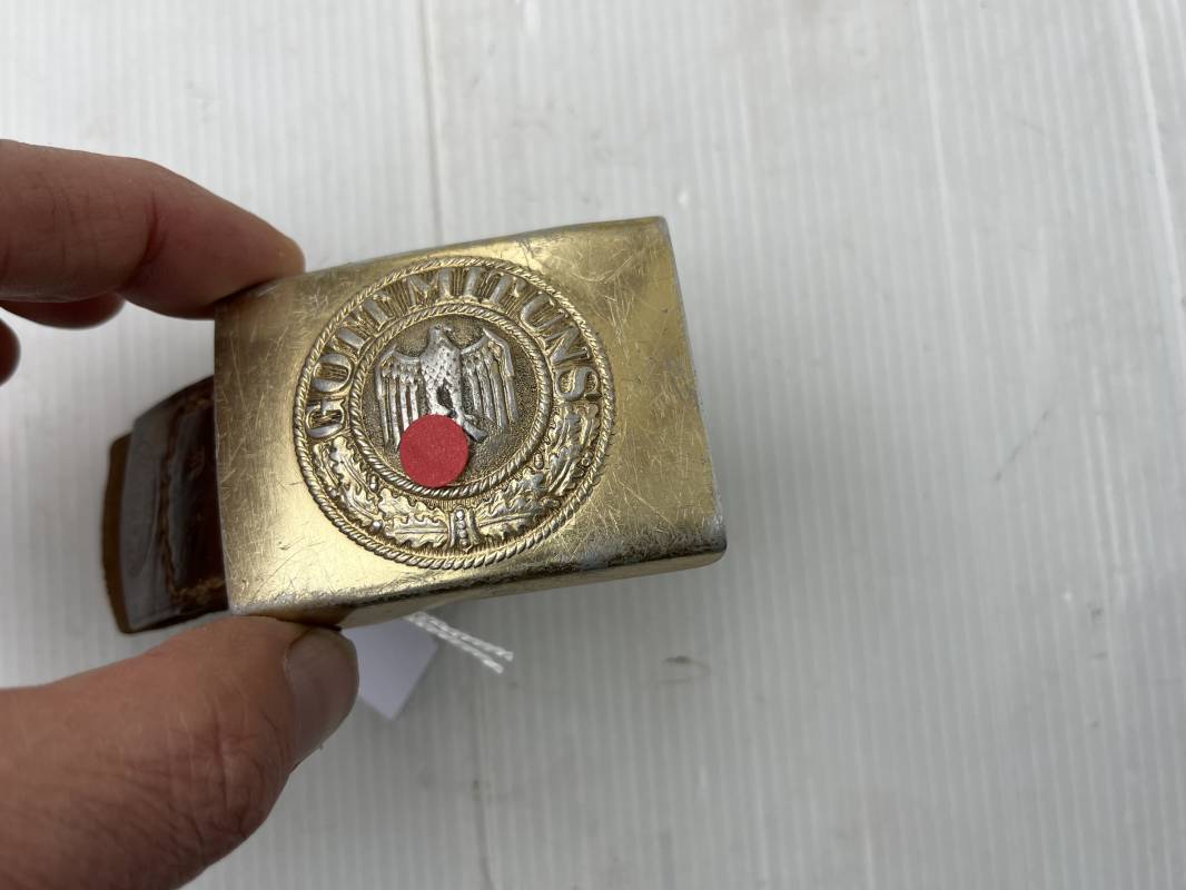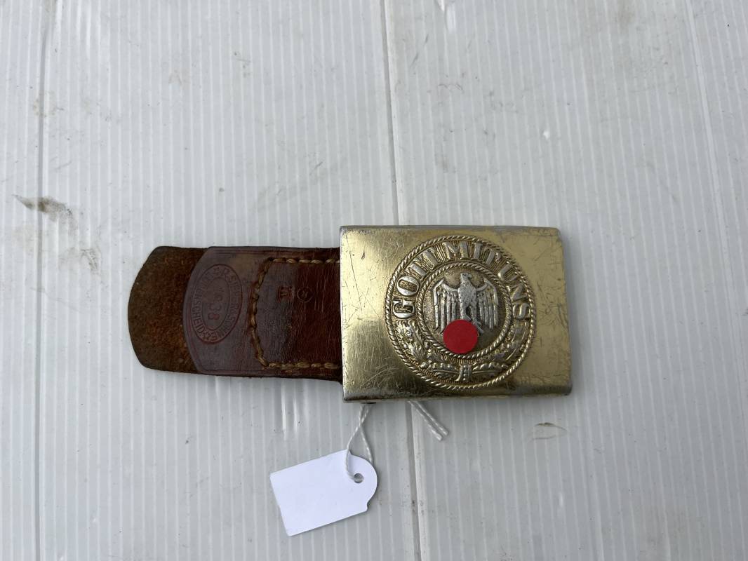 Rare boucle troupe mdle 1935 de la Kriegsmarine en aluminium doré . Languette en cuir marron avec marquage fabricant R. Sieper Sohne Ludencheid 1938 , aigle de réception de la KM . Boucle avec passant et crochet de fixation . Belle dorure d origine , légérement porté en parfait état 1935/45 Ref 7374