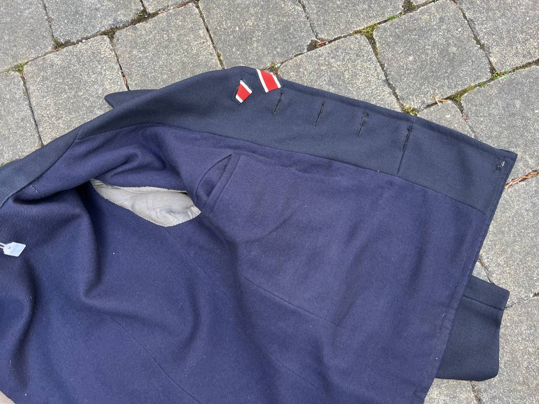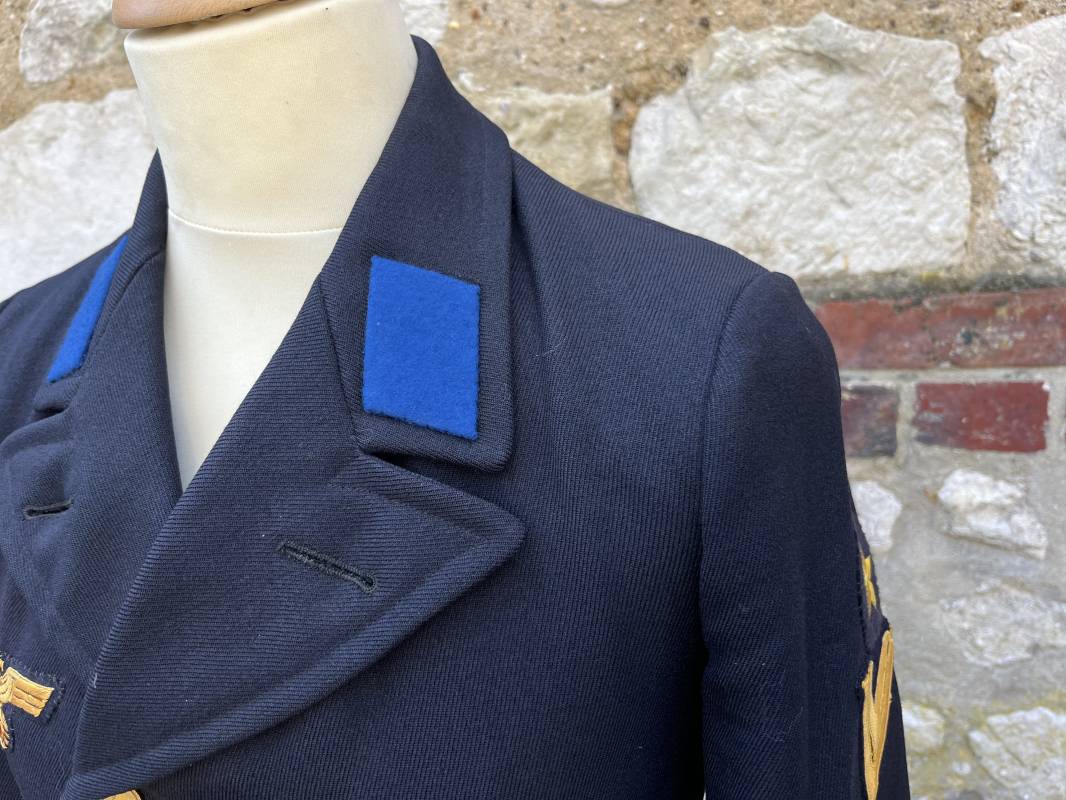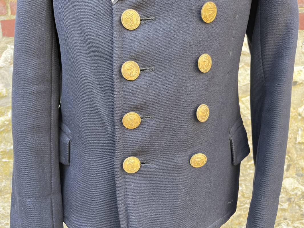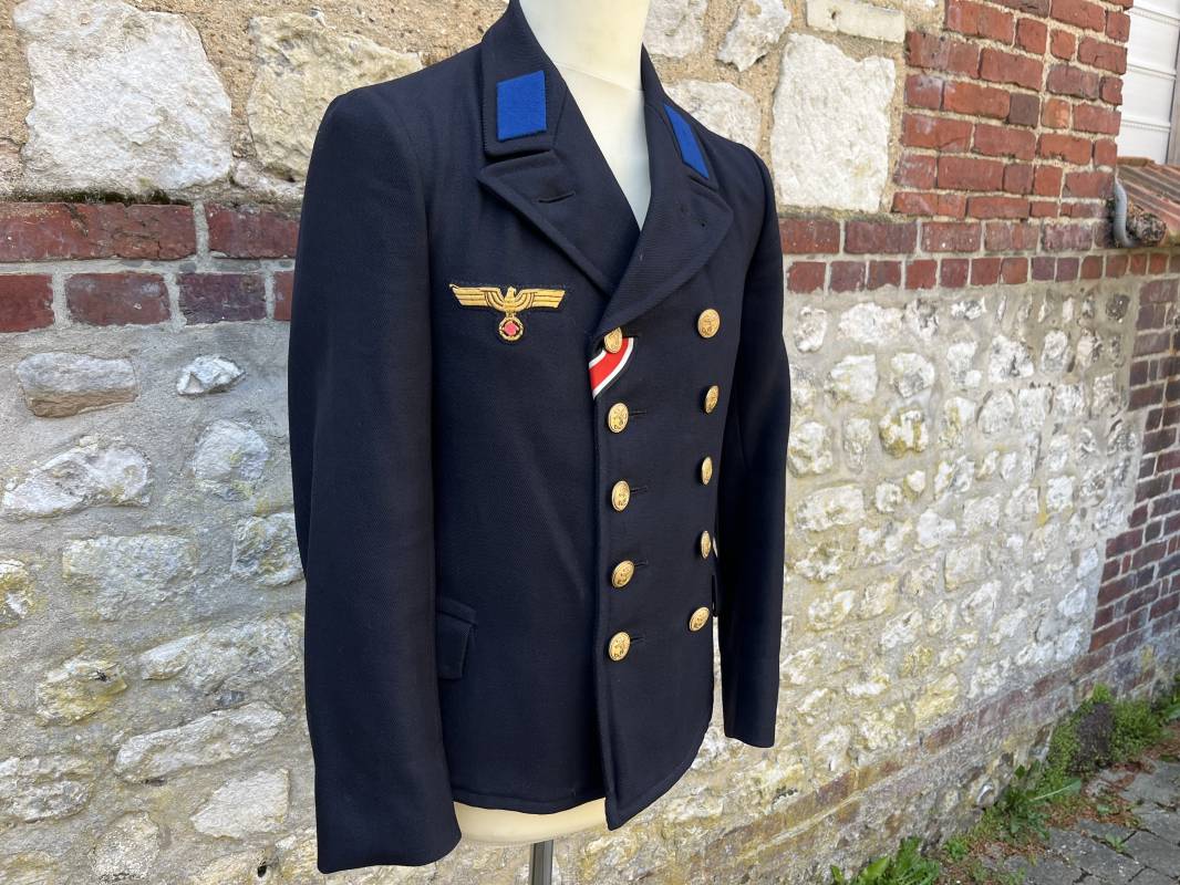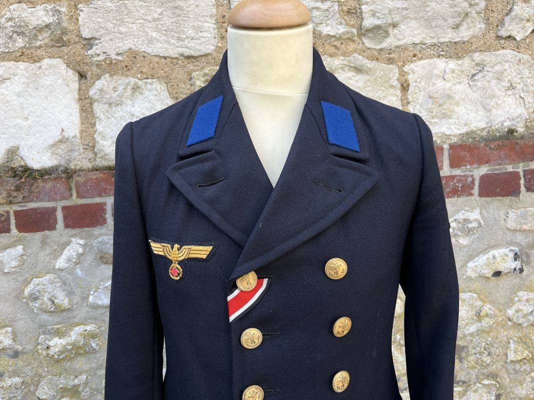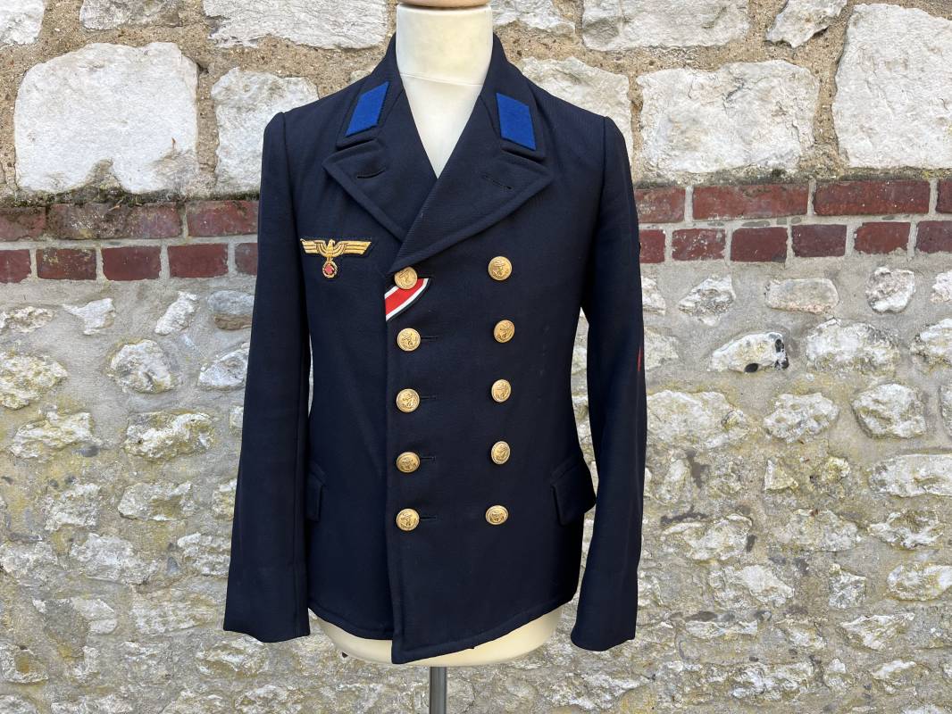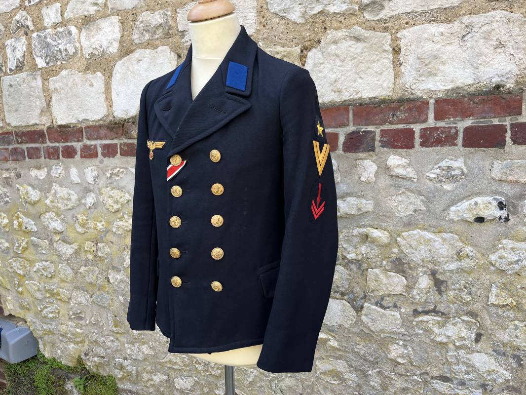 Trés beau caban d un matelot navigant de la Kriegsmarine . Caban réglemantaire en gabardine bleu nuit . Caban croisé à deux rangées de boutons dorés à ancre . Ruban de croix de fer 2éme classe 1939 cousu à la boutonnière . Galons de manches dorés et insignes étoile de navigant en coton dorée , Grade de quartier maitre ( Matrosenhauptgefreiter ) , insigne de spécialité avec chevrons . Deux poches basses à rabats . Aigle de poitrine en cannetille dorée . Pattes de col troupe en drap bleu roi cousues au col . Intérieur du veston doublé en laine bleu nuit , deux poches intérieures . Manches doublées en satinette grise avec marquages taille a l encre noire . Largeur épaules 41 cm , longueur 67 cm , manche 62 cm . Caban légèrement porté en tres bel état . Rare caban d'un matelot navigant de la KM 1940/45 Ref 21878