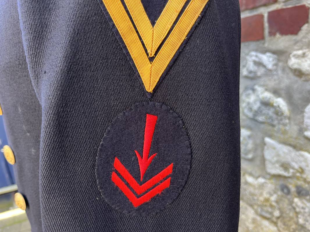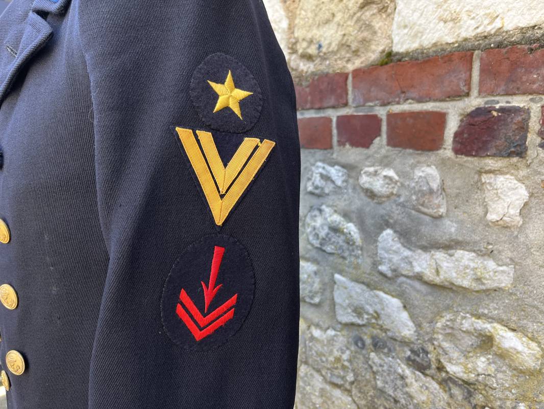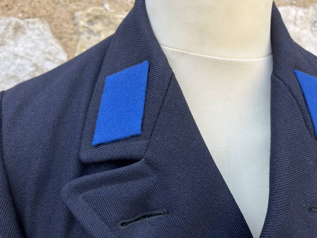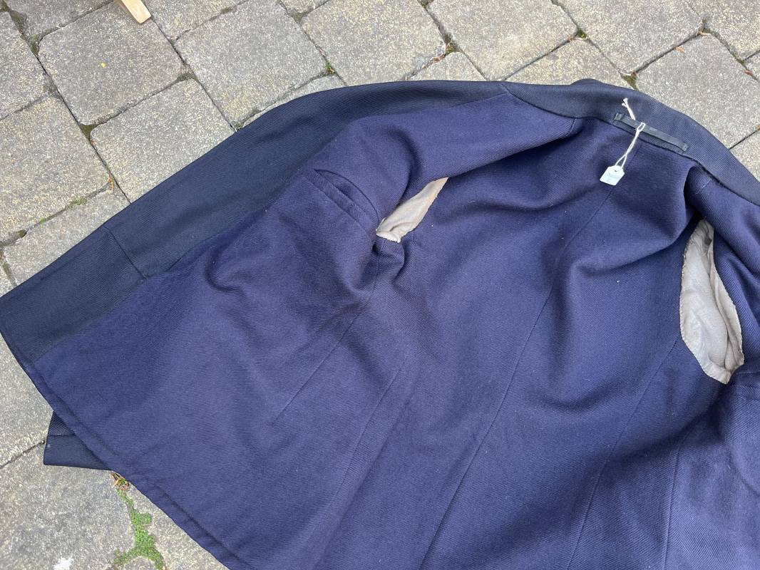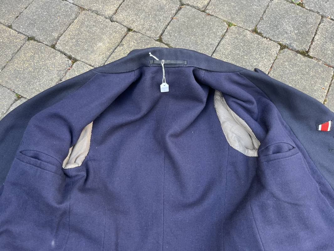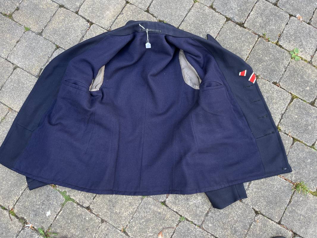 Trés beau caban d un matelot navigant de la Kriegsmarine . Caban réglemantaire en gabardine bleu nuit . Caban croisé à deux rangées de boutons dorés à ancre . Ruban de croix de fer 2éme classe 1939 cousu à la boutonnière . Galons de manches dorés et insignes étoile de navigant en coton dorée , Grade de quartier maitre ( Matrosenhauptgefreiter ) , insigne de spécialité avec chevrons . Deux poches basses à rabats . Aigle de poitrine en cannetille dorée . Pattes de col troupe en drap bleu roi cousues au col . Intérieur du veston doublé en laine bleu nuit , deux poches intérieures . Manches doublées en satinette grise avec marquages taille a l encre noire . Largeur épaules 41 cm , longueur 67 cm , manche 62 cm . Caban légèrement porté en tres bel état . Rare caban d'un matelot navigant de la KM 1940/45 Ref 21878