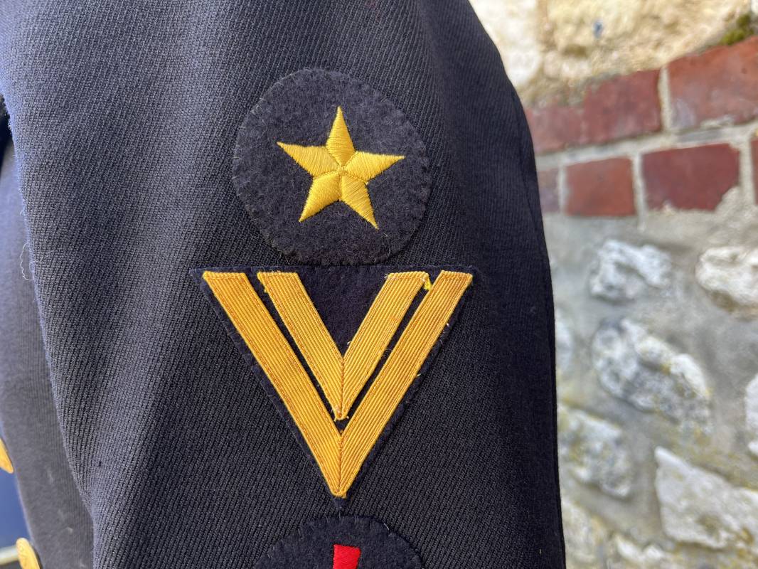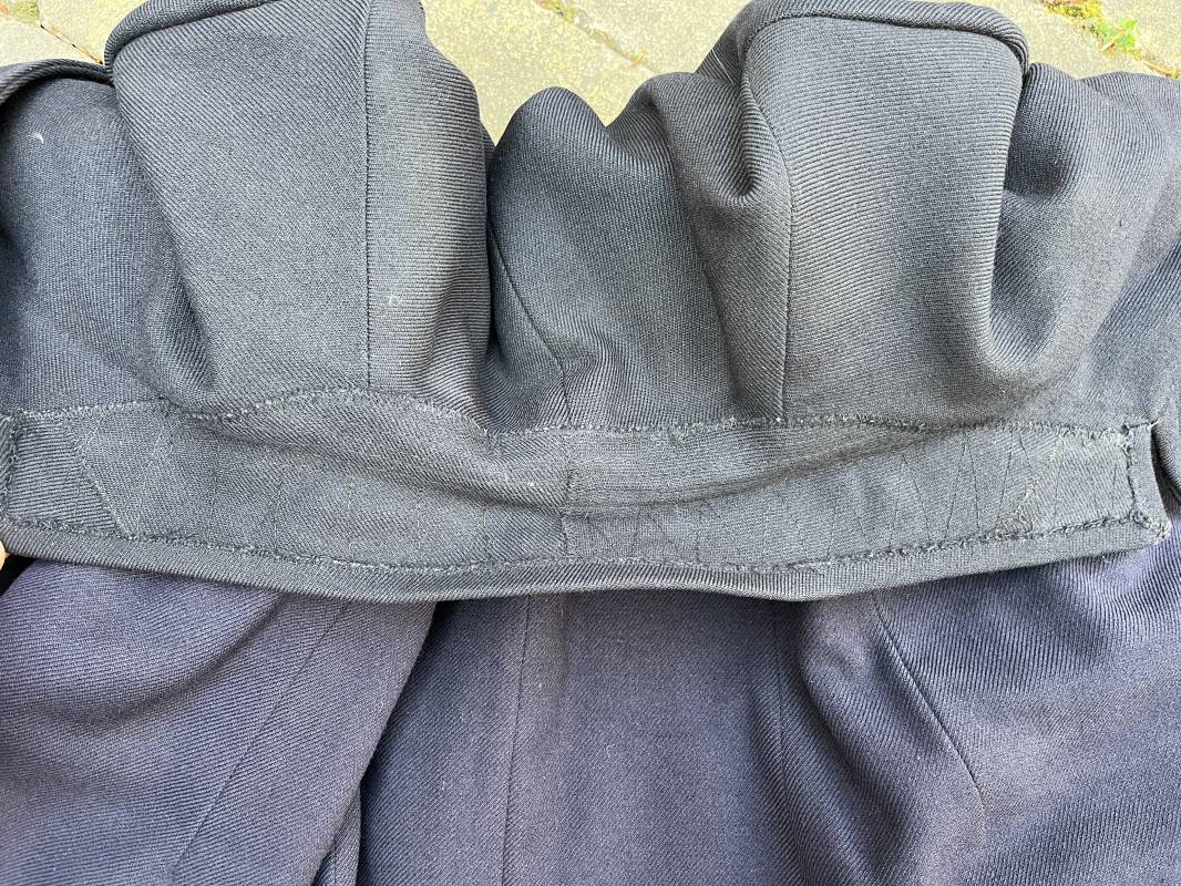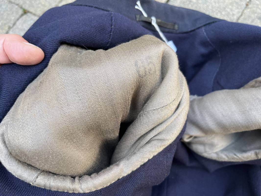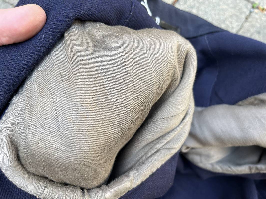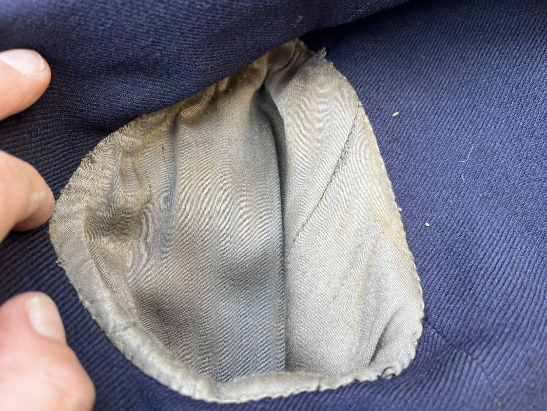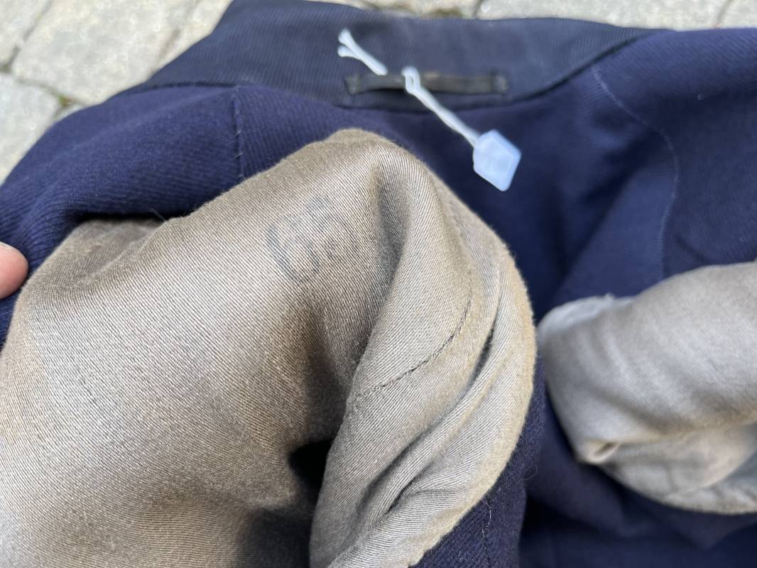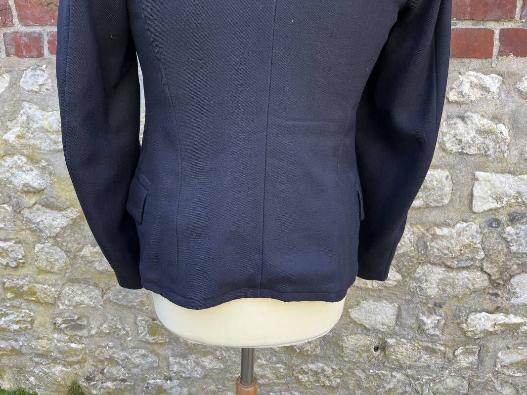 Trés beau caban d un matelot navigant de la Kriegsmarine . Caban réglemantaire en gabardine bleu nuit . Caban croisé à deux rangées de boutons dorés à ancre . Ruban de croix de fer 2éme classe 1939 cousu à la boutonnière . Galons de manches dorés et insignes étoile de navigant en coton dorée , Grade de quartier maitre ( Matrosenhauptgefreiter ) , insigne de spécialité avec chevrons . Deux poches basses à rabats . Aigle de poitrine en cannetille dorée . Pattes de col troupe en drap bleu roi cousues au col . Intérieur du veston doublé en laine bleu nuit , deux poches intérieures . Manches doublées en satinette grise avec marquages taille a l encre noire . Largeur épaules 41 cm , longueur 67 cm , manche 62 cm . Caban légèrement porté en tres bel état . Rare caban d'un matelot navigant de la KM 1940/45 Ref 21878