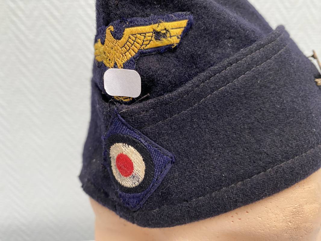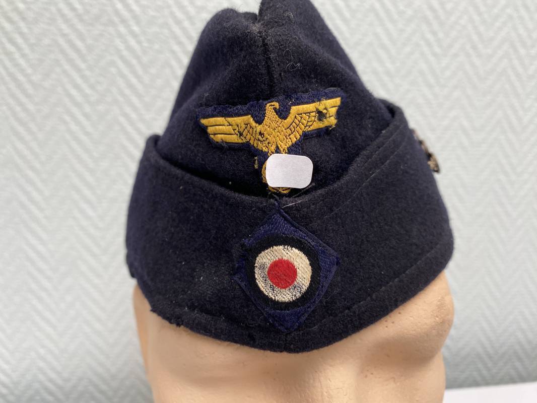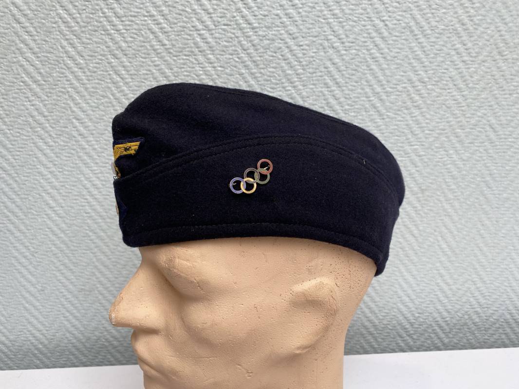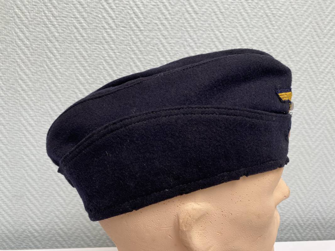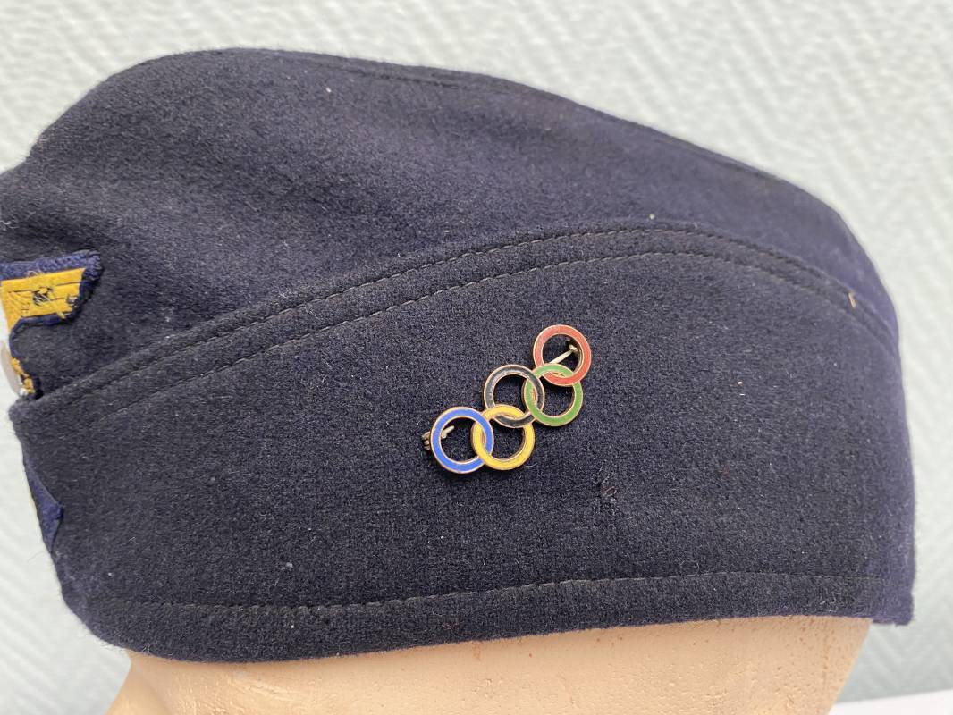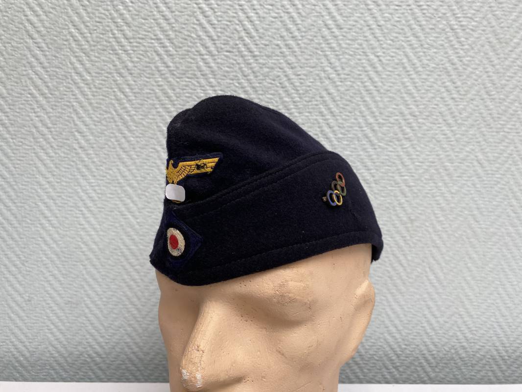 Beau calot d'un matelot de la Kriegsmarine affecté a un équipage de U Boot . Calot de dotation en drap bleu nuit . Aigle et cocarde montés d'origine du modéle tIssé bevo . Insigné émaillé épinglé sur le coté gauche ' JO 1936 ' Marquage au dos Gesch Ges , épingle horizontale , émail en parfait état . Cet insigne général des JO sera repris par une dizaine de cadets élèves officier de la KM promotion 1936 ( U 22 , U23 ,U59 , U106 , U128 , U192 , U203 ,U228, U306 ... ) . Coiffure de fabrication francaise ' La chapelière Parisienne avec tampon rond Taille 60 . Drap frais , calot porté avec petites usures générales . Trés belle patine . Ce rare calot a été trouvé dans le secteur de Nantes il y a 35 ans . Ref 18568