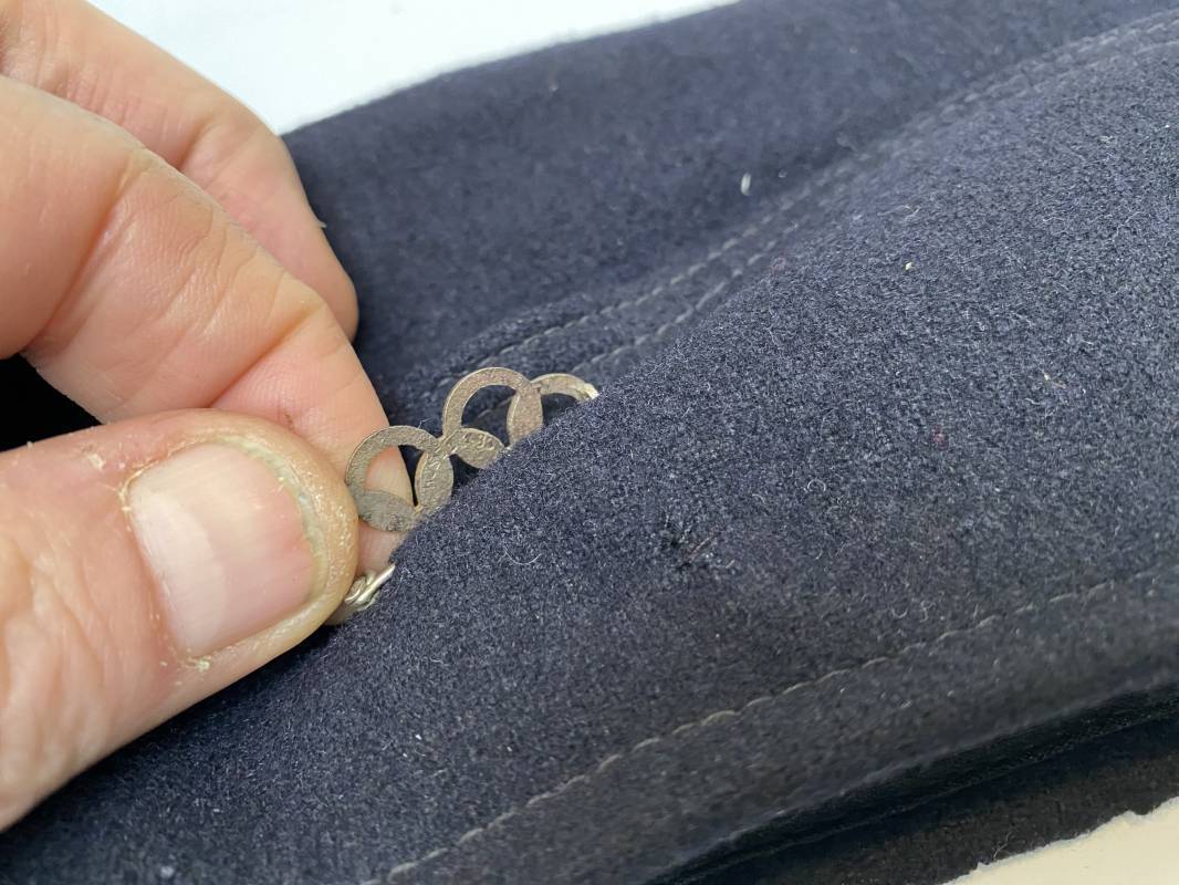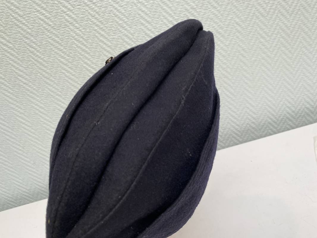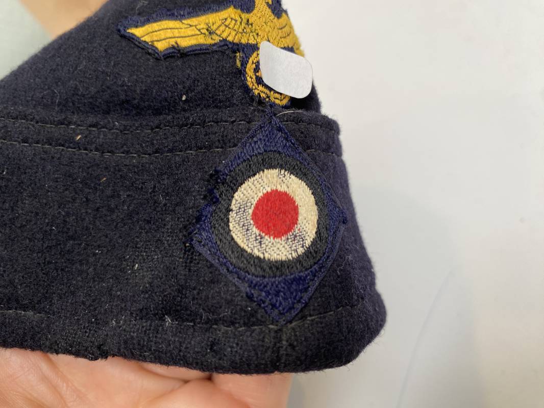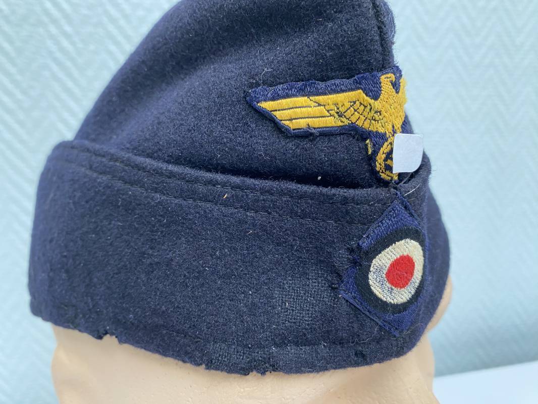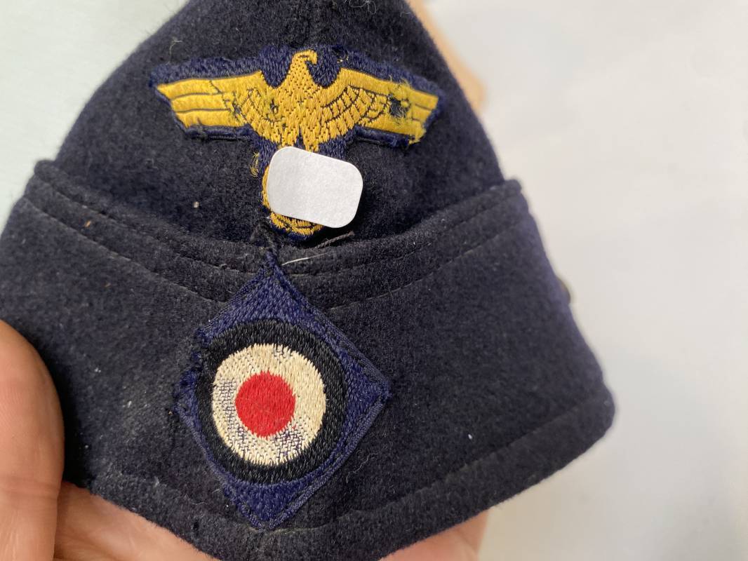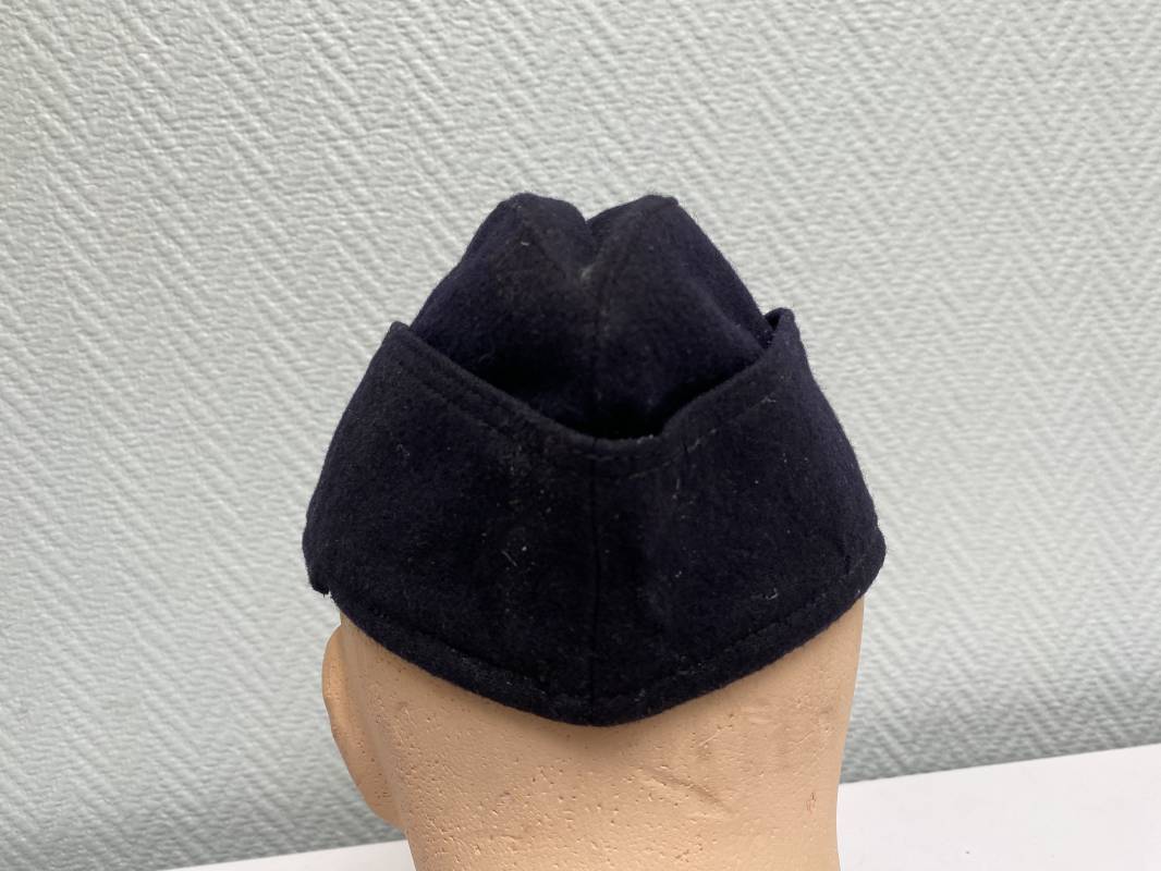 Beau calot d'un matelot de la Kriegsmarine affecté a un équipage de U Boot . Calot de dotation en drap bleu nuit . Aigle et cocarde montés d'origine du modéle tIssé bevo . Insigné émaillé épinglé sur le coté gauche ' JO 1936 ' Marquage au dos Gesch Ges , épingle horizontale , émail en parfait état . Cet insigne général des JO sera repris par une dizaine de cadets élèves officier de la KM promotion 1936 ( U 22 , U23 ,U59 , U106 , U128 , U192 , U203 ,U228, U306 ... ) . Coiffure de fabrication francaise ' La chapelière Parisienne avec tampon rond Taille 60 . Drap frais , calot porté avec petites usures générales . Trés belle patine . Ce rare calot a été trouvé dans le secteur de Nantes il y a 35 ans . Ref 18568