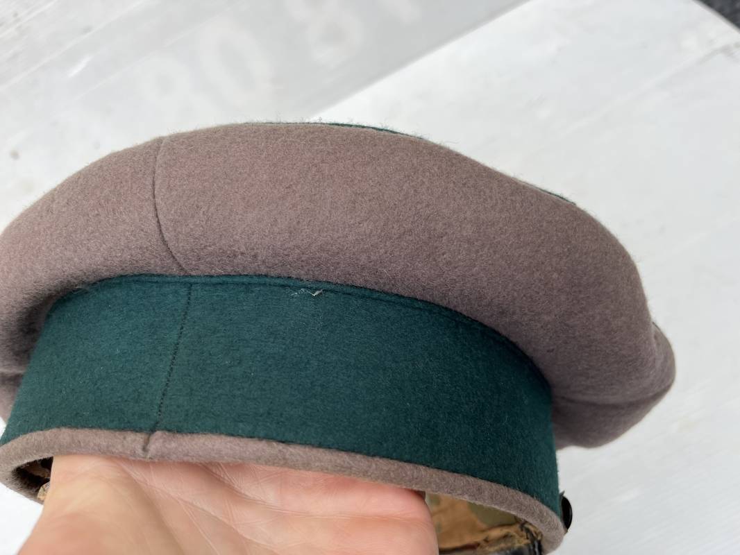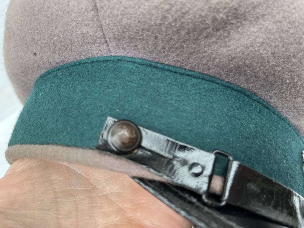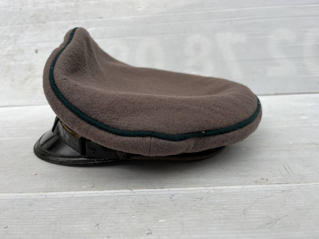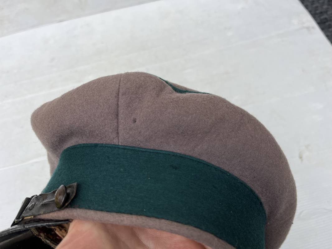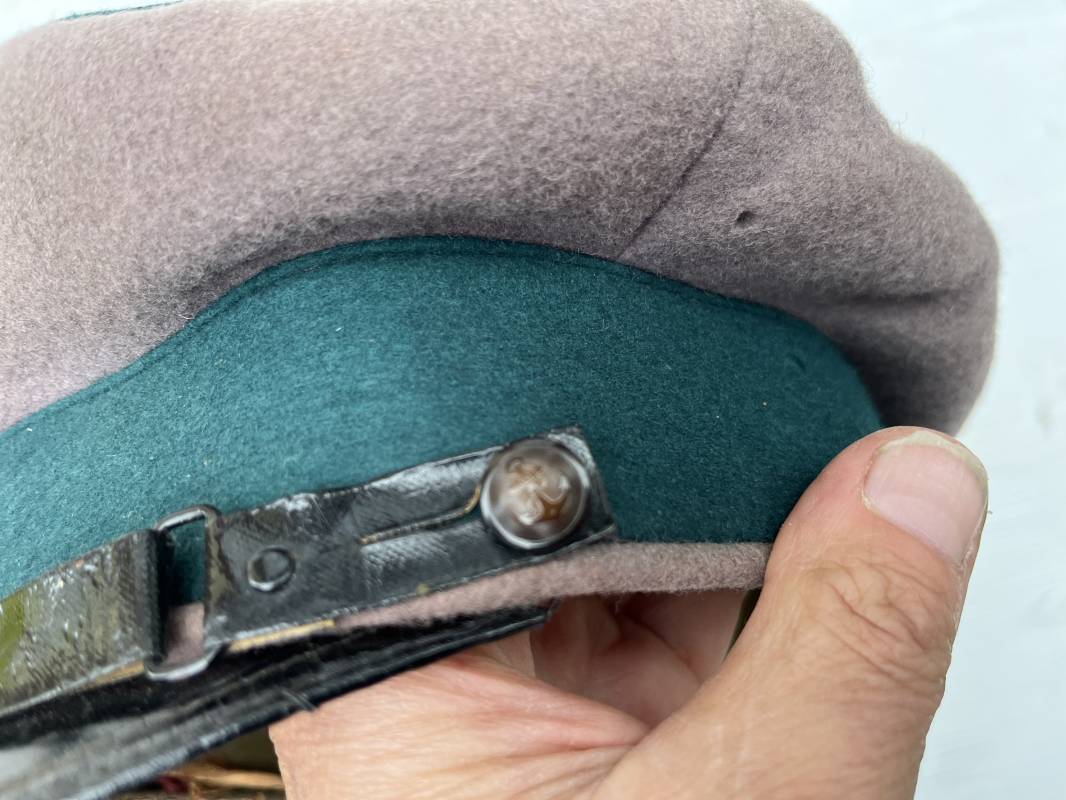 Rare casquette d un sous officier de l artillerie cotière de la Kriegsmarine . Coiffure en drap feldgrau clair , liseré vert foncé de l artillerie cotière . Insigne en alu doré , aigle et cocarde . Bandeau de coiffe en drap vert foncé . Grand plateau typique des coiffes de la KM . Jugulaire en cuir verni noir deux petits boutons a ancre en pastique feldgrau . Deux liseré de coiffe ( et non pas trois ) également typique des coiffes de l artillerie cotière de la KM . Visière en mica noir ,large jonc sur le pourtour Coiffure doublée en satinette violacée , trace d un rhodoid ici manquant . Bande de coiffe intérieure e, toile enduite cirée verte ( légèrement décousu sur le devant ( voir photos) Taille 58 . Belle casquette légèrement portée en trés bel état . Rare coiffe d un sous officier d el artillerie cotière 1940/45 Ref 21239