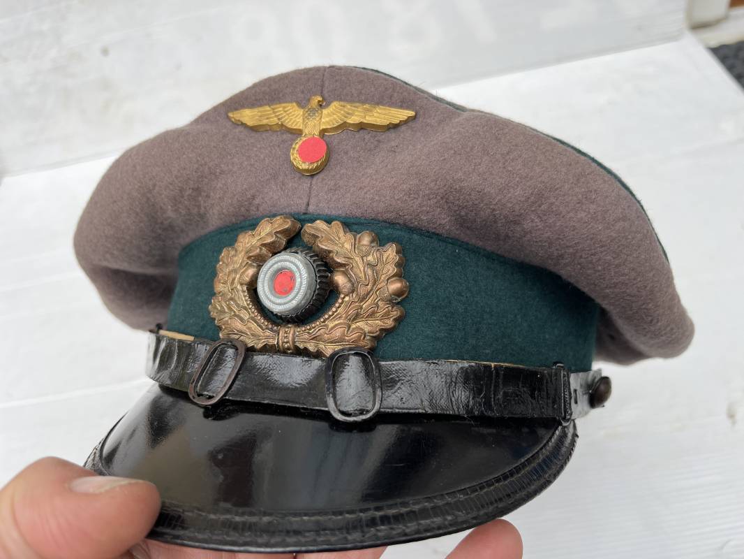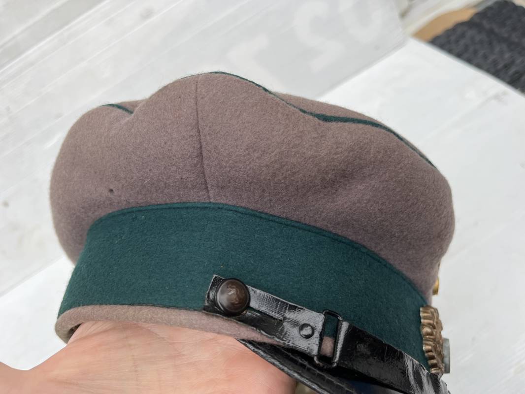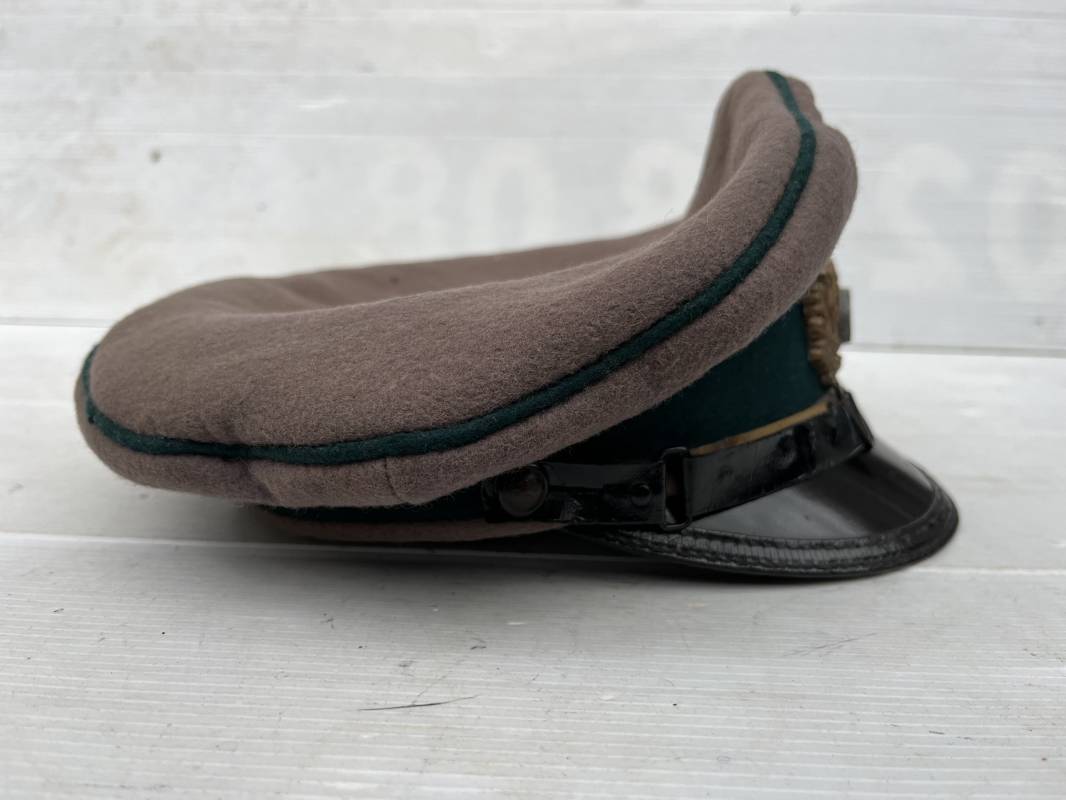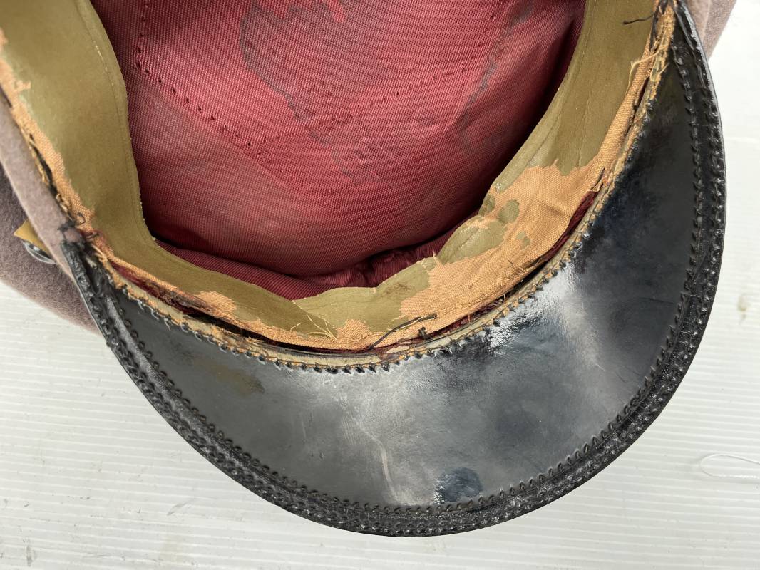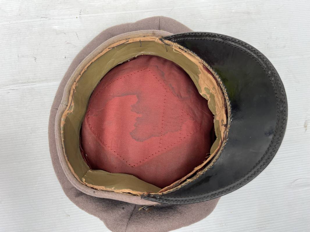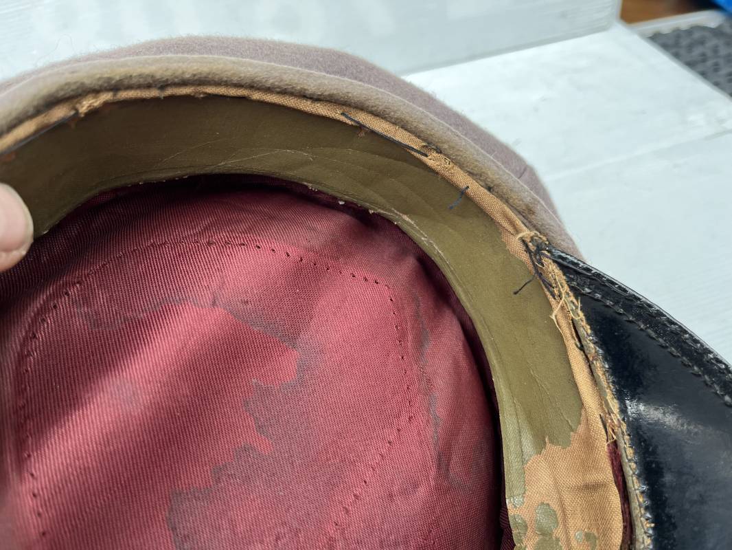 Rare casquette d un sous officier de l artillerie cotière de la Kriegsmarine . Coiffure en drap feldgrau clair , liseré vert foncé de l artillerie cotière . Insigne en alu doré , aigle et cocarde . Bandeau de coiffe en drap vert foncé . Grand plateau typique des coiffes de la KM . Jugulaire en cuir verni noir deux petits boutons a ancre en pastique feldgrau . Deux liseré de coiffe ( et non pas trois ) également typique des coiffes de l artillerie cotière de la KM . Visière en mica noir ,large jonc sur le pourtour Coiffure doublée en satinette violacée , trace d un rhodoid ici manquant . Bande de coiffe intérieure e, toile enduite cirée verte ( légèrement décousu sur le devant ( voir photos) Taille 58 . Belle casquette légèrement portée en trés bel état . Rare coiffe d un sous officier d el artillerie cotière 1940/45 Ref 21239
