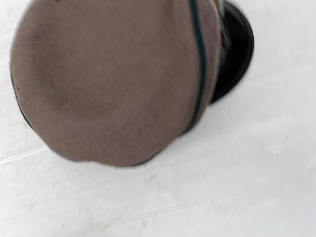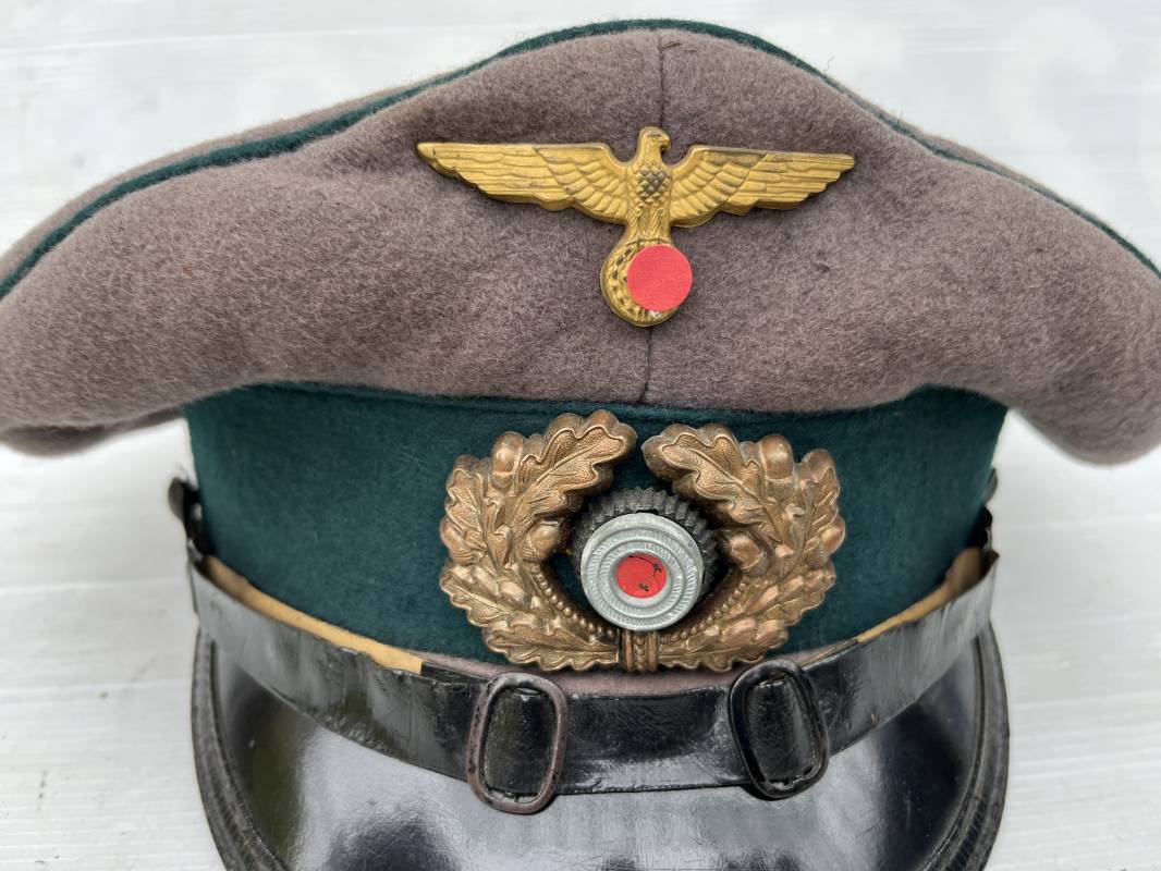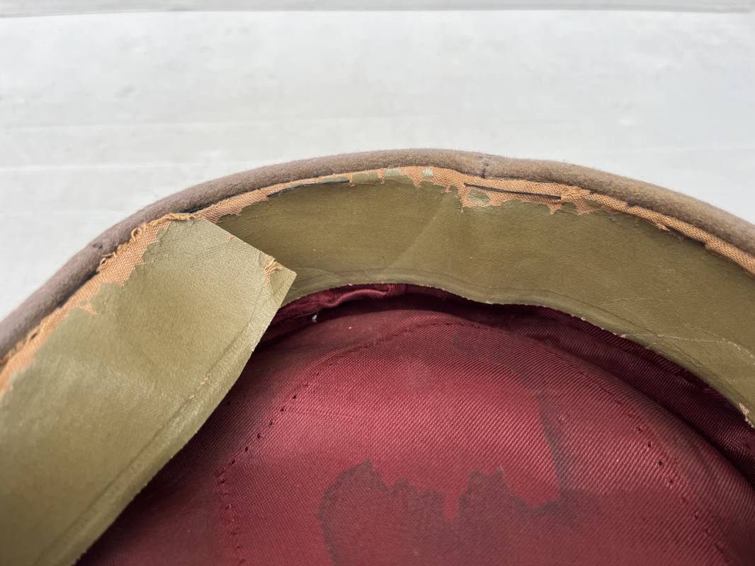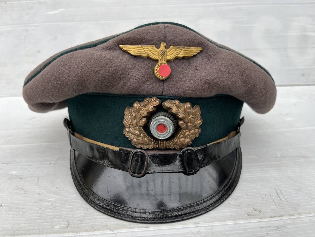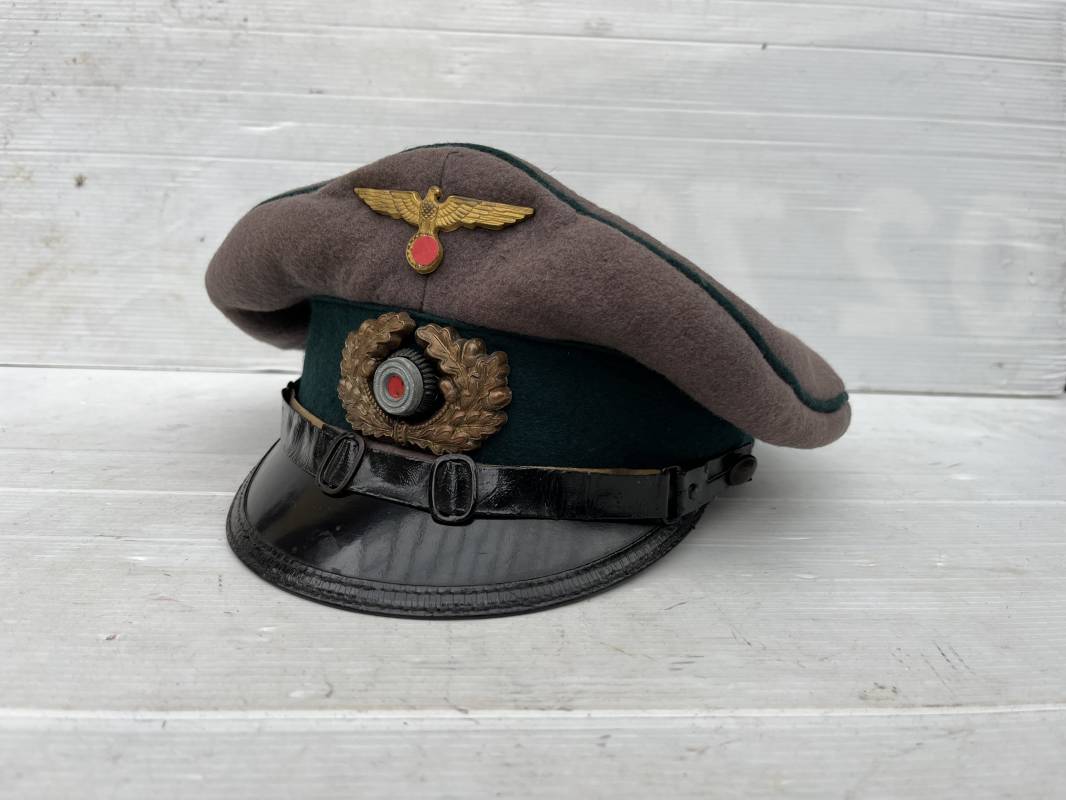 Rare casquette d un sous officier de l artillerie cotière de la Kriegsmarine . Coiffure en drap feldgrau clair , liseré vert foncé de l artillerie cotière . Insigne en alu doré , aigle et cocarde . Bandeau de coiffe en drap vert foncé . Grand plateau typique des coiffes de la KM . Jugulaire en cuir verni noir deux petits boutons a ancre en pastique feldgrau . Deux liseré de coiffe ( et non pas trois ) également typique des coiffes de l artillerie cotière de la KM . Visière en mica noir ,large jonc sur le pourtour Coiffure doublée en satinette violacée , trace d un rhodoid ici manquant . Bande de coiffe intérieure e, toile enduite cirée verte ( légèrement décousu sur le devant ( voir photos) Taille 58 . Belle casquette légèrement portée en trés bel état . Rare coiffe d un sous officier d el artillerie cotière 1940/45 Ref 21239