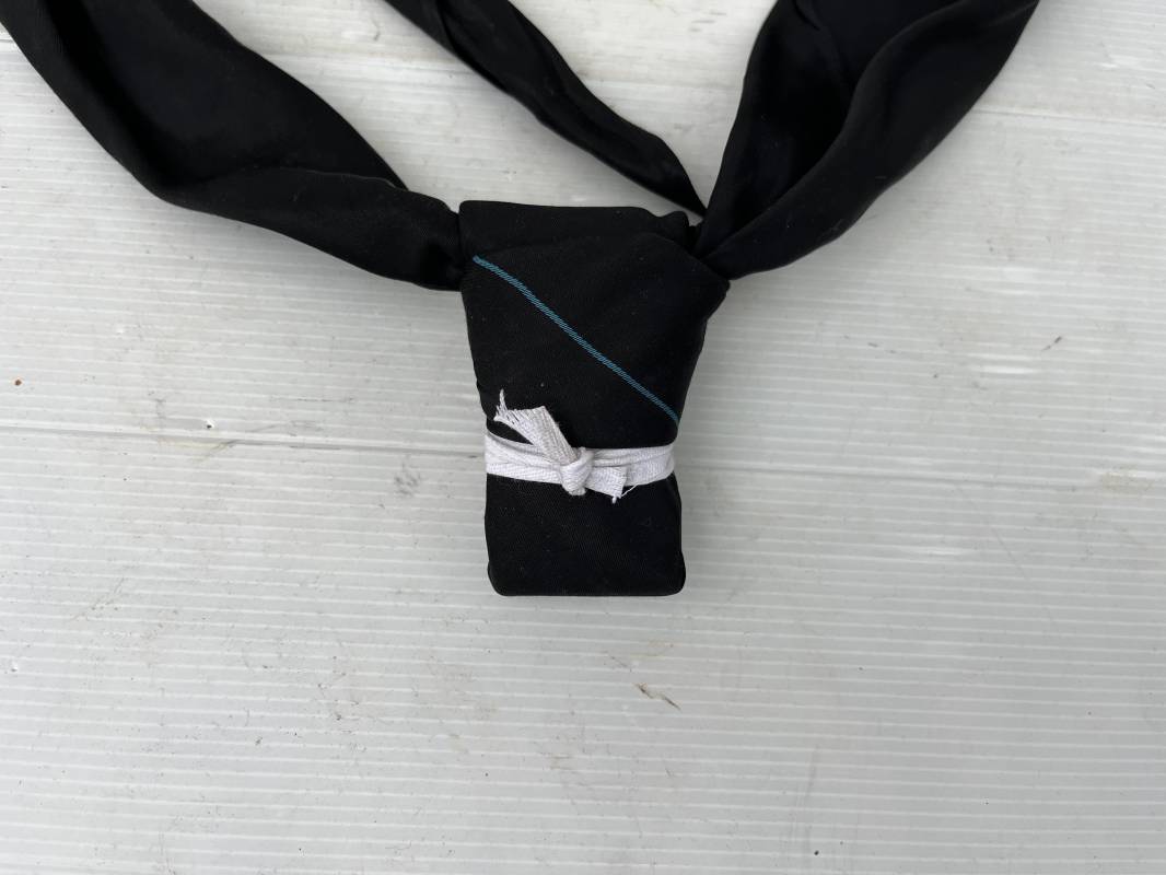 Belle cravate réglementaire d'un matelot de la Kriegsmarine. Cravate en soie noire. Noeud d'origine. Liseré oblique bleu (Nord See). Petit ruban en coton blanc. Belle cravate de dotation d'un matelot de la kriegsmarine Ref 21912