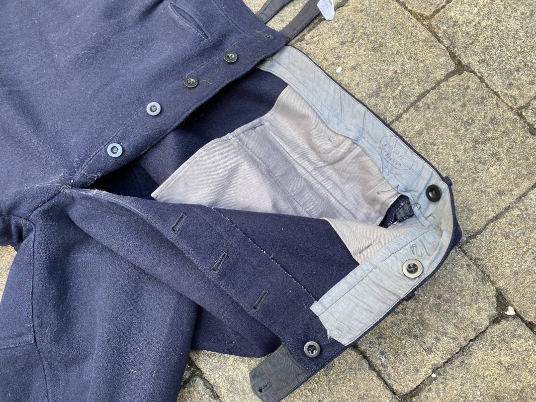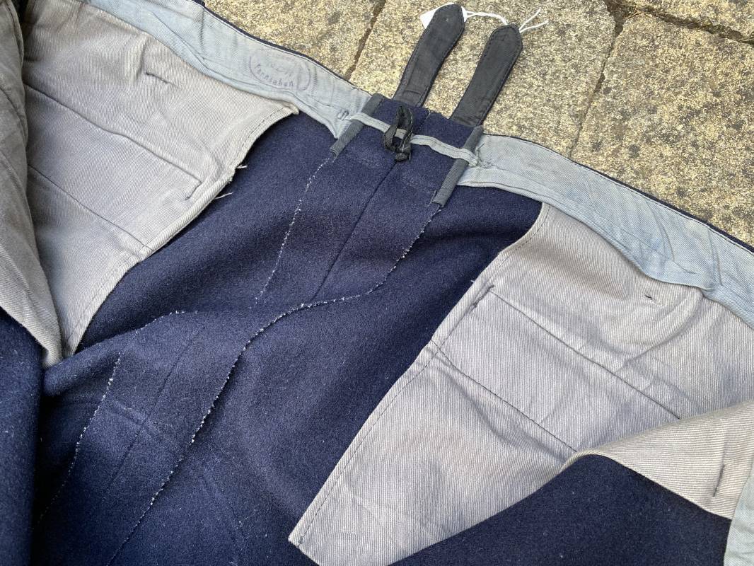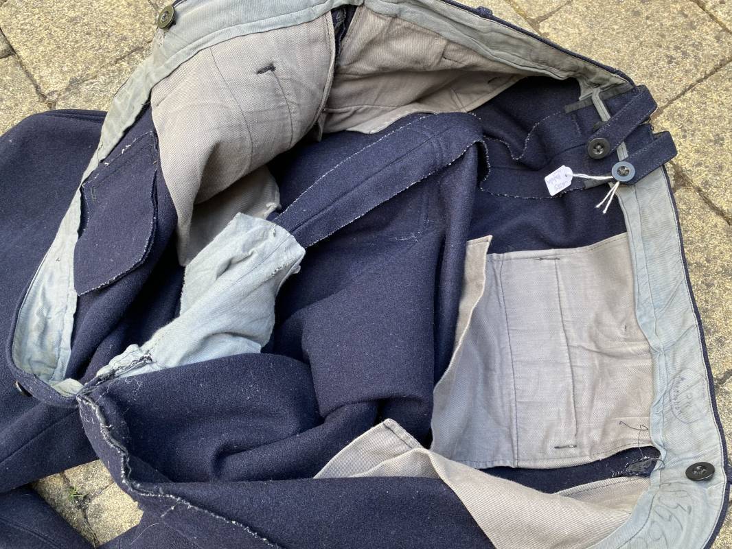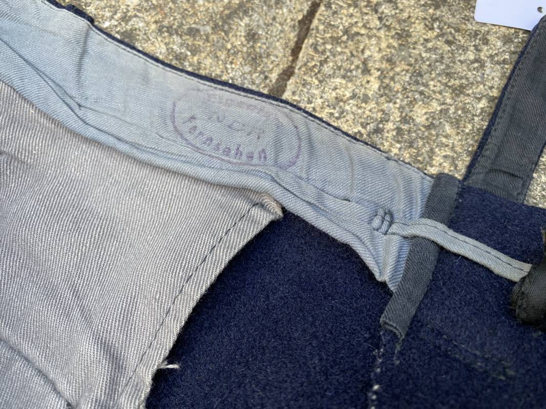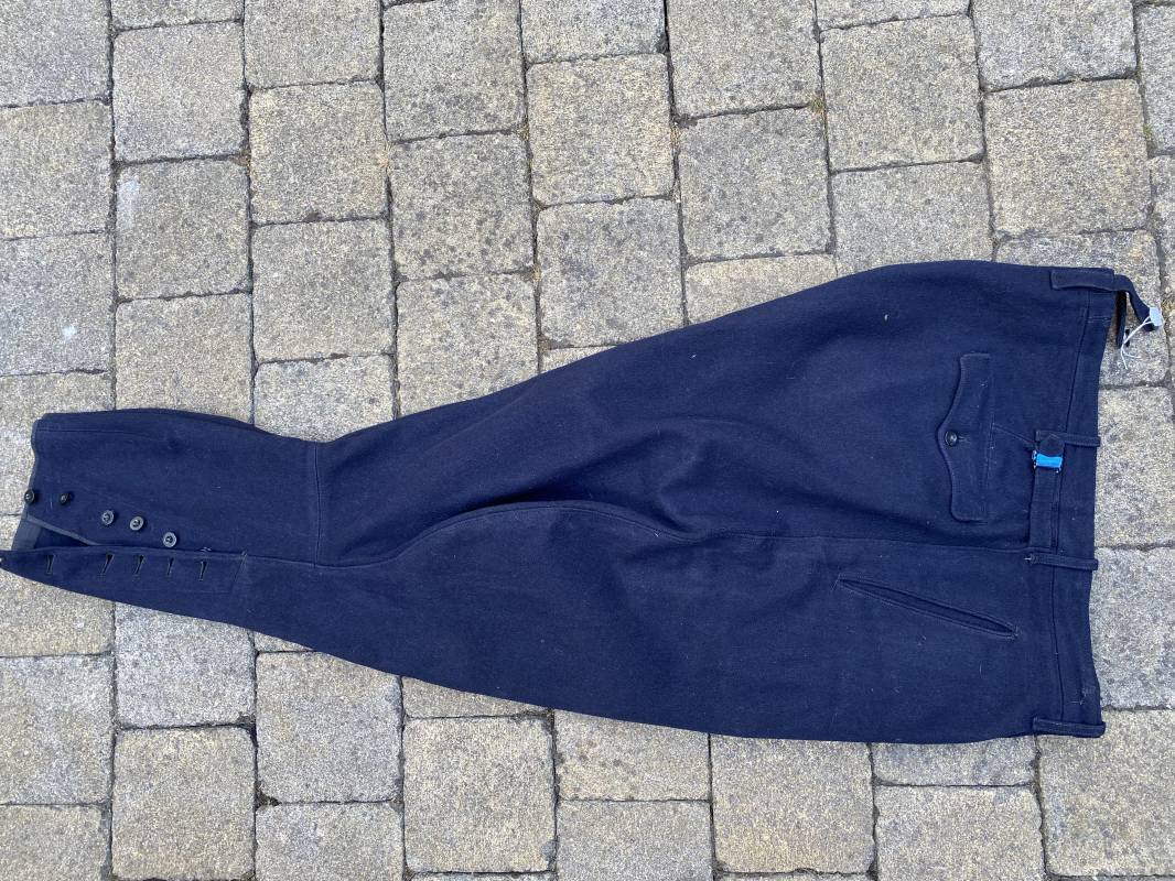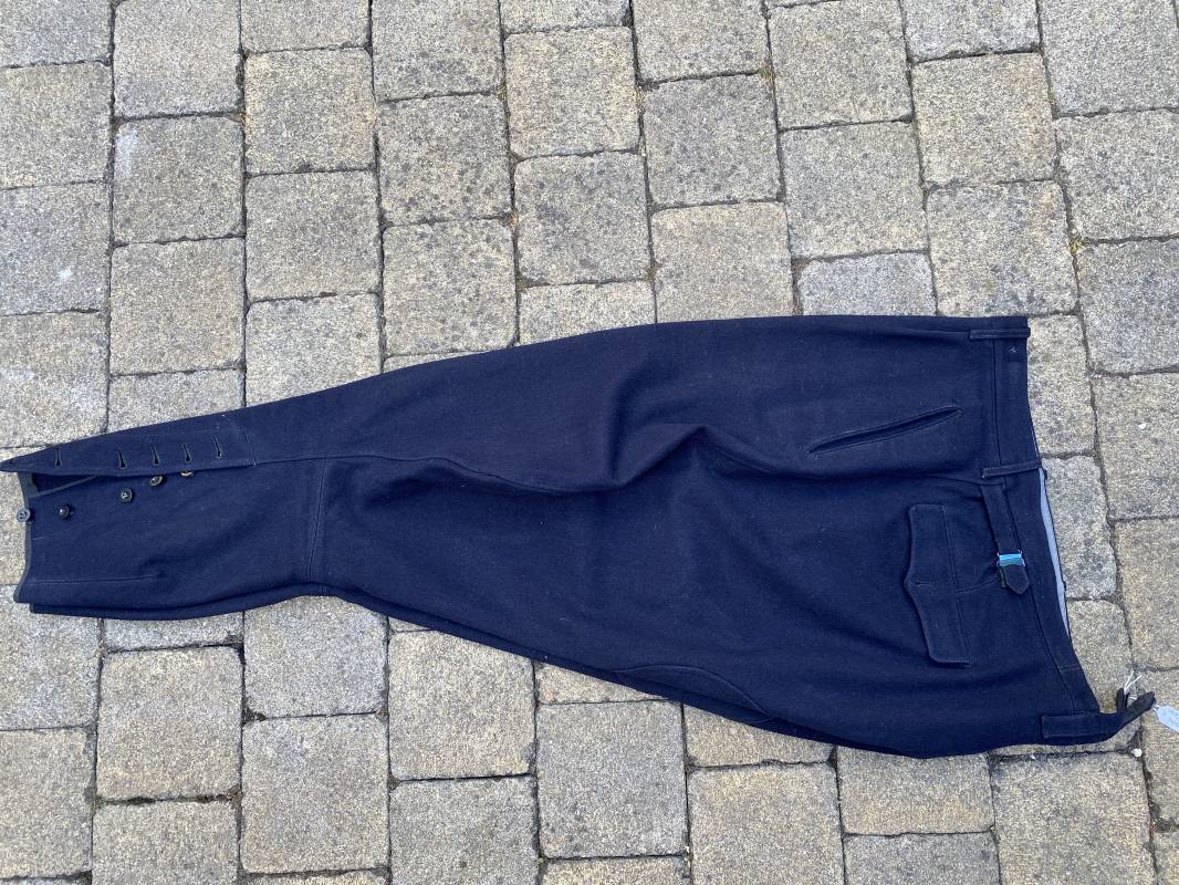 Belle culotte d'un officier de la Kriegsmarine en drap bleu nuit. Cette culotte a été retrouvée au Havre (76). 100% nature et intouchée. Culotte en drap bleu nuit. Boutons en plastique noir cousus d'origine. Pattes de serrage de taille lattérales en drap avec boucles bronzées. Passants de ceinturon en drap. Poche à gousset. Quatre poches dont deux fessières. Bas des jambes boutonnés. Intérieur doublé en coton gris. Tampon encre du fabricant Fernsahem et matricule.Taille 50 Longueur 110cm. Culotte légèrement portée en parfait état 1935/45. Ref 16585