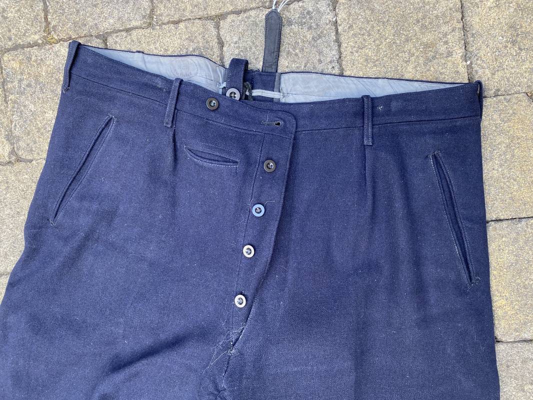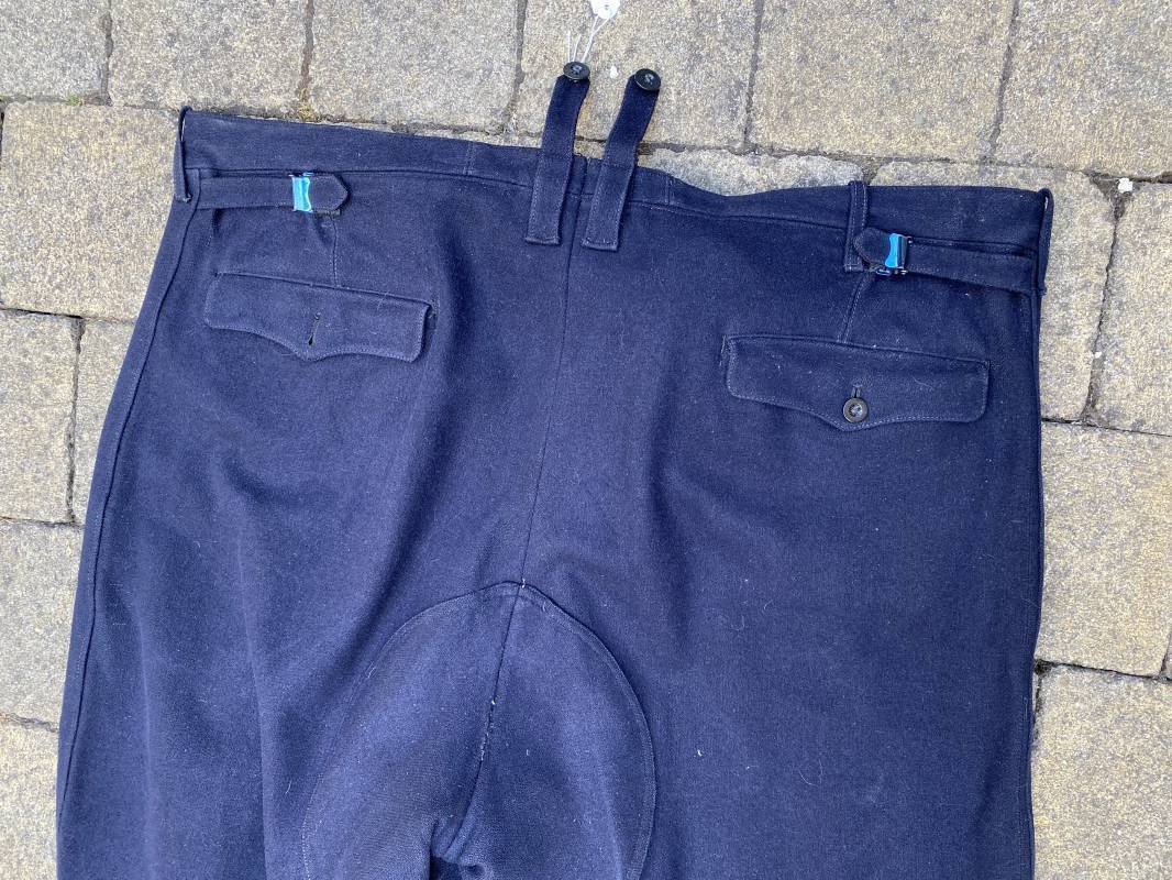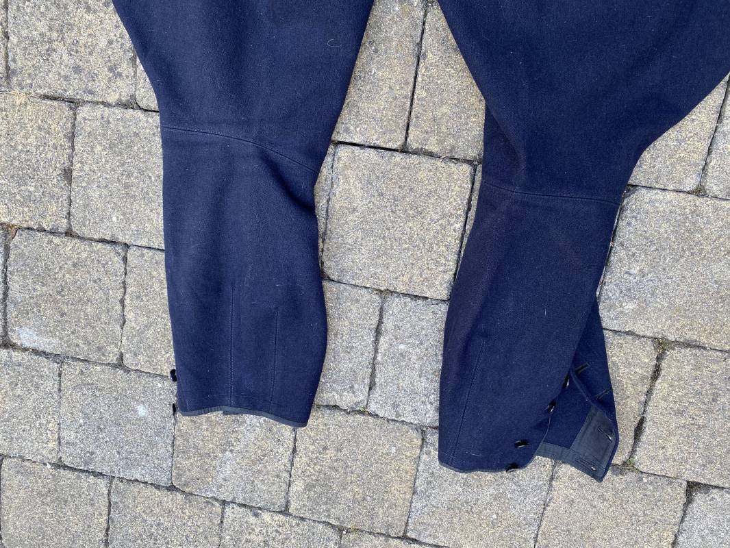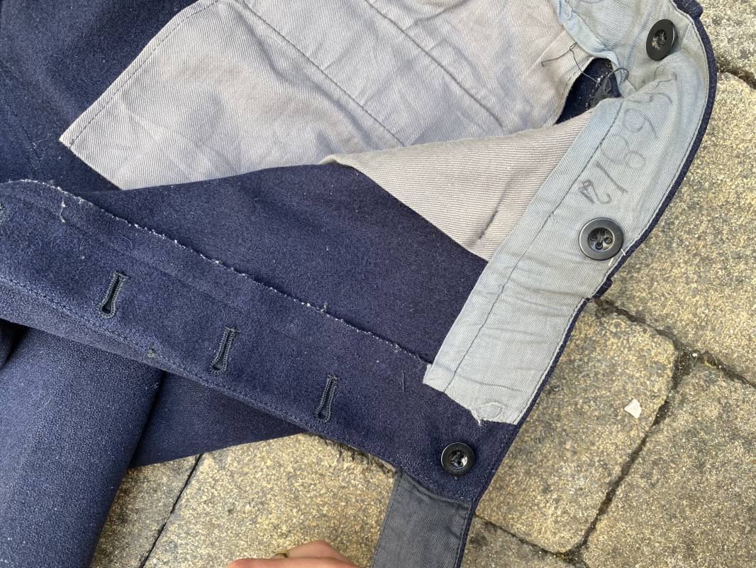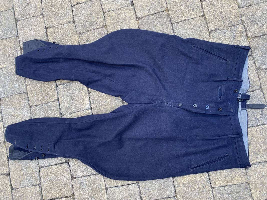 Belle culotte d'un officier de la Kriegsmarine en drap bleu nuit. Cette culotte a été retrouvée au Havre (76). 100% nature et intouchée. Culotte en drap bleu nuit. Boutons en plastique noir cousus d'origine. Pattes de serrage de taille lattérales en drap avec boucles bronzées. Passants de ceinturon en drap. Poche à gousset. Quatre poches dont deux fessières. Bas des jambes boutonnés. Intérieur doublé en coton gris. Tampon encre du fabricant Fernsahem et matricule.Taille 50 Longueur 110cm. Culotte légèrement portée en parfait état 1935/45. Ref 16585