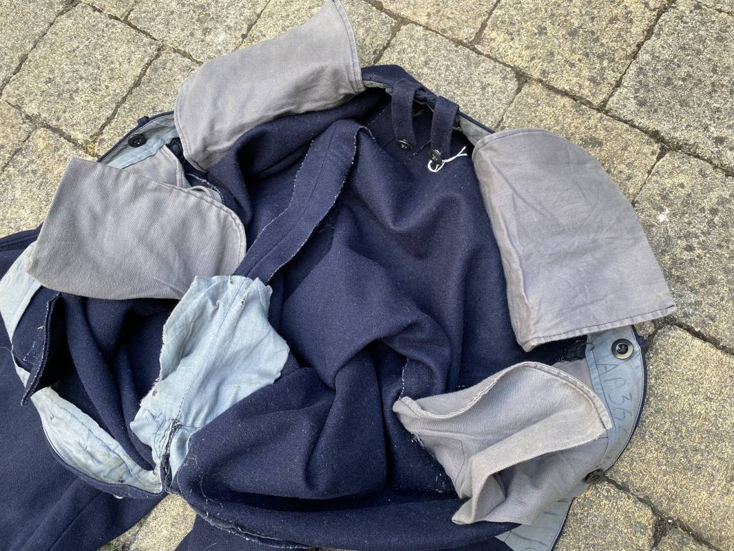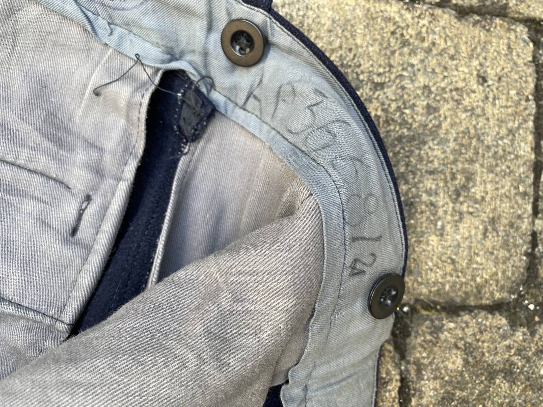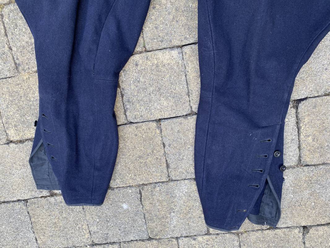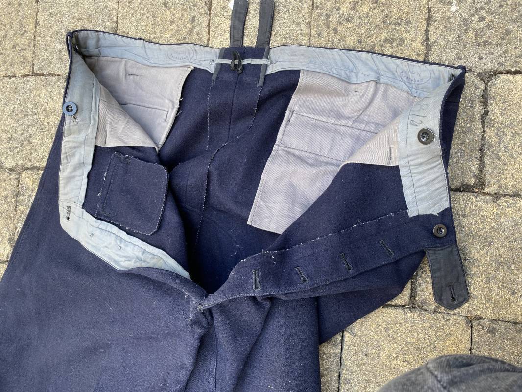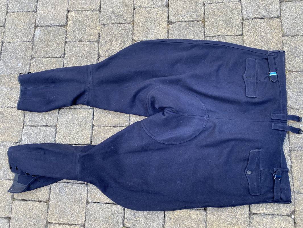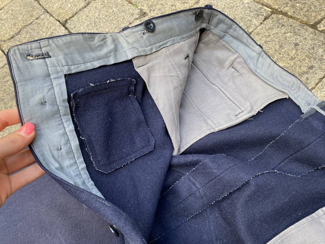 Belle culotte d'un officier de la Kriegsmarine en drap bleu nuit. Cette culotte a été retrouvée au Havre (76). 100% nature et intouchée. Culotte en drap bleu nuit. Boutons en plastique noir cousus d'origine. Pattes de serrage de taille lattérales en drap avec boucles bronzées. Passants de ceinturon en drap. Poche à gousset. Quatre poches dont deux fessières. Bas des jambes boutonnés. Intérieur doublé en coton gris. Tampon encre du fabricant Fernsahem et matricule.Taille 50 Longueur 110cm. Culotte légèrement portée en parfait état 1935/45. Ref 16585