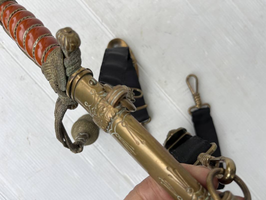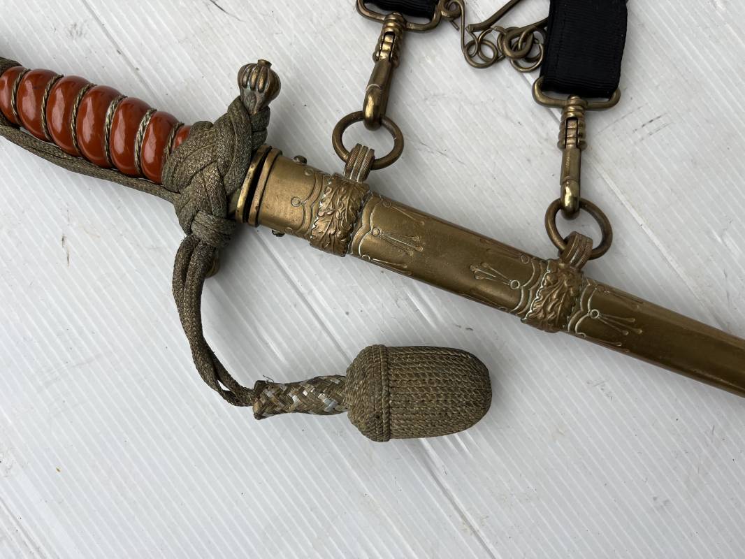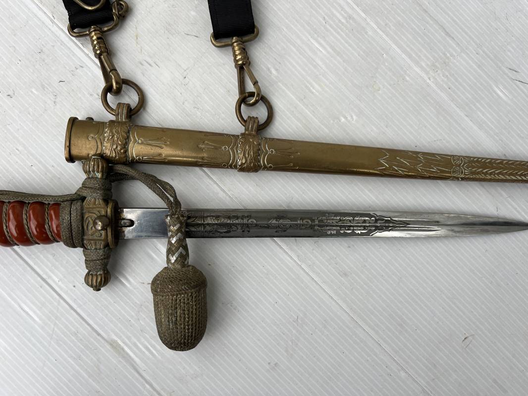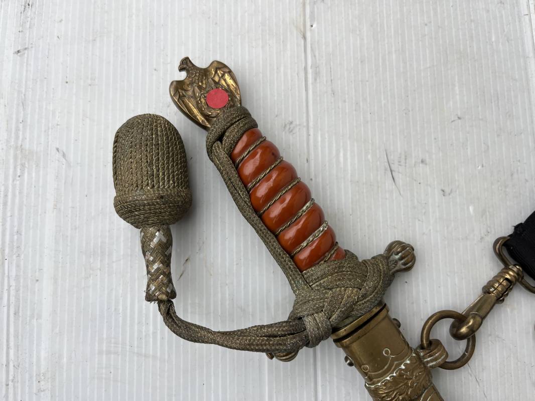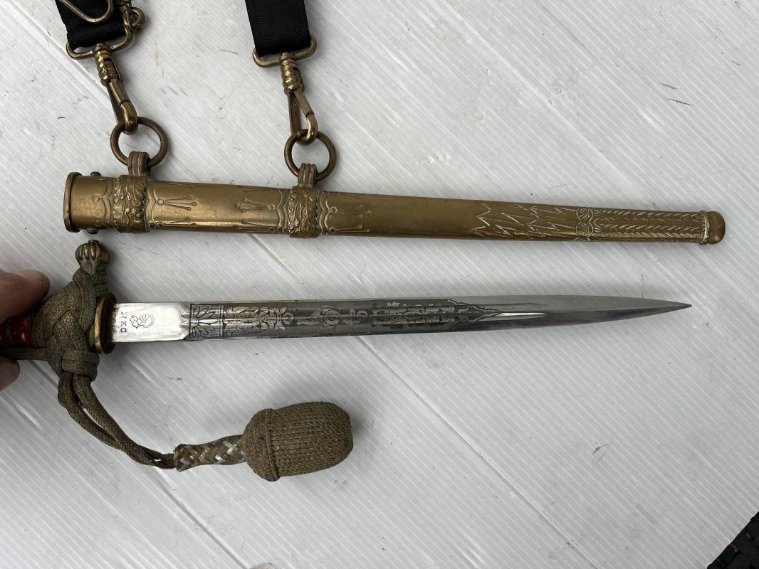 Trés belle dague modèle 1938 d'un officier de la Kriesgmarine avec dragonne et bélières . Fabricant WKC à Solingen . Marquage sur lame du célèbre fabricant . Poignée orangée , filigrane en métal doré . Pommeau avec aigle KM. Garde stylisée avec ancre. Petit bouton poussoir . Belle lame gravée double faces. Motifs à 'ancres et dauphins' . Fourreau en métal doré. Motifs 'éclairs'. Deux anneaux de fixation pour bélières . Fourreau sans choc. Belle dorure d'origine sur l'ensemble de la dague. Dragonne et gland en fil d'aluminium doré . Bélières modéle 1938 en coton satiné noir , revers en velours noir . Modéle dit ' lourd' avec boucleries en métal doré . Crochets à ressorts . Chainette et crochet de fixation dite haute . Bel ensemble légèrement utilisé en parfait état. Très belle dague d'un officier de la Kriegsmarine 1939/45. Ref 21930