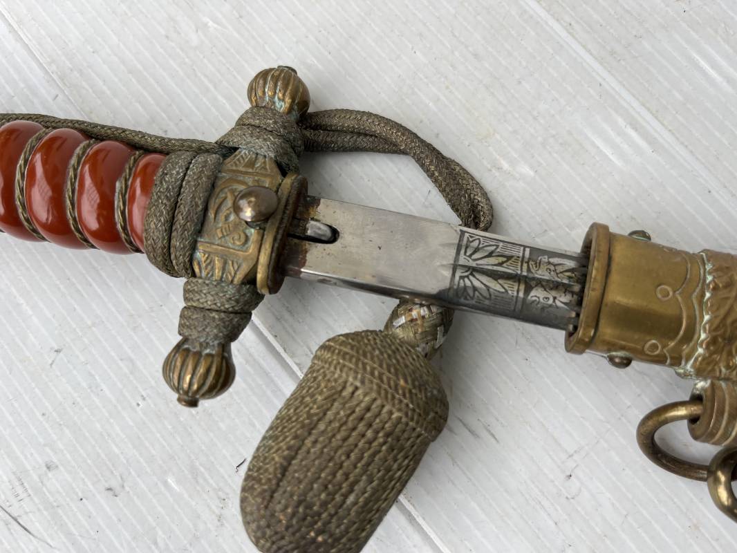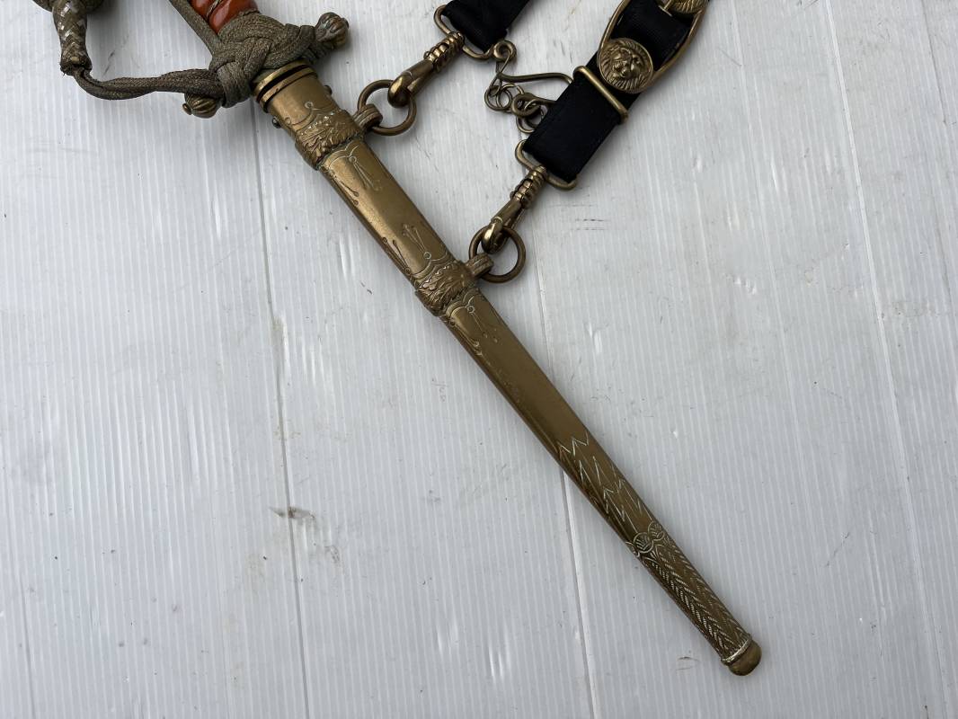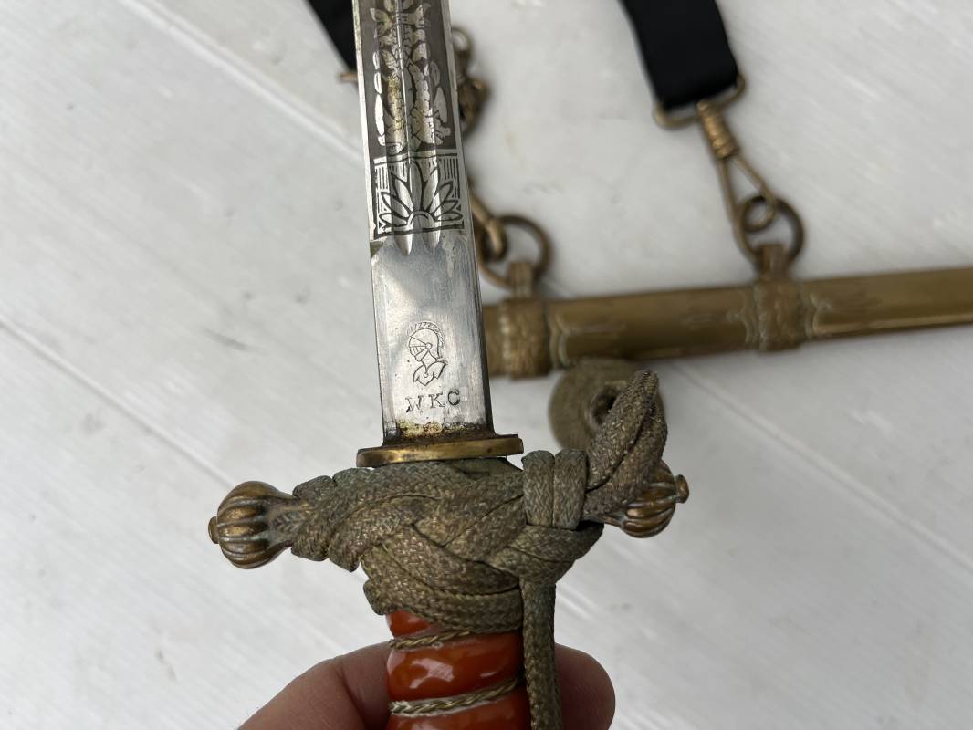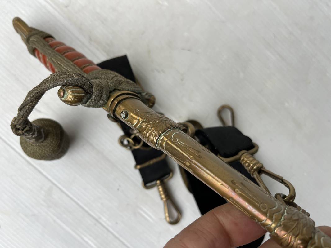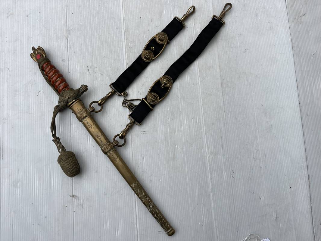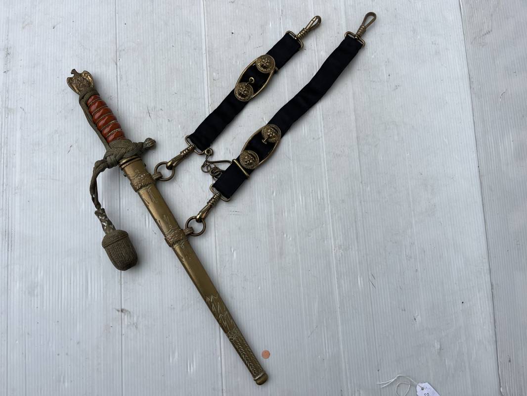 Trés belle dague modèle 1938 d'un officier de la Kriesgmarine avec dragonne et bélières . Fabricant WKC à Solingen . Marquage sur lame du célèbre fabricant . Poignée orangée , filigrane en métal doré . Pommeau avec aigle KM. Garde stylisée avec ancre. Petit bouton poussoir . Belle lame gravée double faces. Motifs à 'ancres et dauphins' . Fourreau en métal doré. Motifs 'éclairs'. Deux anneaux de fixation pour bélières . Fourreau sans choc. Belle dorure d'origine sur l'ensemble de la dague. Dragonne et gland en fil d'aluminium doré . Bélières modéle 1938 en coton satiné noir , revers en velours noir . Modéle dit ' lourd' avec boucleries en métal doré . Crochets à ressorts . Chainette et crochet de fixation dite haute . Bel ensemble légèrement utilisé en parfait état. Très belle dague d'un officier de la Kriegsmarine 1939/45. Ref 21930