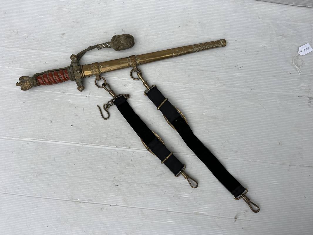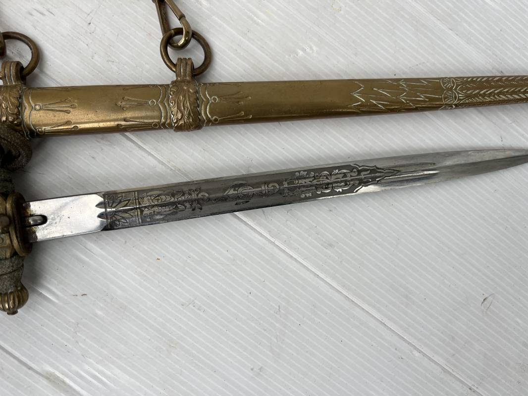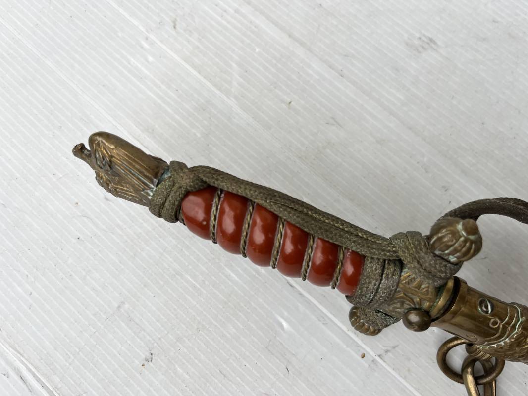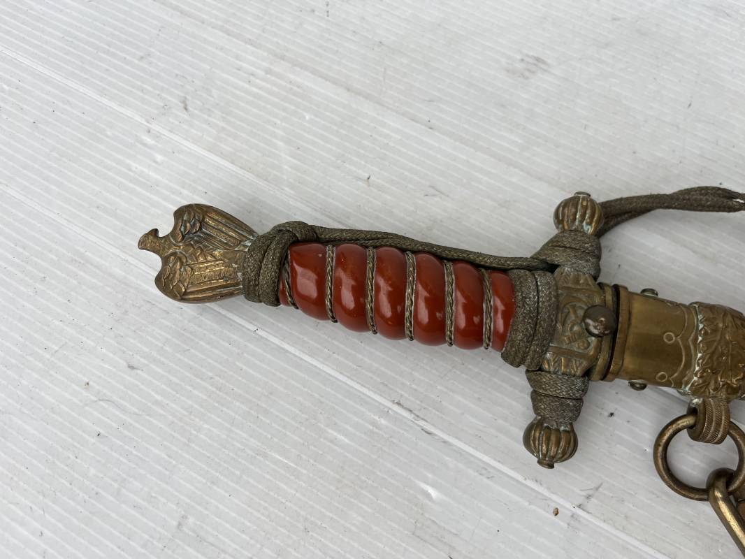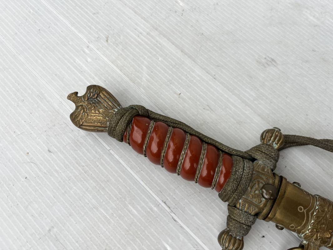 Trés belle dague modèle 1938 d'un officier de la Kriesgmarine avec dragonne et bélières . Fabricant WKC à Solingen . Marquage sur lame du célèbre fabricant . Poignée orangée , filigrane en métal doré . Pommeau avec aigle KM. Garde stylisée avec ancre. Petit bouton poussoir . Belle lame gravée double faces. Motifs à 'ancres et dauphins' . Fourreau en métal doré. Motifs 'éclairs'. Deux anneaux de fixation pour bélières . Fourreau sans choc. Belle dorure d'origine sur l'ensemble de la dague. Dragonne et gland en fil d'aluminium doré . Bélières modéle 1938 en coton satiné noir , revers en velours noir . Modéle dit ' lourd' avec boucleries en métal doré . Crochets à ressorts . Chainette et crochet de fixation dite haute . Bel ensemble légèrement utilisé en parfait état. Très belle dague d'un officier de la Kriegsmarine 1939/45. Ref 21930