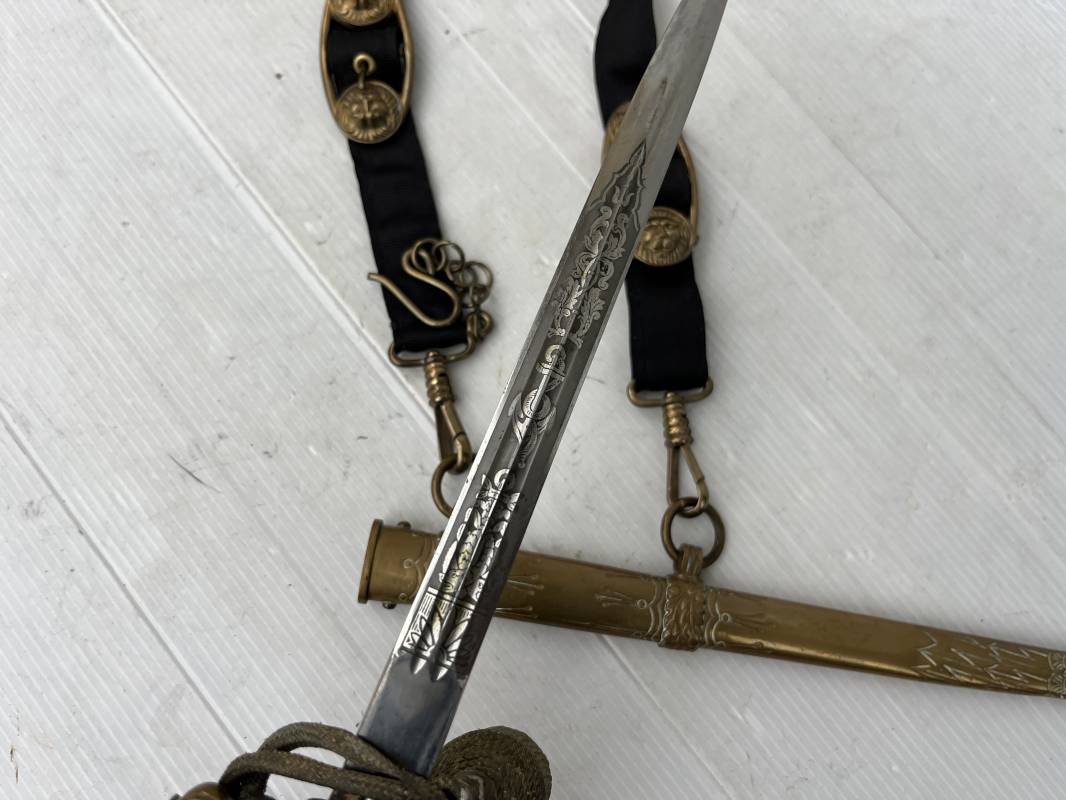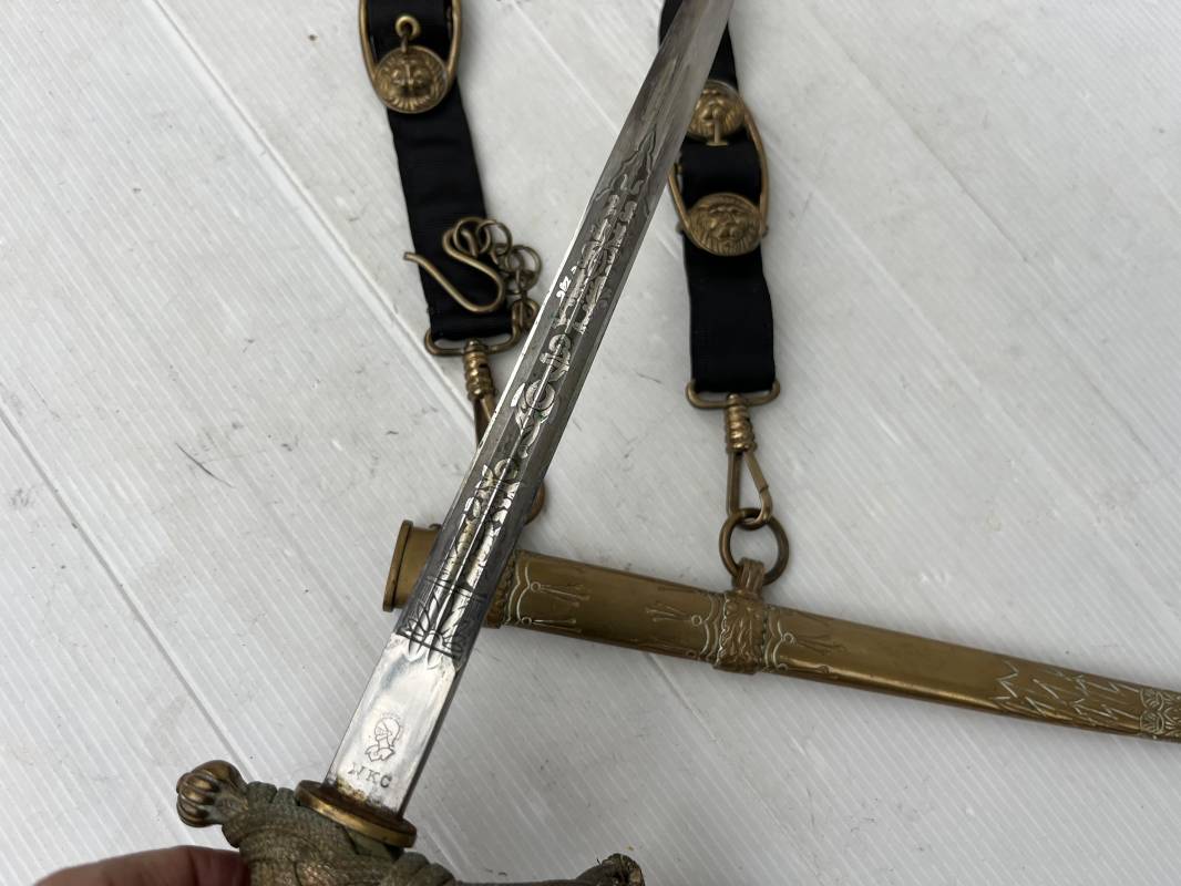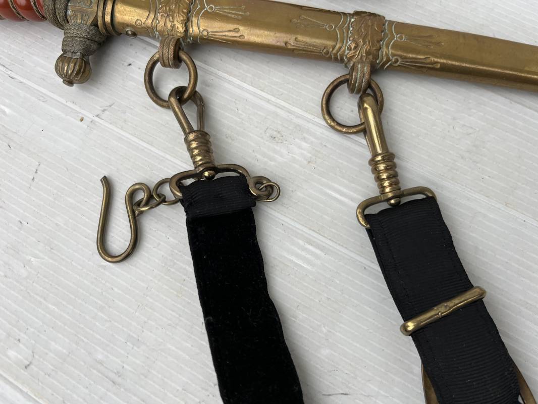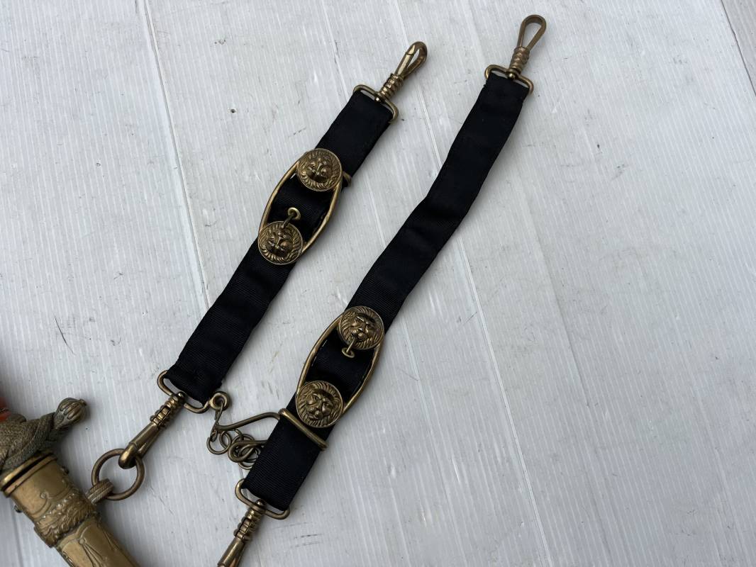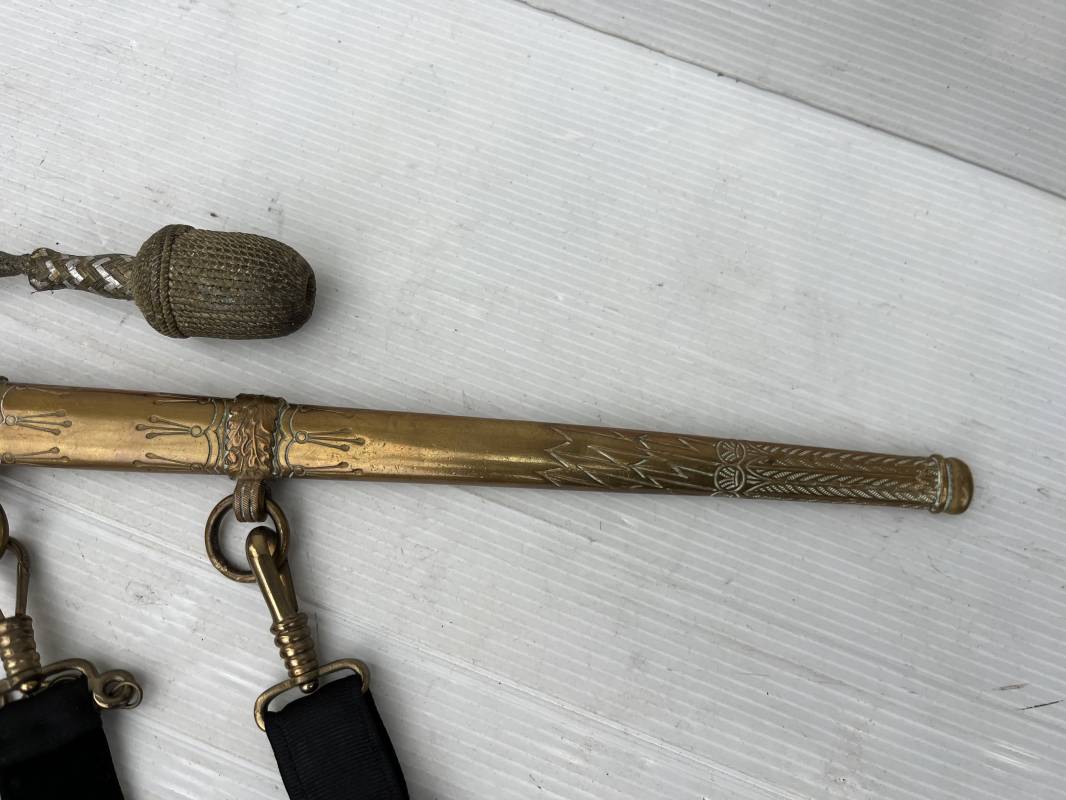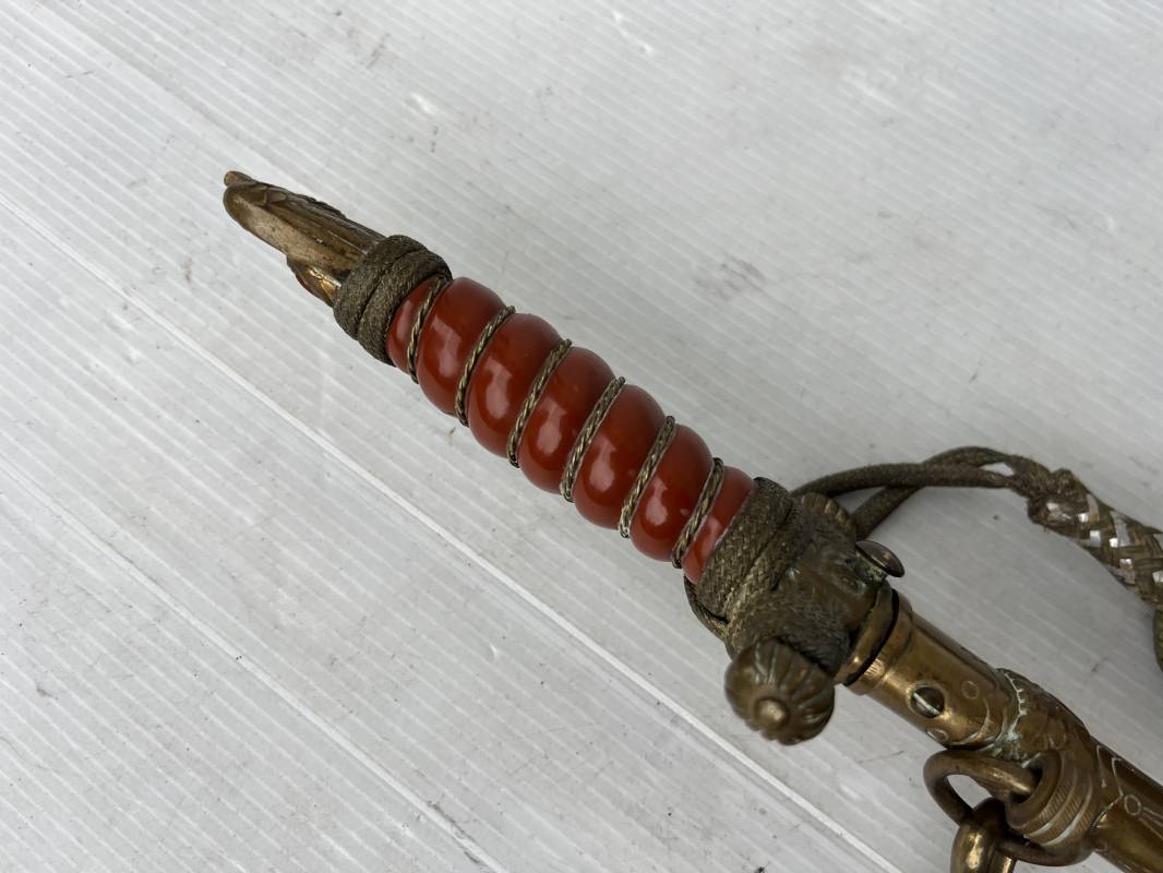 Trés belle dague modèle 1938 d'un officier de la Kriesgmarine avec dragonne et bélières . Fabricant WKC à Solingen . Marquage sur lame du célèbre fabricant . Poignée orangée , filigrane en métal doré . Pommeau avec aigle KM. Garde stylisée avec ancre. Petit bouton poussoir . Belle lame gravée double faces. Motifs à 'ancres et dauphins' . Fourreau en métal doré. Motifs 'éclairs'. Deux anneaux de fixation pour bélières . Fourreau sans choc. Belle dorure d'origine sur l'ensemble de la dague. Dragonne et gland en fil d'aluminium doré . Bélières modéle 1938 en coton satiné noir , revers en velours noir . Modéle dit ' lourd' avec boucleries en métal doré . Crochets à ressorts . Chainette et crochet de fixation dite haute . Bel ensemble légèrement utilisé en parfait état. Très belle dague d'un officier de la Kriegsmarine 1939/45. Ref 21930