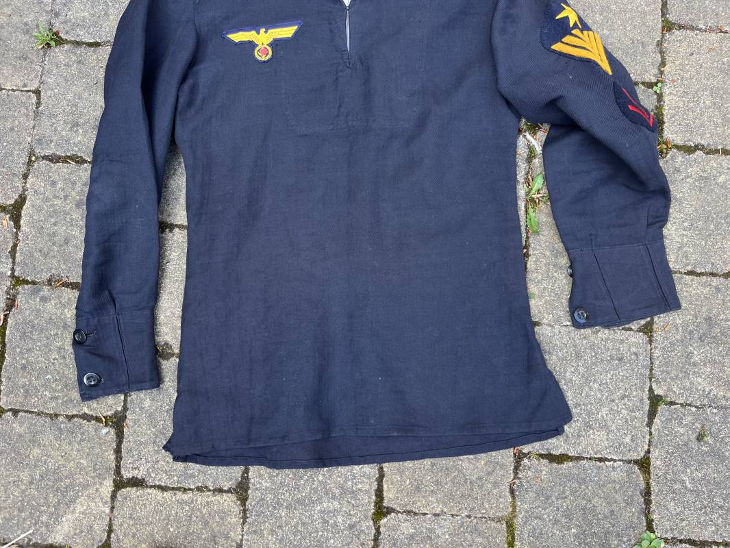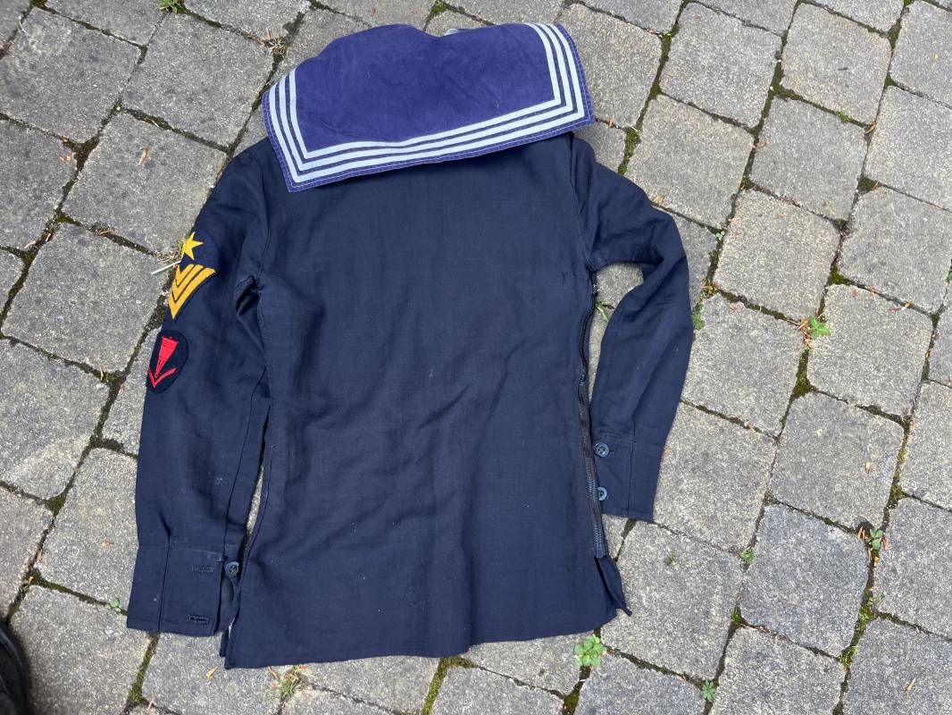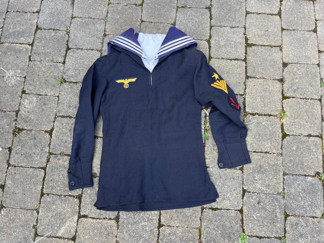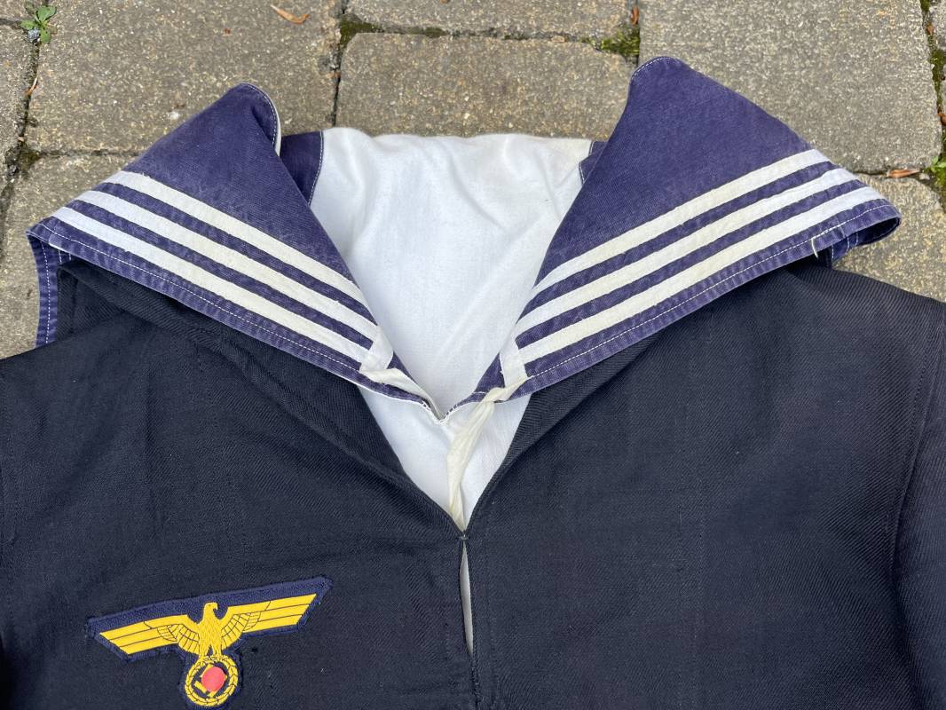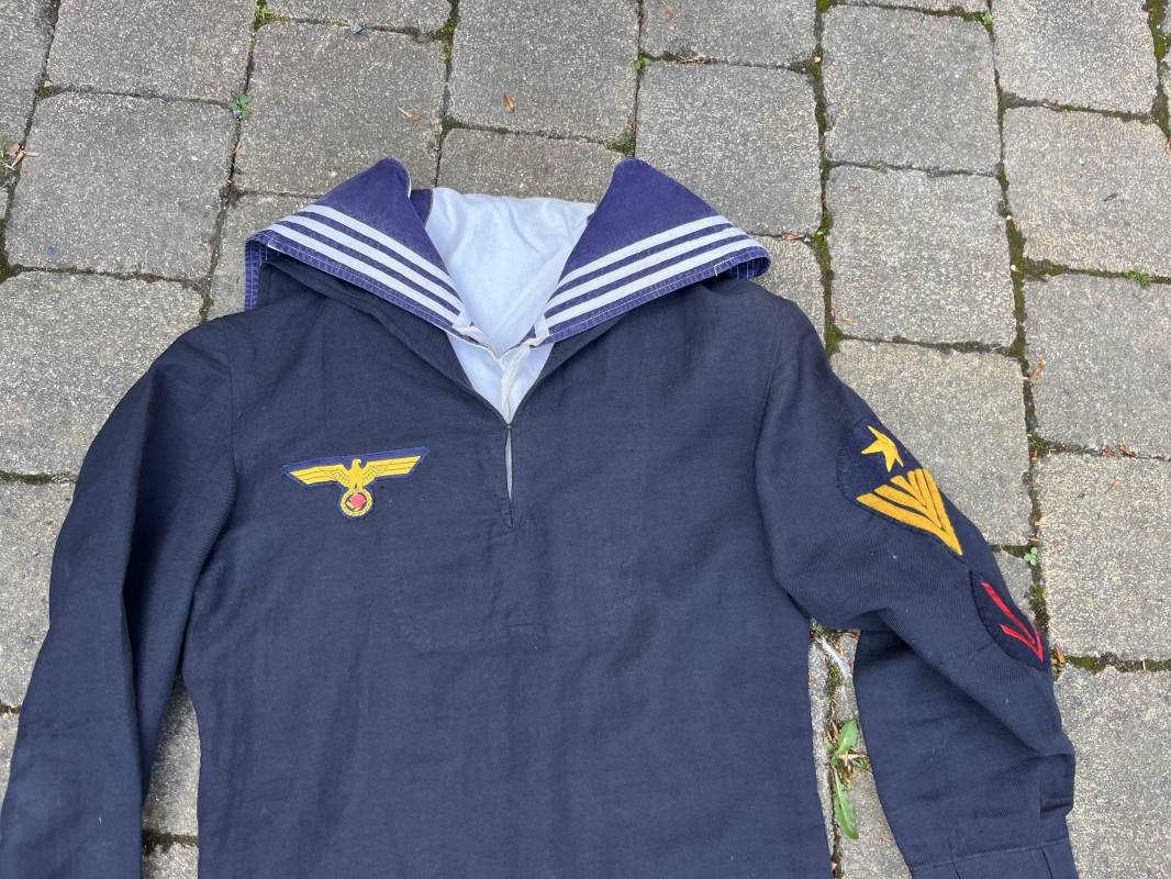 Très belle marinière et son grands col réglementaires d'un matelot de la Kriegsmarine. Marinière en laine bleu nuit, large col. Aigle de poitrine troupe tissé bévo. Aigle monté mains . Insigne de manche de spécialité d'Acousticien embarqué et grade de manche de quartier maitre ( matrosenoberstabsgefreiter) . Boutons en plastique noir cousus d origine en bouts de manches. Glissière latérale montée d origine en plastique fonctionnelle fabricant ZIPP . Moninette du matelot cousue sur la marinière avec matricule Kiel 1940 .Grand col de dotation en coton blanc et bleu nuit , lacets en coton de fixation . Marinière et grand col légèrement portée en parfait état. Largeur d'épaules 40cm. Longueur 68cm. Manches 57 cm 1940/45. Ref 21164