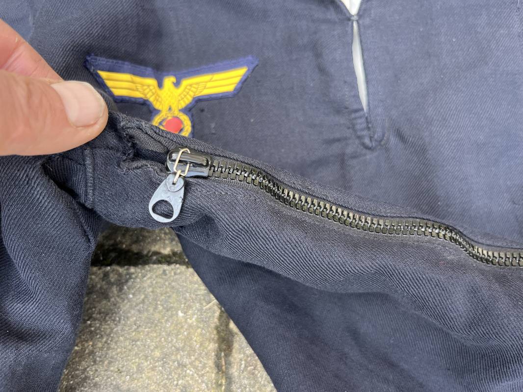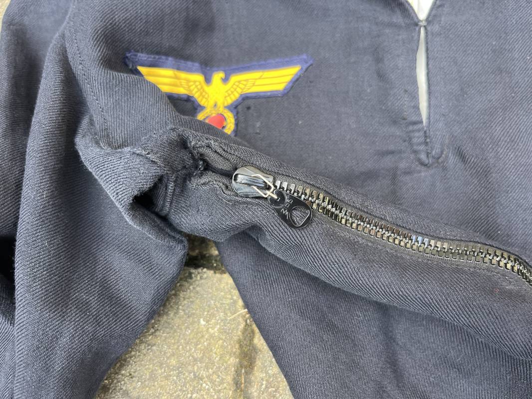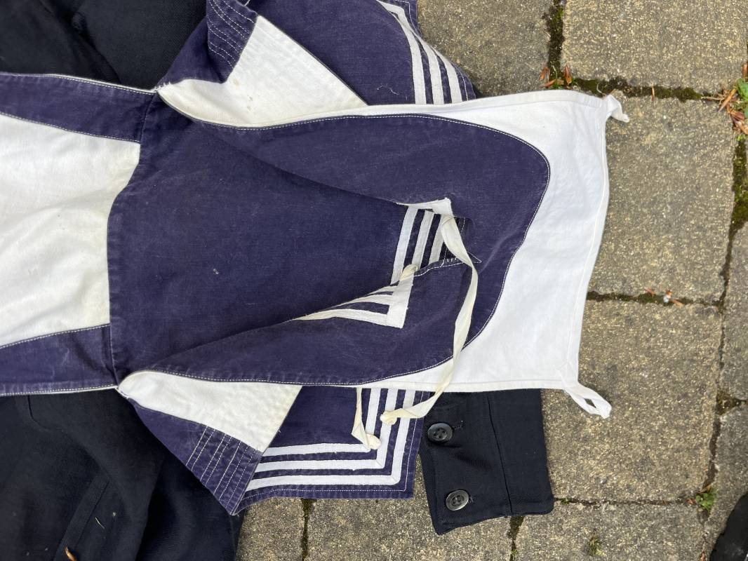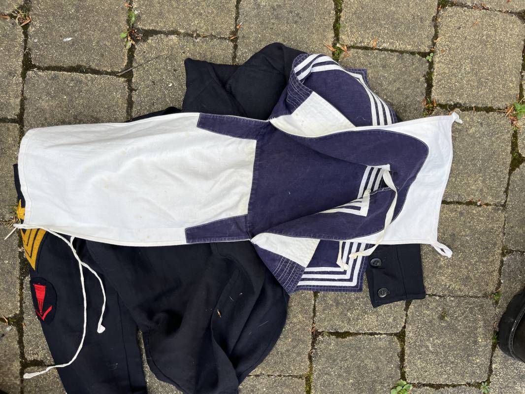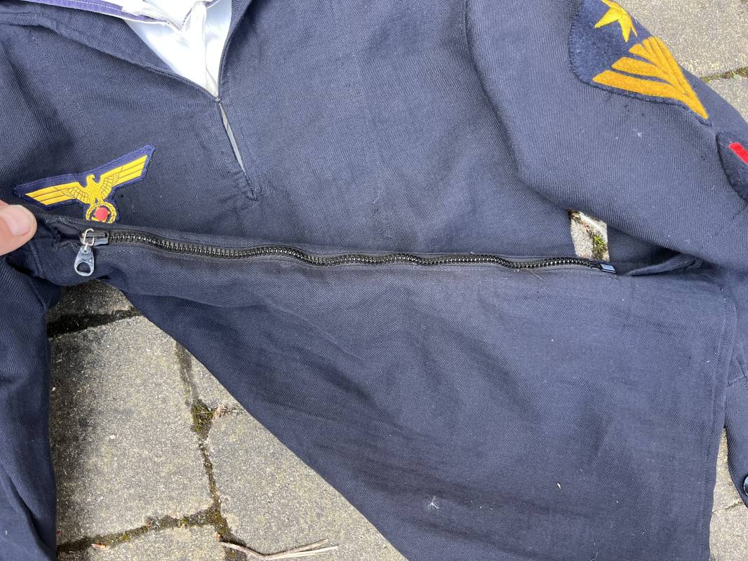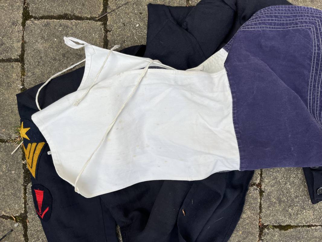 Très belle marinière et son grands col réglementaires d'un matelot de la Kriegsmarine. Marinière en laine bleu nuit, large col. Aigle de poitrine troupe tissé bévo. Aigle monté mains . Insigne de manche de spécialité d'Acousticien embarqué et grade de manche de quartier maitre ( matrosenoberstabsgefreiter) . Boutons en plastique noir cousus d origine en bouts de manches. Glissière latérale montée d origine en plastique fonctionnelle fabricant ZIPP . Moninette du matelot cousue sur la marinière avec matricule Kiel 1940 .Grand col de dotation en coton blanc et bleu nuit , lacets en coton de fixation . Marinière et grand col légèrement portée en parfait état. Largeur d'épaules 40cm. Longueur 68cm. Manches 57 cm 1940/45. Ref 21164