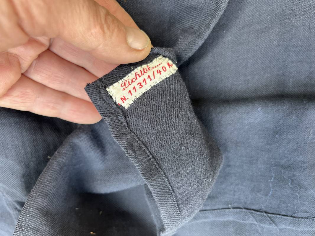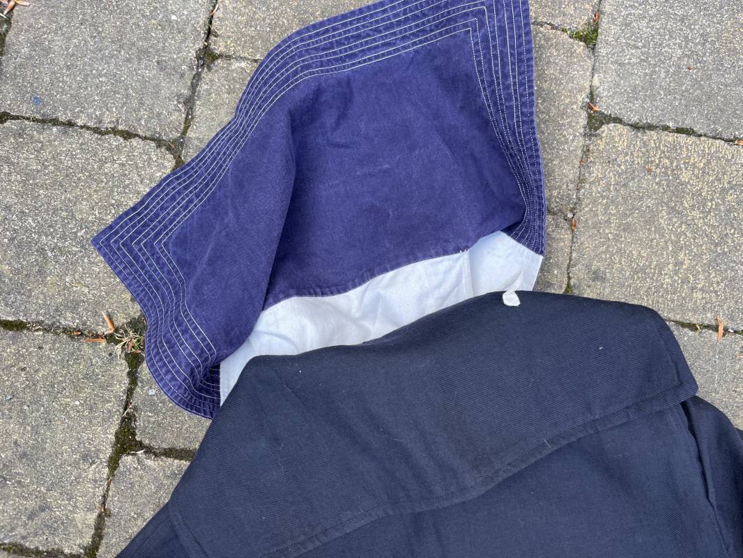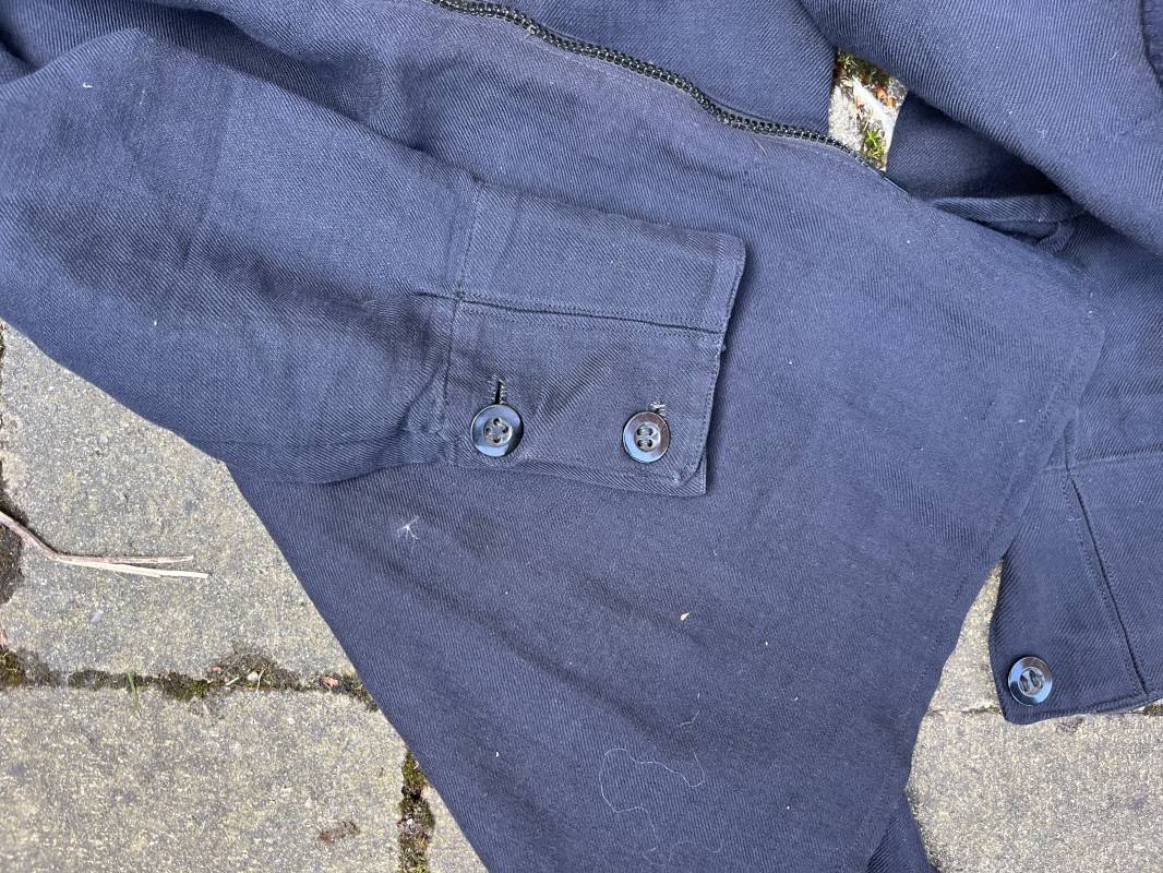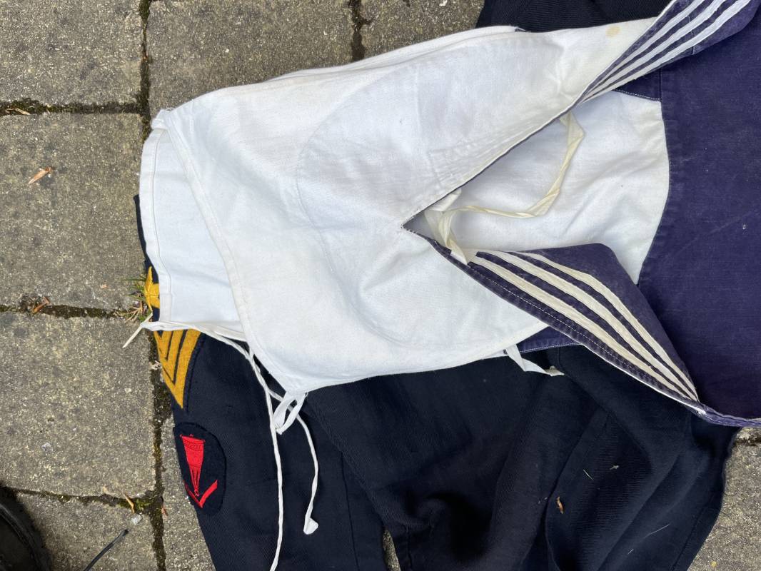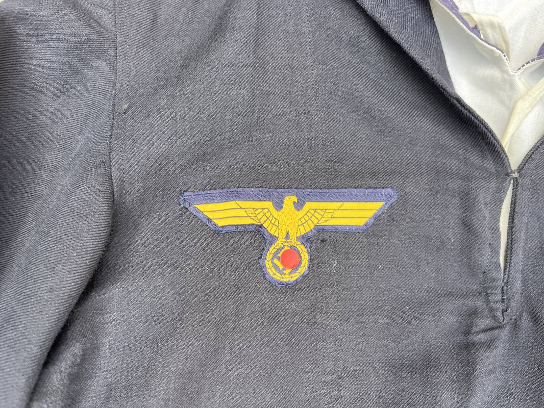 Très belle marinière et son grands col réglementaires d'un matelot de la Kriegsmarine. Marinière en laine bleu nuit, large col. Aigle de poitrine troupe tissé bévo. Aigle monté mains . Insigne de manche de spécialité d'Acousticien embarqué et grade de manche de quartier maitre ( matrosenoberstabsgefreiter) . Boutons en plastique noir cousus d origine en bouts de manches. Glissière latérale montée d origine en plastique fonctionnelle fabricant ZIPP . Moninette du matelot cousue sur la marinière avec matricule Kiel 1940 .Grand col de dotation en coton blanc et bleu nuit , lacets en coton de fixation . Marinière et grand col légèrement portée en parfait état. Largeur d'épaules 40cm. Longueur 68cm. Manches 57 cm 1940/45. Ref 21164