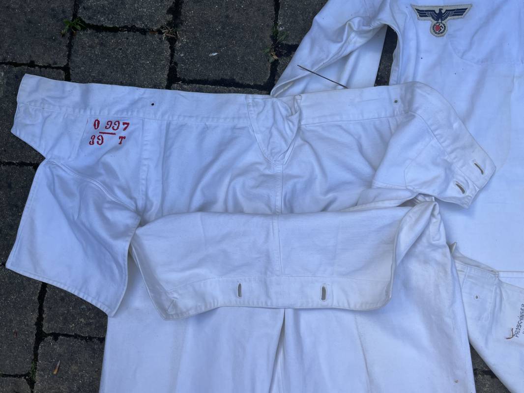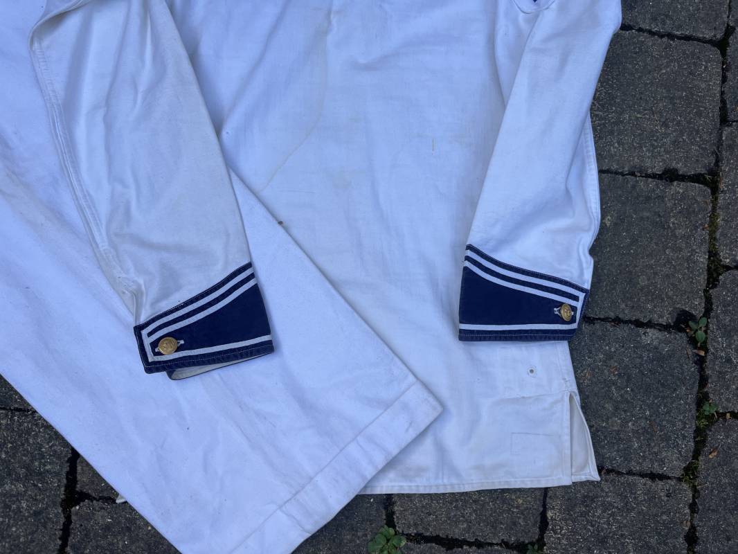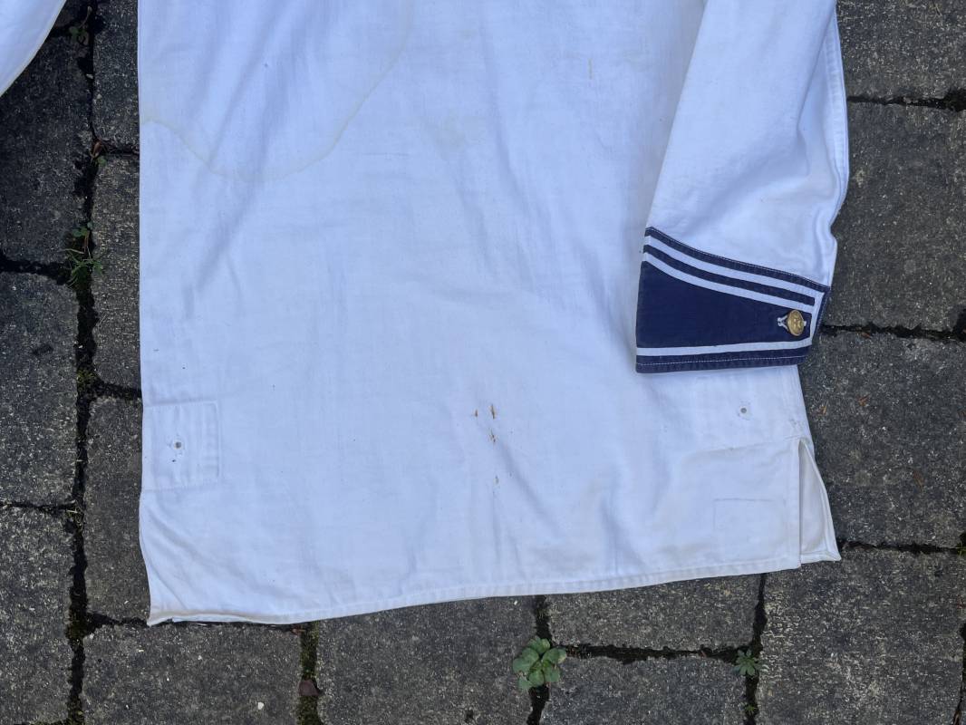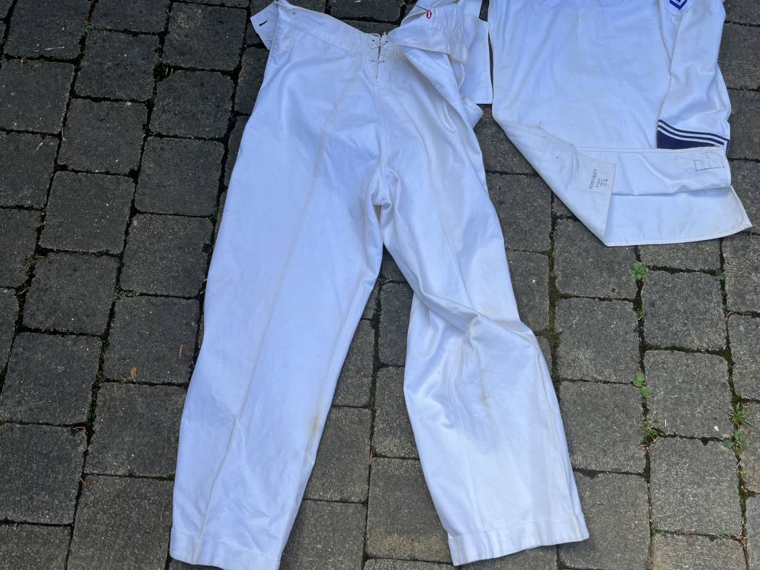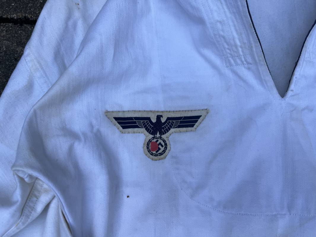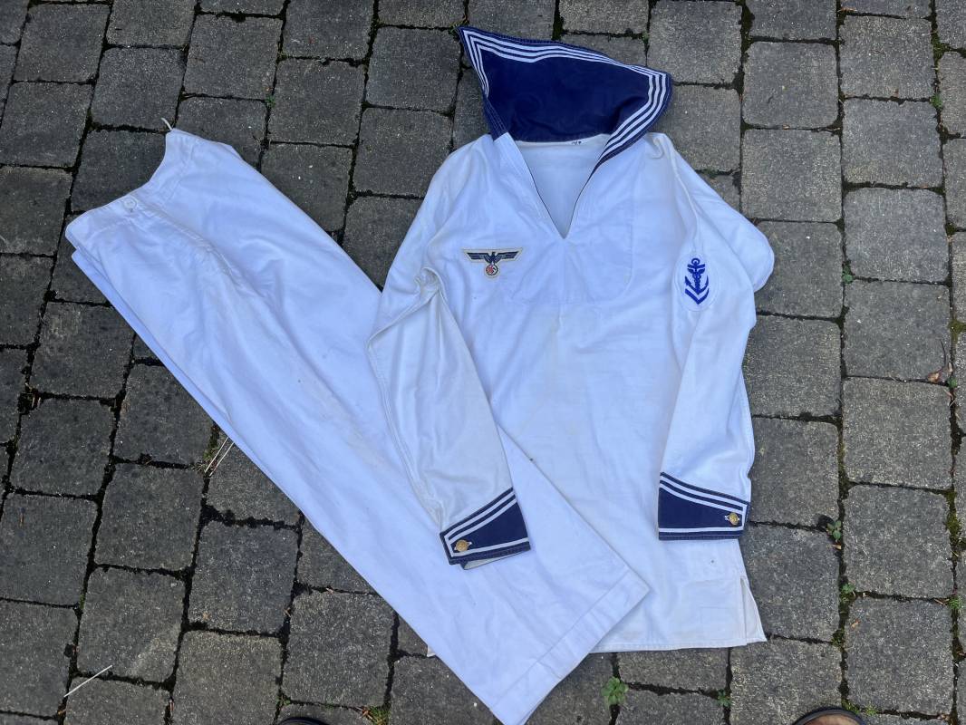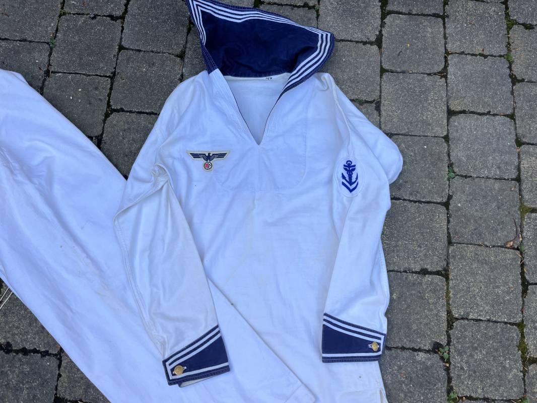 Bel ensemble d un sous officier ( Obermaat ) infirmier de la Kriegsmarine . Marinière et pantalon réglementaires en toile de coton blanc . Cet ensemble a appartenu au mème homme . Marinière de dotation en coton blanc , grand col bleu nuit , lacet coton blanc pour le port de la cravate , aigle de poitrine tissé bevo sur fond blanc monté mains , insigne de manche d infirmier sous officier au grade d obermaat . Tampon encre noir BAK 1938 . Marquage manuscris ; matricule et nom du matelot 'Proschinger 1939' . Deux petits boutons dorés à ancre amovibles en bas de manche . Largeur épaules40 cm longueur 76 cm manche 58 cm . Pantalon à pont de dotation en coton blanc , deux poches , boutons blanc cousus d origine . Lacet coton de serrage de taille sur le derrière Matricule et date ( 1939 ) brodés en fil de coton rouge . Taille 38 Longueur 98 cm Bel ensemble légérement porté en bel état 1939/45 Ref 22010