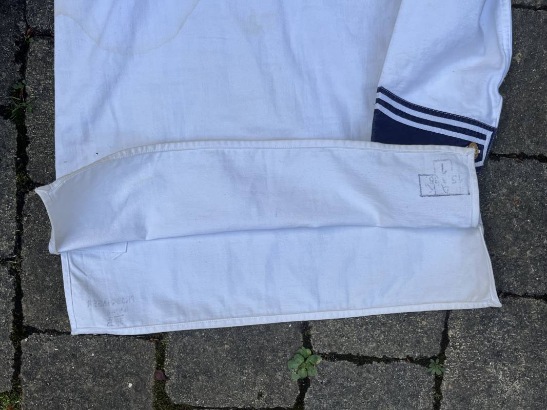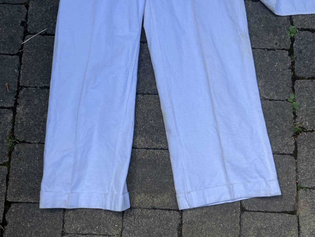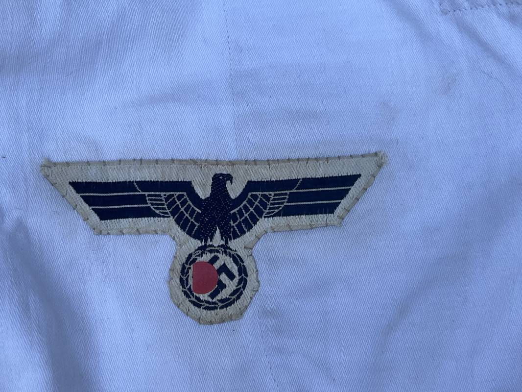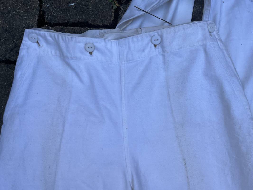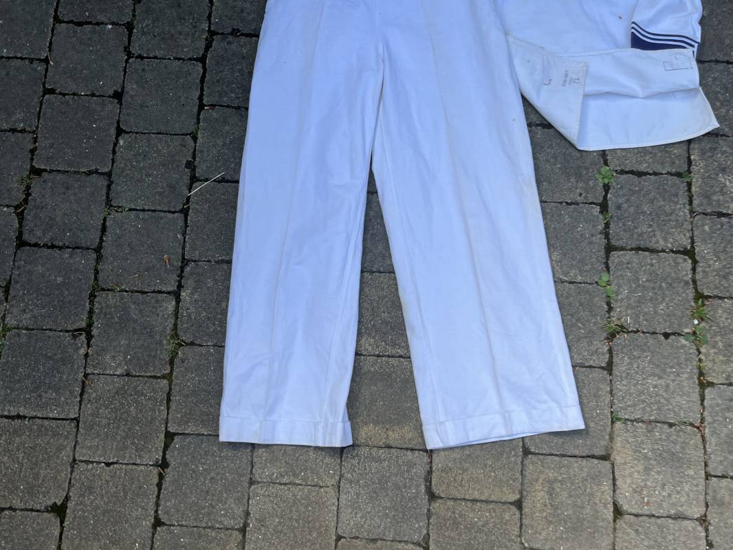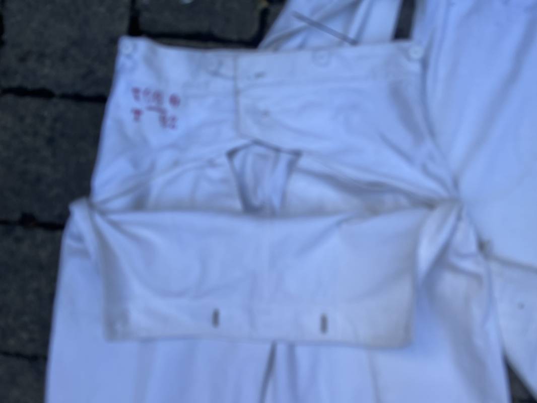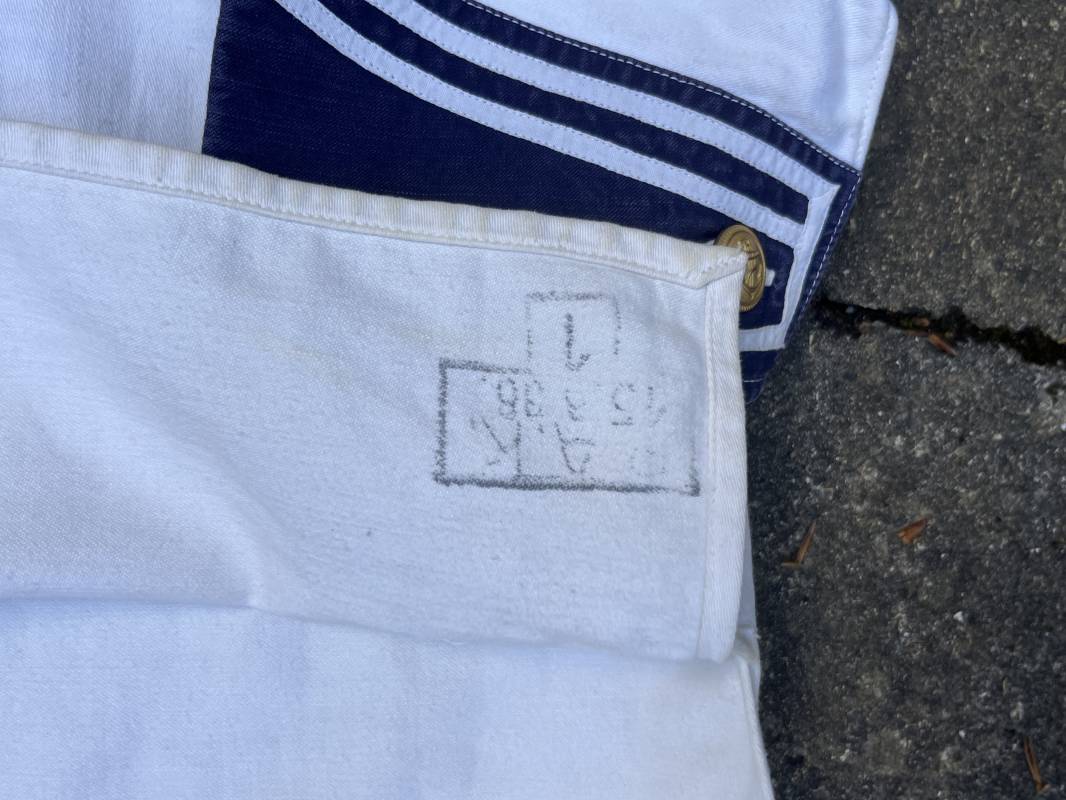 Bel ensemble d un sous officier ( Obermaat ) infirmier de la Kriegsmarine . Marinière et pantalon réglementaires en toile de coton blanc . Cet ensemble a appartenu au mème homme . Marinière de dotation en coton blanc , grand col bleu nuit , lacet coton blanc pour le port de la cravate , aigle de poitrine tissé bevo sur fond blanc monté mains , insigne de manche d infirmier sous officier au grade d obermaat . Tampon encre noir BAK 1938 . Marquage manuscris ; matricule et nom du matelot 'Proschinger 1939' . Deux petits boutons dorés à ancre amovibles en bas de manche . Largeur épaules40 cm longueur 76 cm manche 58 cm . Pantalon à pont de dotation en coton blanc , deux poches , boutons blanc cousus d origine . Lacet coton de serrage de taille sur le derrière Matricule et date ( 1939 ) brodés en fil de coton rouge . Taille 38 Longueur 98 cm Bel ensemble légérement porté en bel état 1939/45 Ref 22010