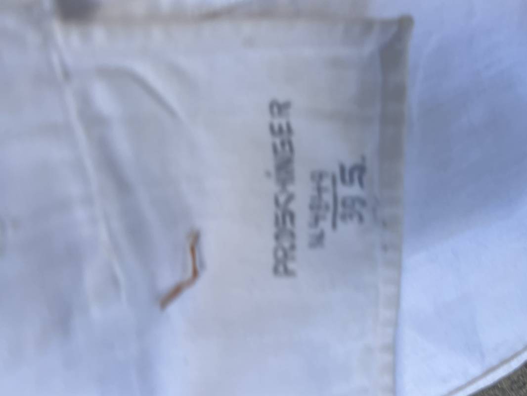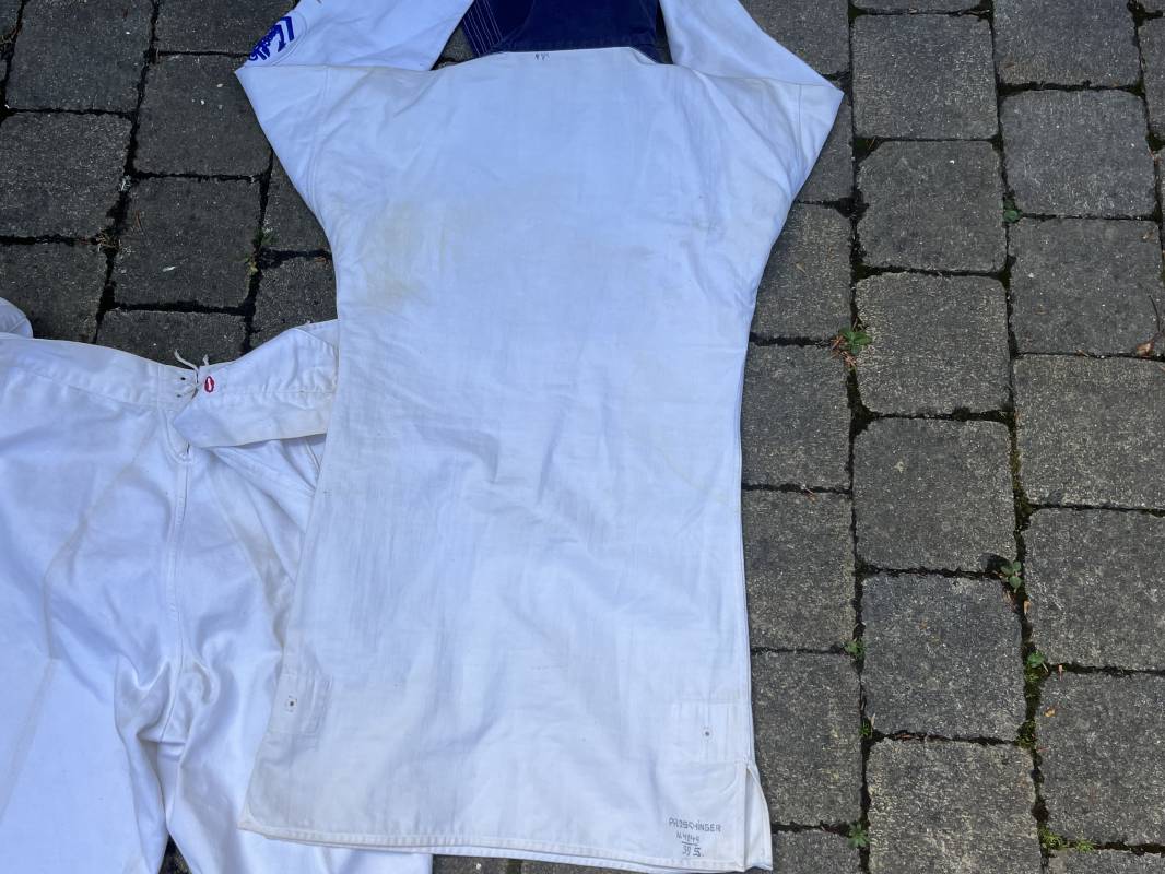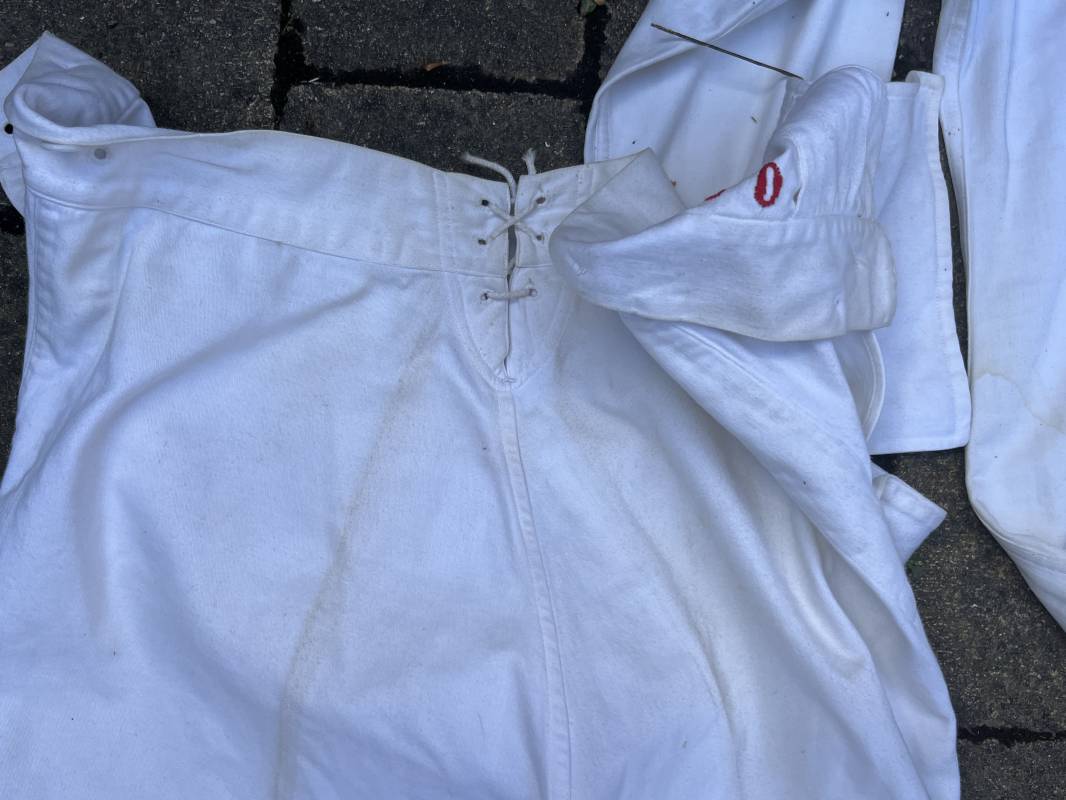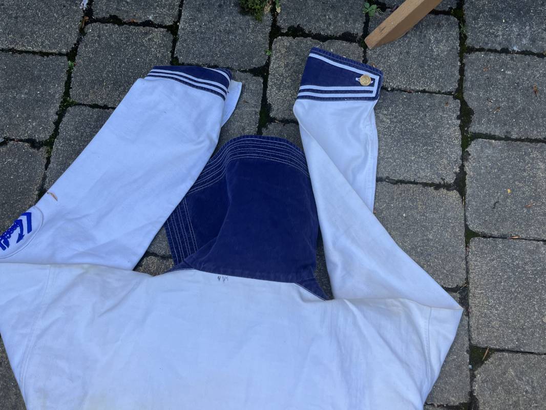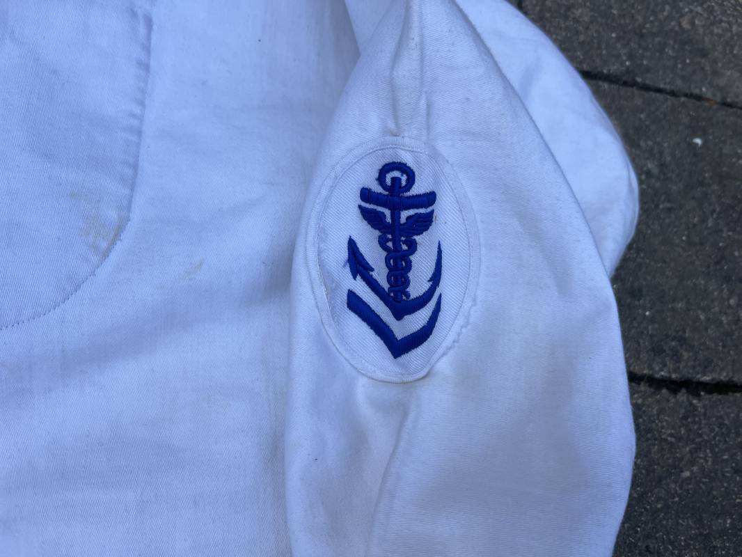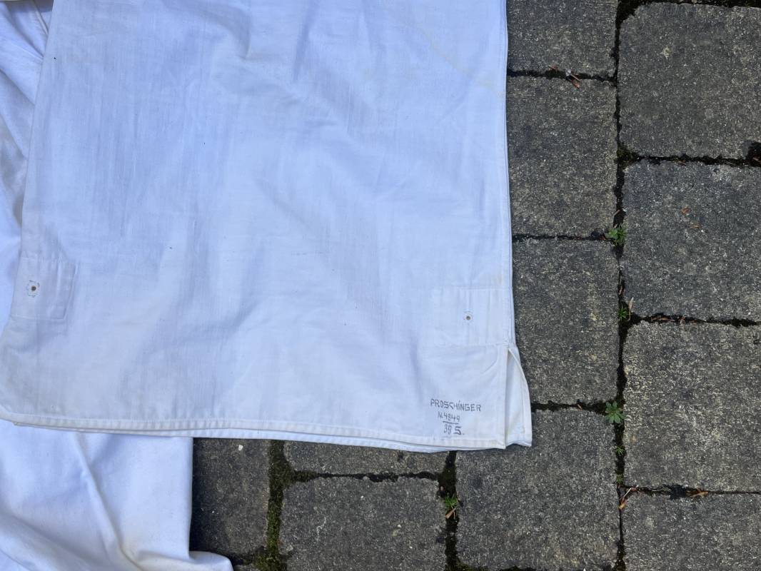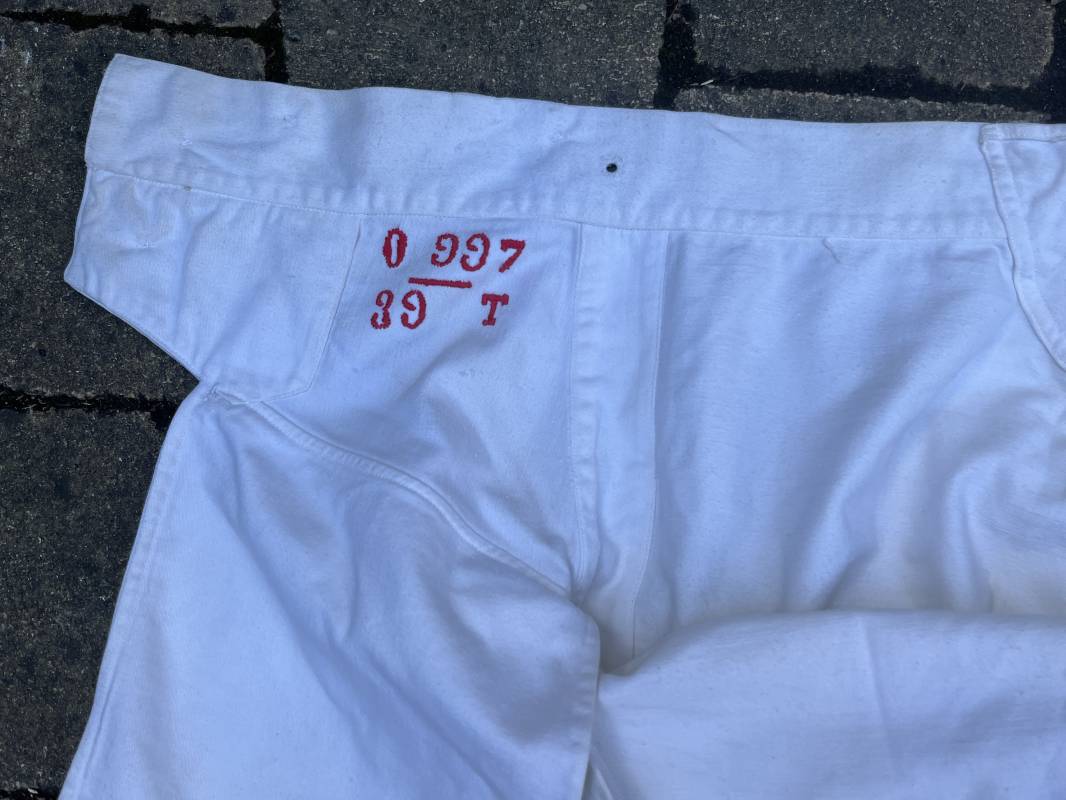 Bel ensemble d un sous officier ( Obermaat ) infirmier de la Kriegsmarine . Marinière et pantalon réglementaires en toile de coton blanc . Cet ensemble a appartenu au mème homme . Marinière de dotation en coton blanc , grand col bleu nuit , lacet coton blanc pour le port de la cravate , aigle de poitrine tissé bevo sur fond blanc monté mains , insigne de manche d infirmier sous officier au grade d obermaat . Tampon encre noir BAK 1938 . Marquage manuscris ; matricule et nom du matelot 'Proschinger 1939' . Deux petits boutons dorés à ancre amovibles en bas de manche . Largeur épaules40 cm longueur 76 cm manche 58 cm . Pantalon à pont de dotation en coton blanc , deux poches , boutons blanc cousus d origine . Lacet coton de serrage de taille sur le derrière Matricule et date ( 1939 ) brodés en fil de coton rouge . Taille 38 Longueur 98 cm Bel ensemble légérement porté en bel état 1939/45 Ref 22010