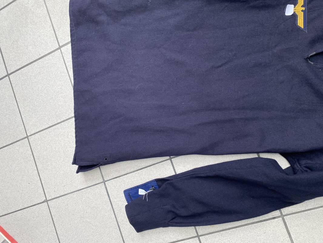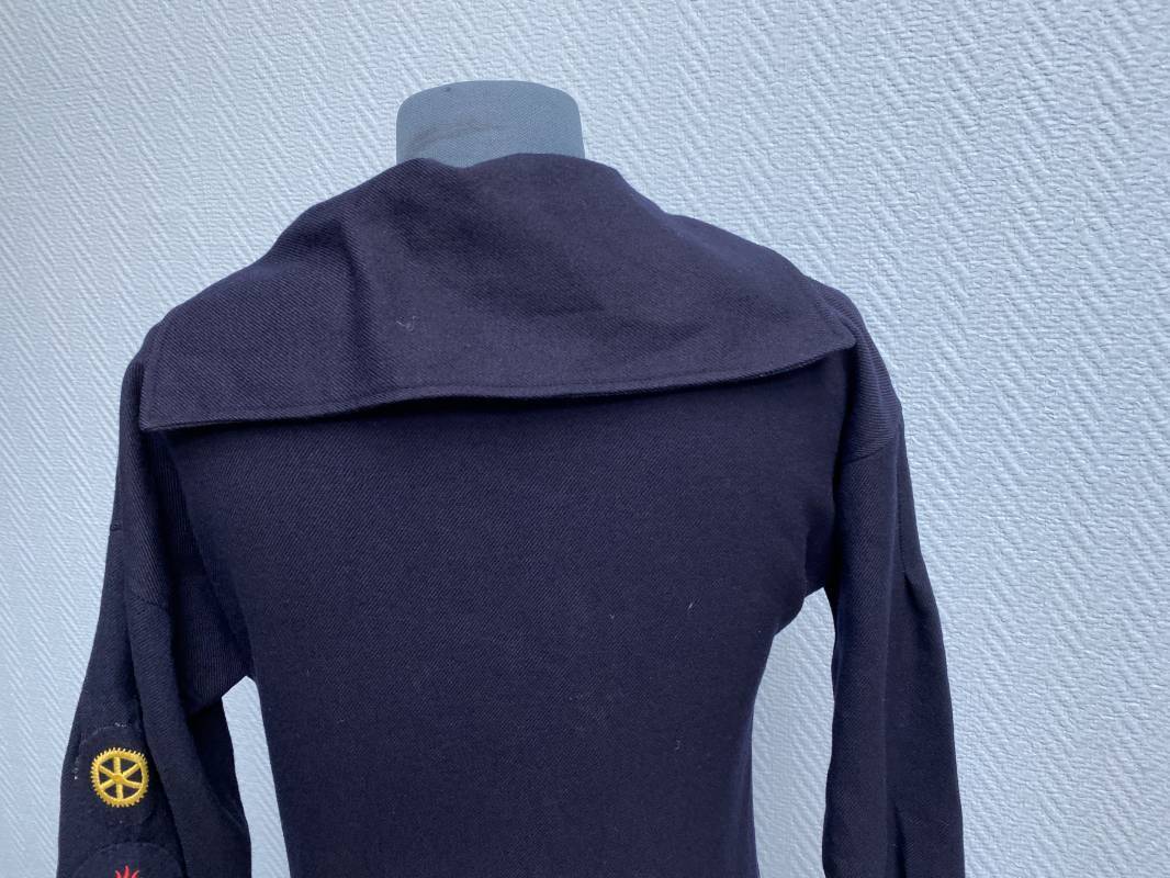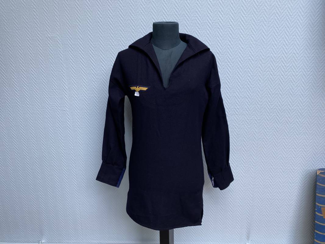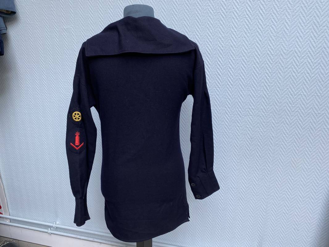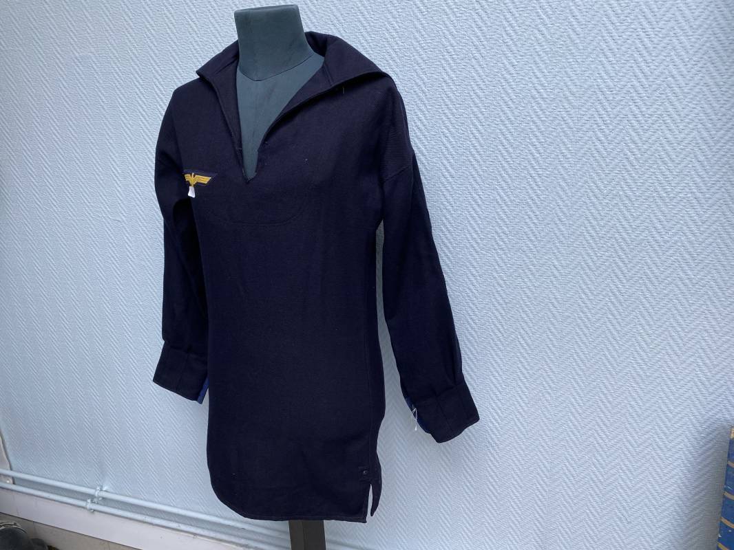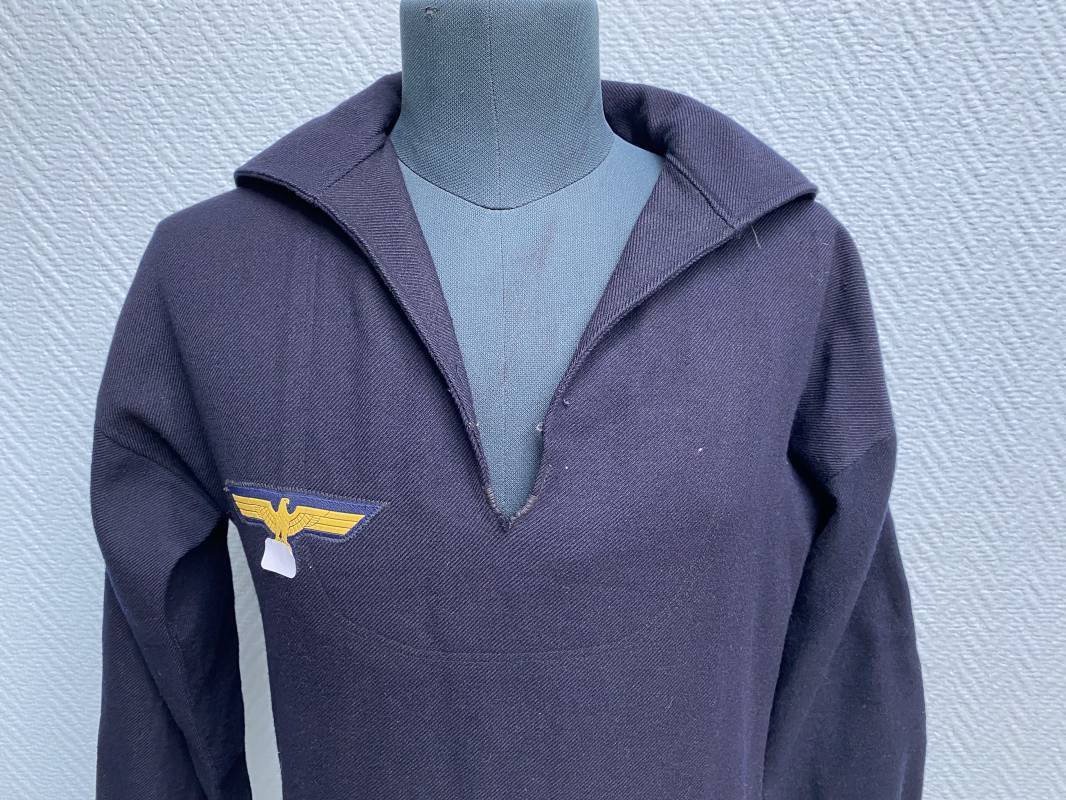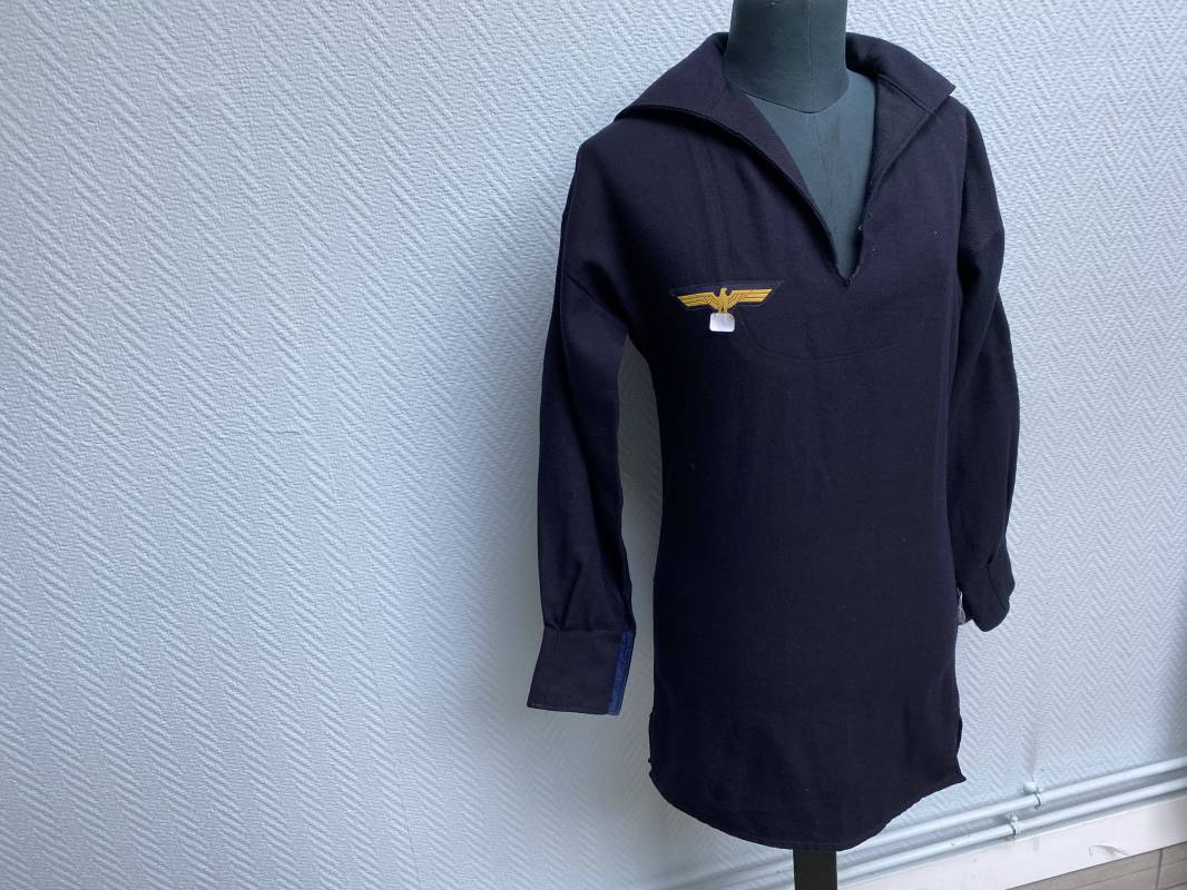 Très belle marinière réglementaire d'un matelot de la Kriegsmarine. Marinière en laine bleu nuit, large col. Aigle de poitrine troupe tissé bévo. Aigle monté d'origine machine zig zag . Insigne de manche de spécialité d'Artilleur embarqué. Boutons en carton en bouts de manches. Poche intérieure en coton bleu. Marinière légèrement portée en parfait état. Largeur d'épaules 43cm. Longueur 81cm. Manches 58cm 1940/45. Ref 18025