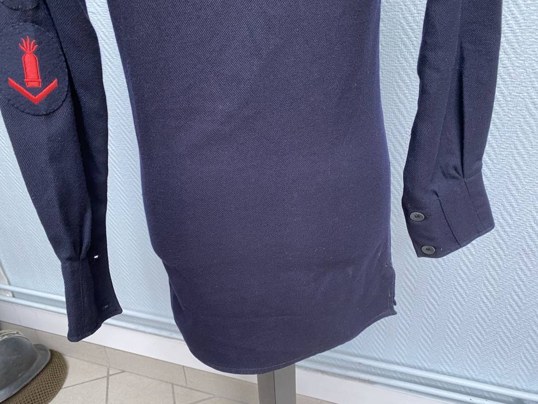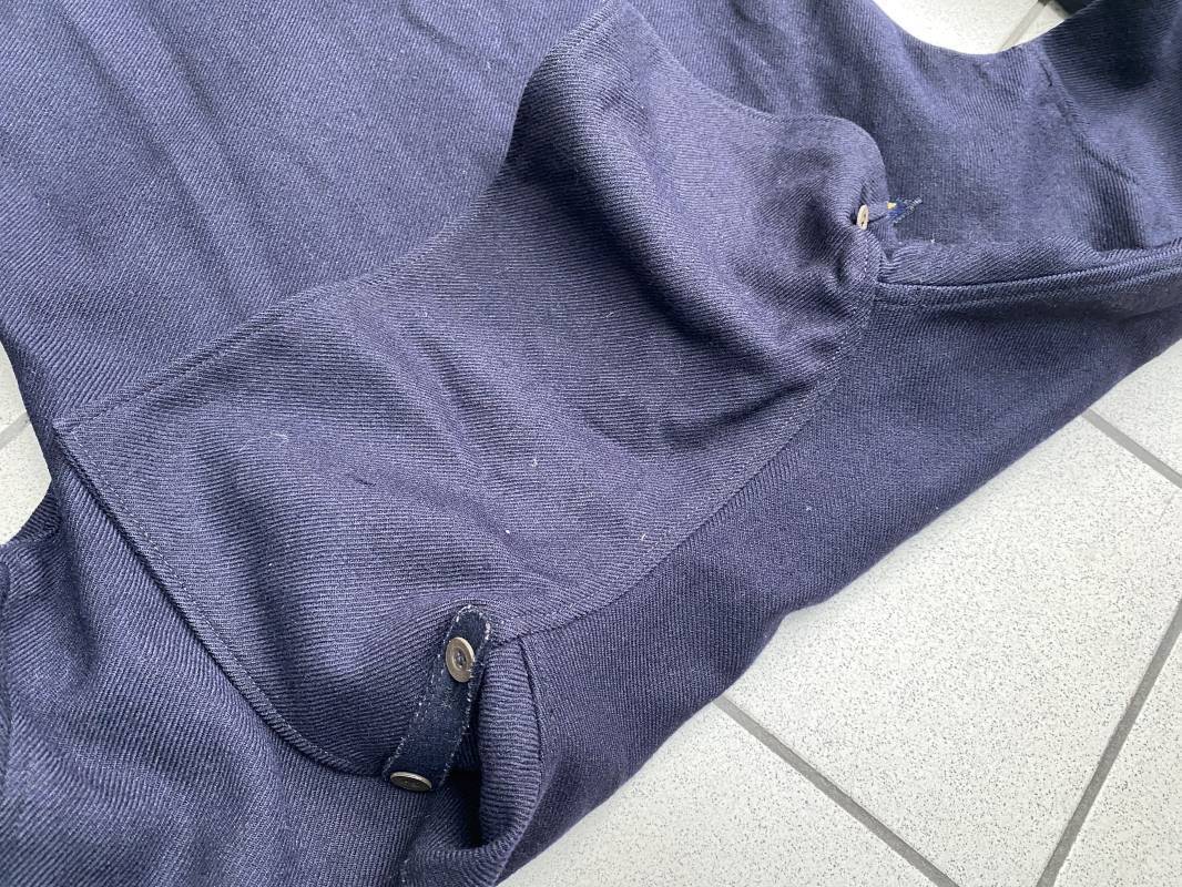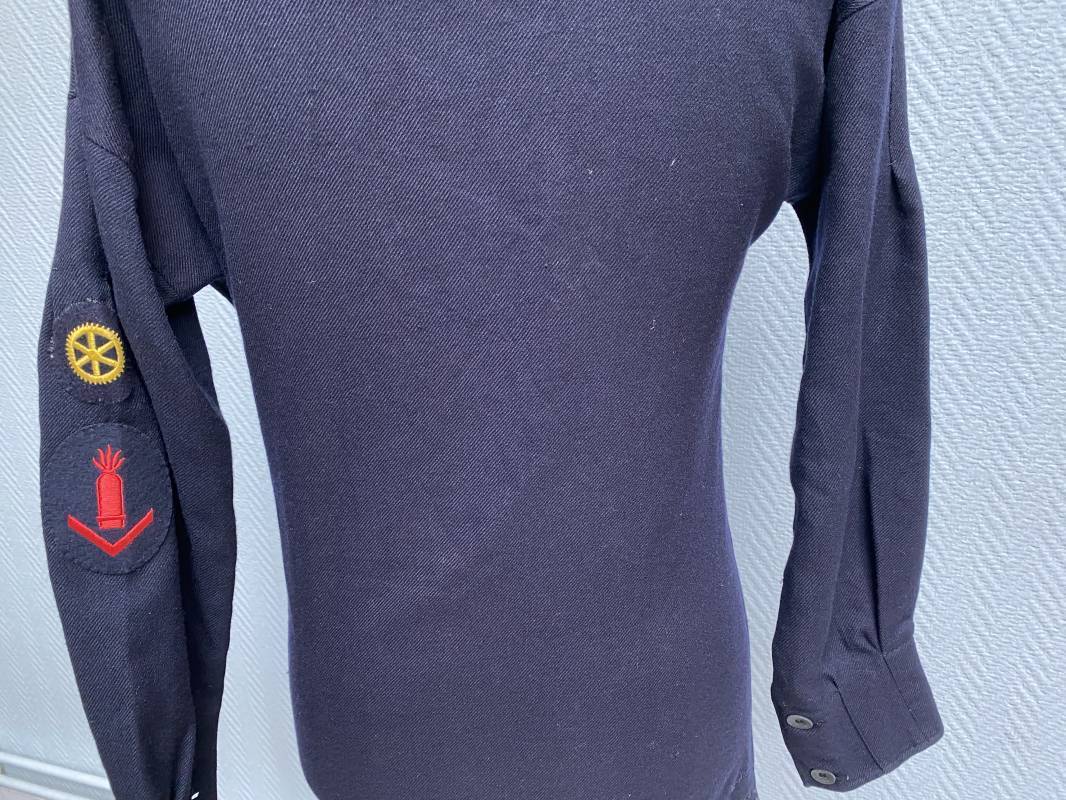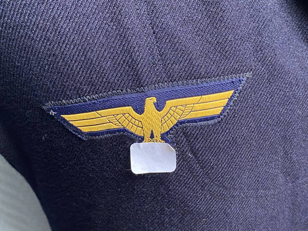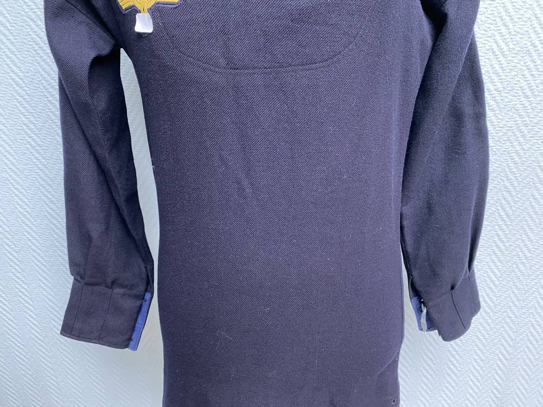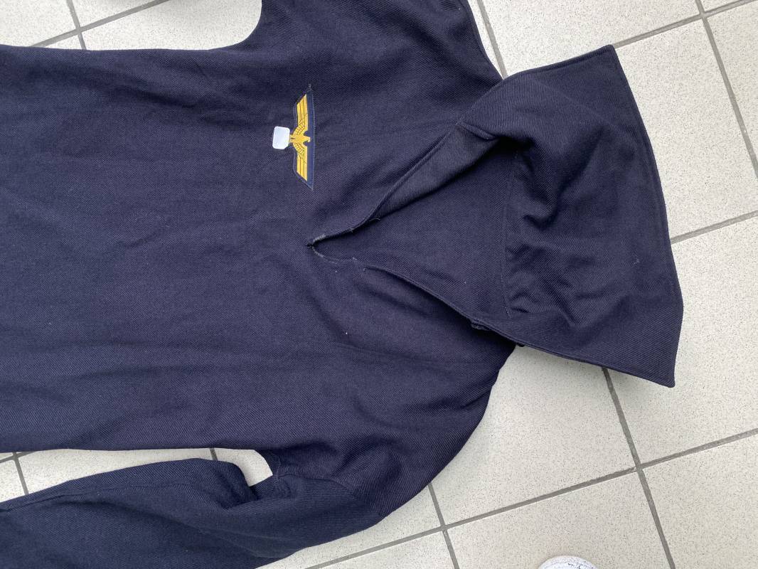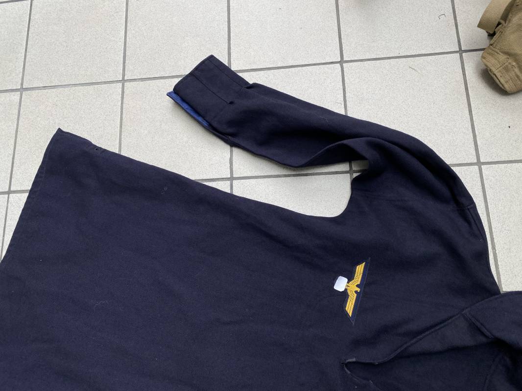 Très belle marinière réglementaire d'un matelot de la Kriegsmarine. Marinière en laine bleu nuit, large col. Aigle de poitrine troupe tissé bévo. Aigle monté d'origine machine zig zag . Insigne de manche de spécialité d'Artilleur embarqué. Boutons en carton en bouts de manches. Poche intérieure en coton bleu. Marinière légèrement portée en parfait état. Largeur d'épaules 43cm. Longueur 81cm. Manches 58cm 1940/45. Ref 18025