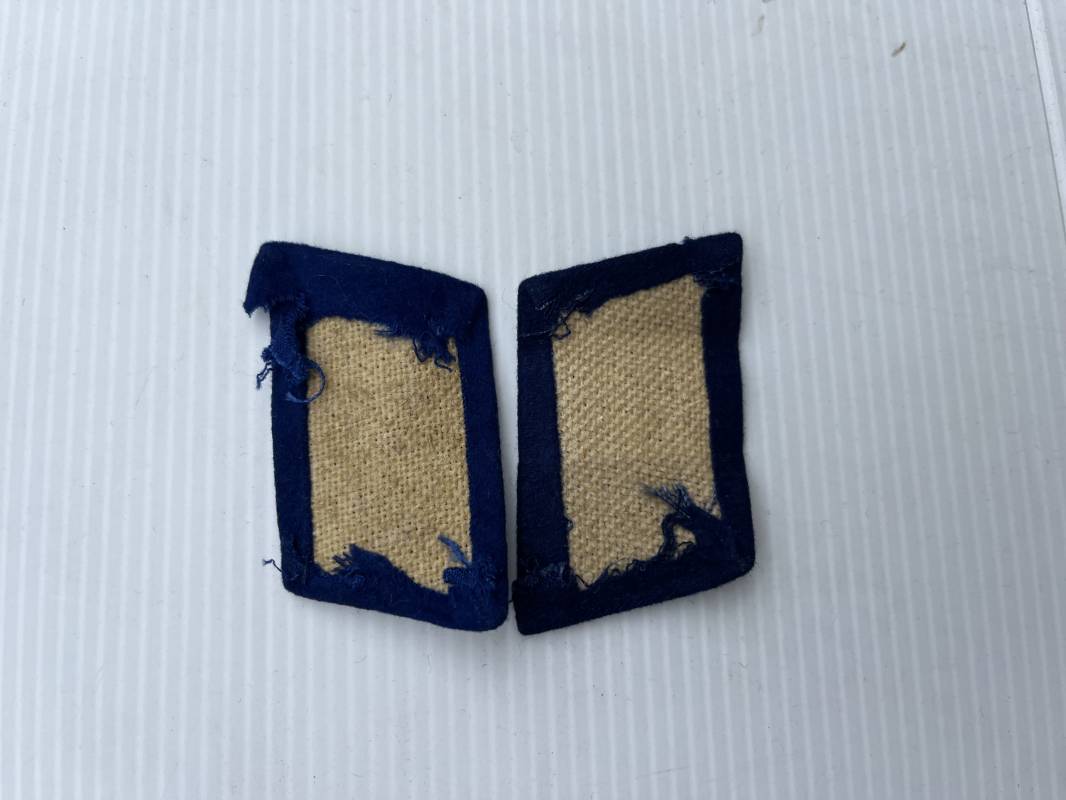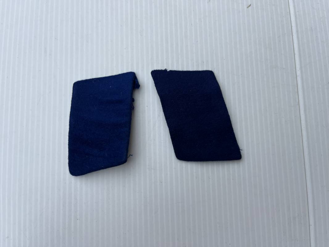 Très belle paire de coins de col d'un matelot de la Kriegsmarine. Pattes de col pour caban bleu. Dimensions 38x57mm. Tissu type 'peau de souris' de couleur "bleu roi". Socle en toile enduite. Parfait état. Jamais monté . Ref 21769