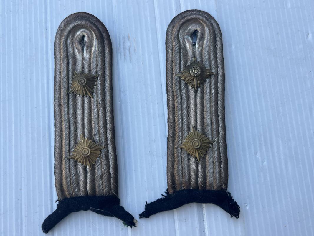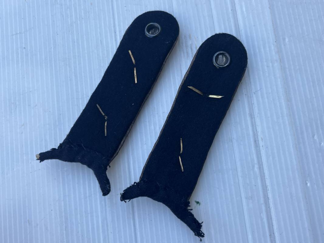 Trés belle paire de pattes d'épaules d'un officier de la Kriegsmarine . Modéle a fixer aux enmanchures . Clous de grade de capitaine ( KapitanLeutnann ) . Socle en drap noir Longueur 112 mm . Légèrement porté en bel état . Ref 22072