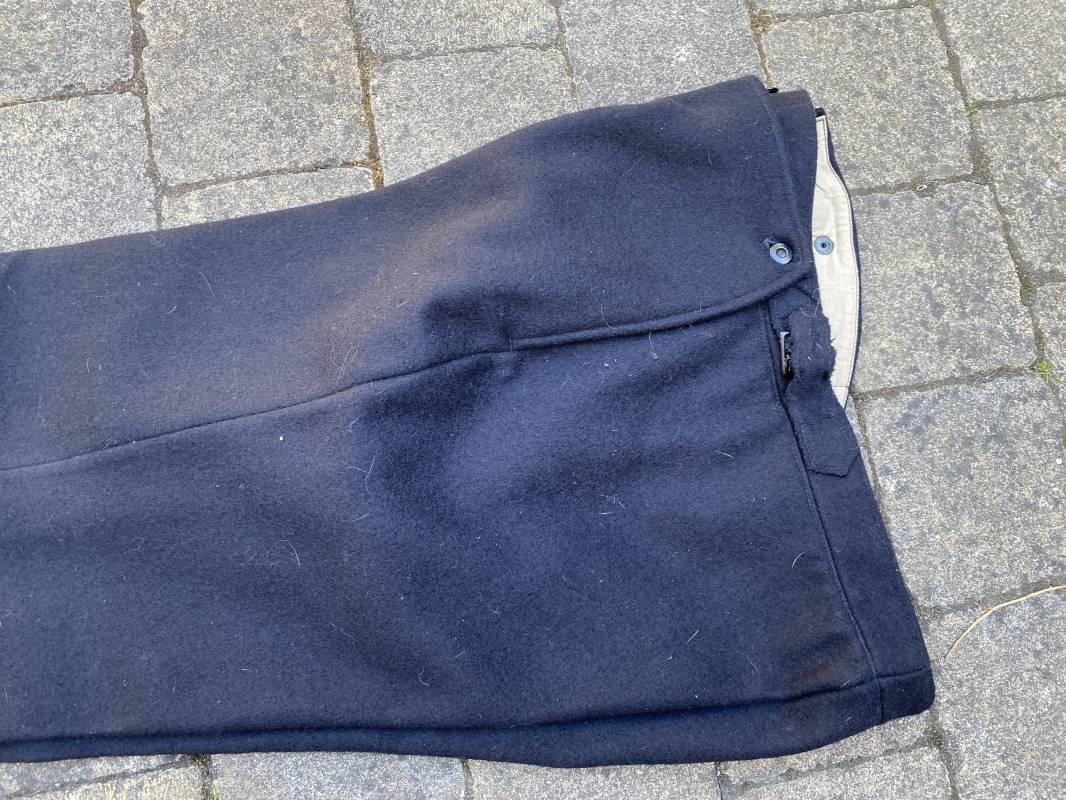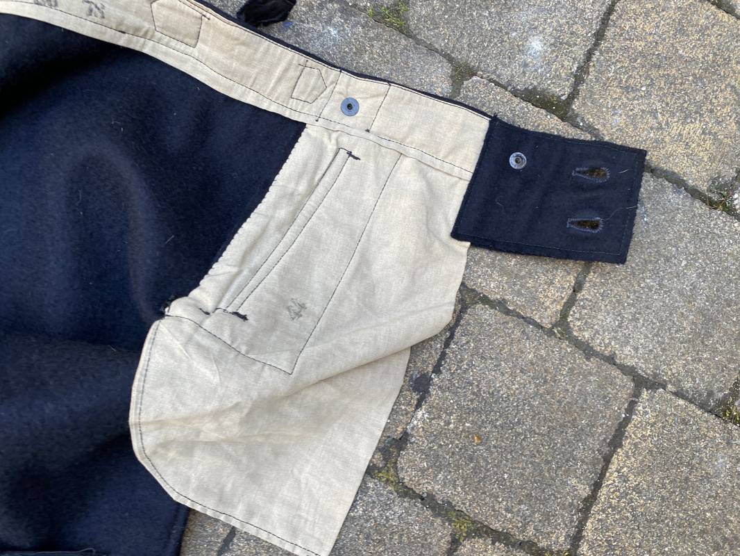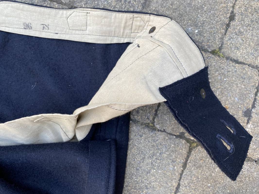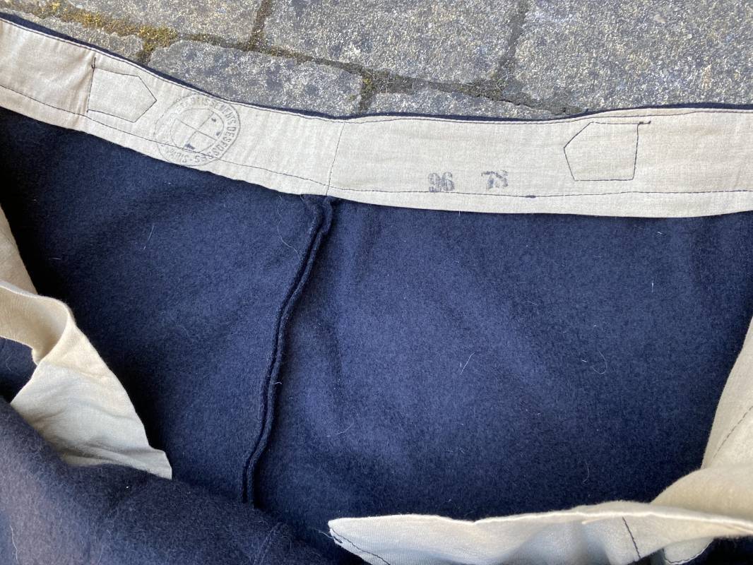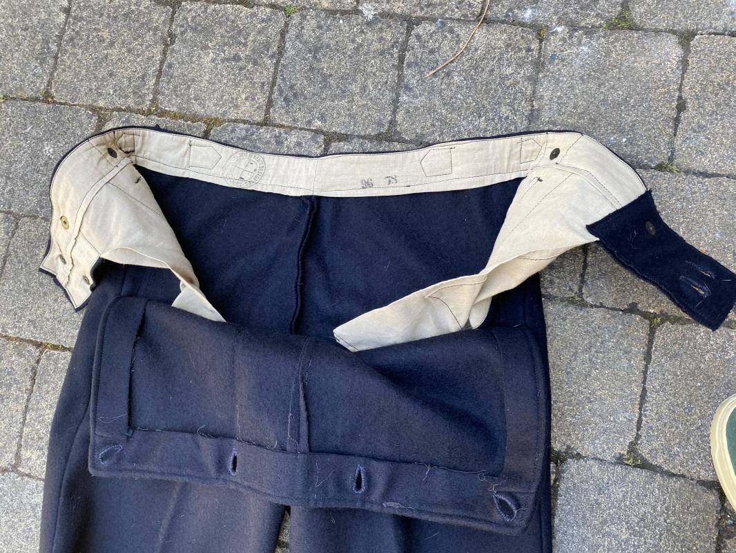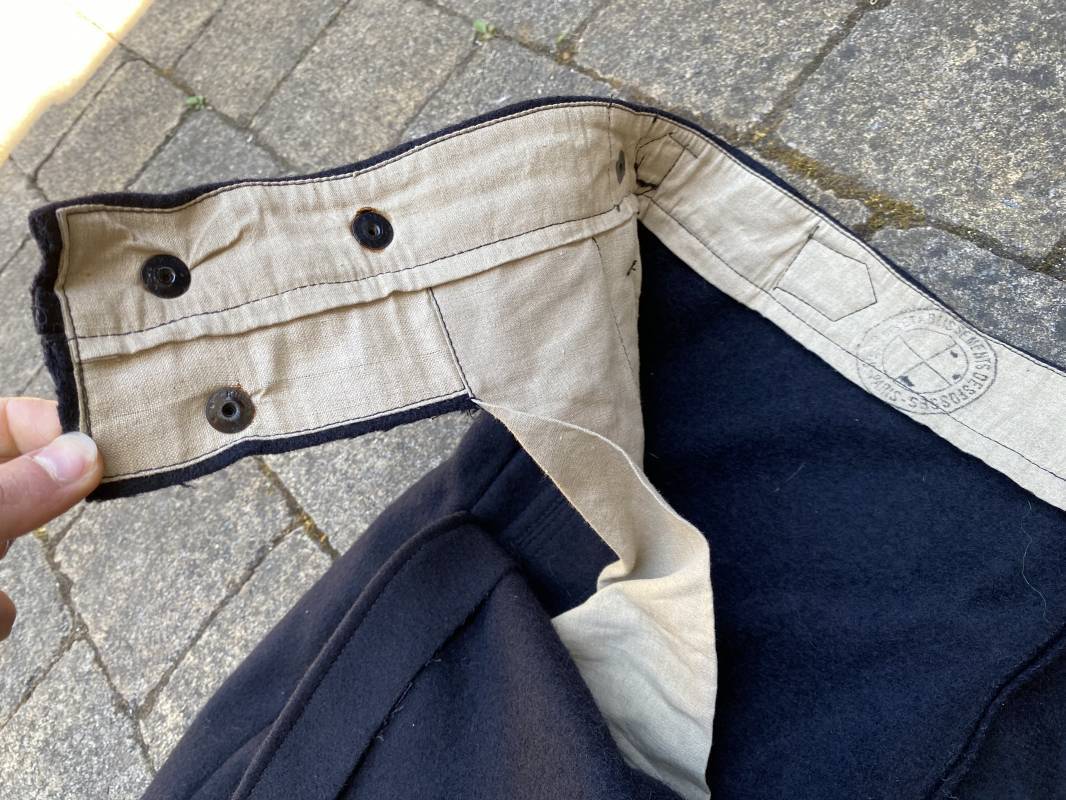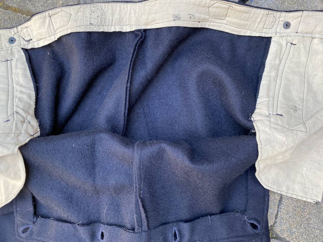 Très beau pantalon à pont réglementaire de la Kriegsmarine en drap bleu foncé. Fabrication Française sous l'occupation. Boutons métalliques rivetés, boucles fer de réglage de taille sur chaque cotés . Intérieur doublé en coton blanc. Marquage taille encre noire taille 44. Longueur 106cm. Tampon rond fabricant Etablissements Desfosses Paris. Pantalon très légèrement porté en superbe état, drap trèsfrais 1940/45. Ref 16455