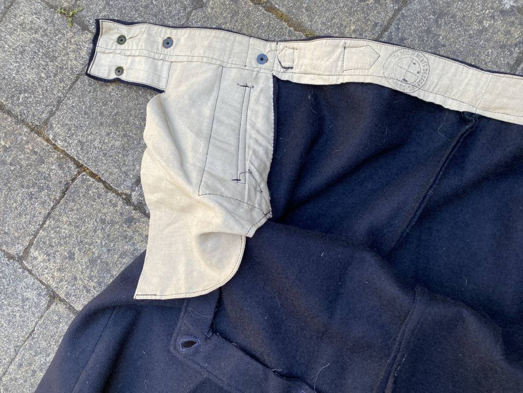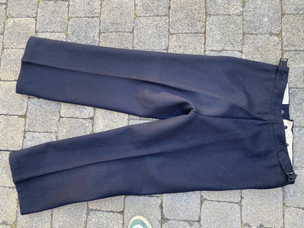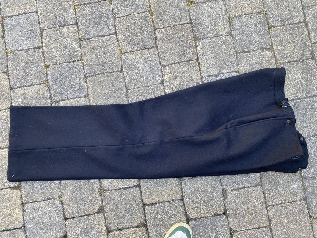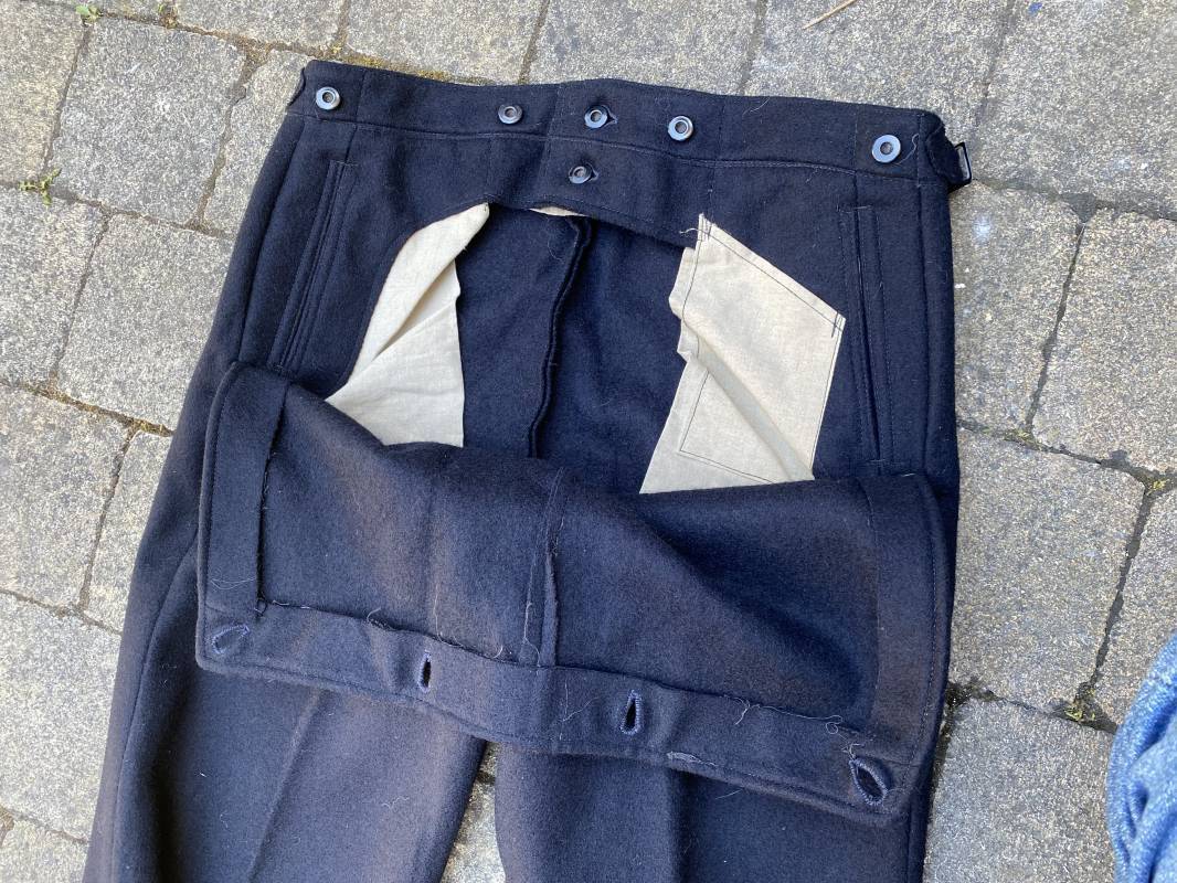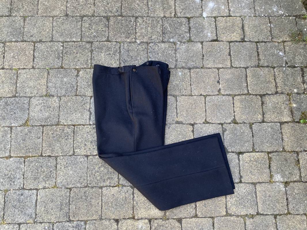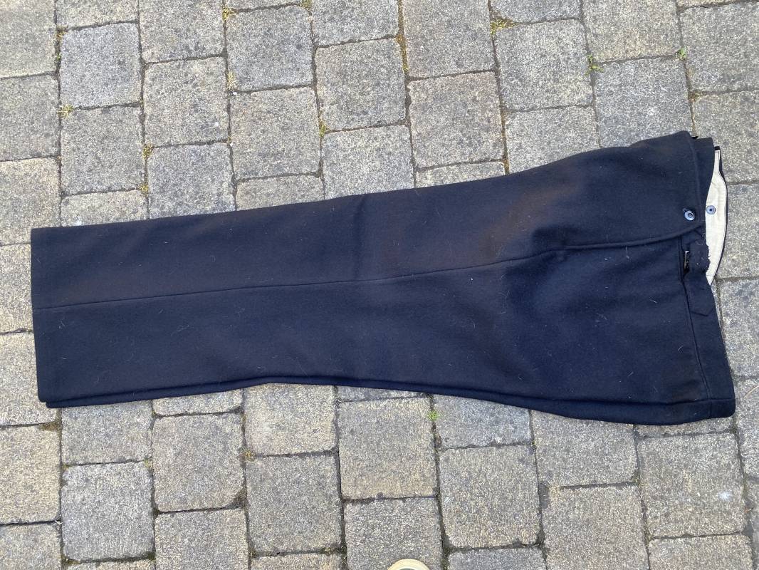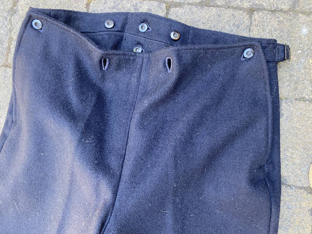 Très beau pantalon à pont réglementaire de la Kriegsmarine en drap bleu foncé. Fabrication Française sous l'occupation. Boutons métalliques rivetés, boucles fer de réglage de taille sur chaque cotés . Intérieur doublé en coton blanc. Marquage taille encre noire taille 44. Longueur 106cm. Tampon rond fabricant Etablissements Desfosses Paris. Pantalon très légèrement porté en superbe état, drap trèsfrais 1940/45. Ref 16455
