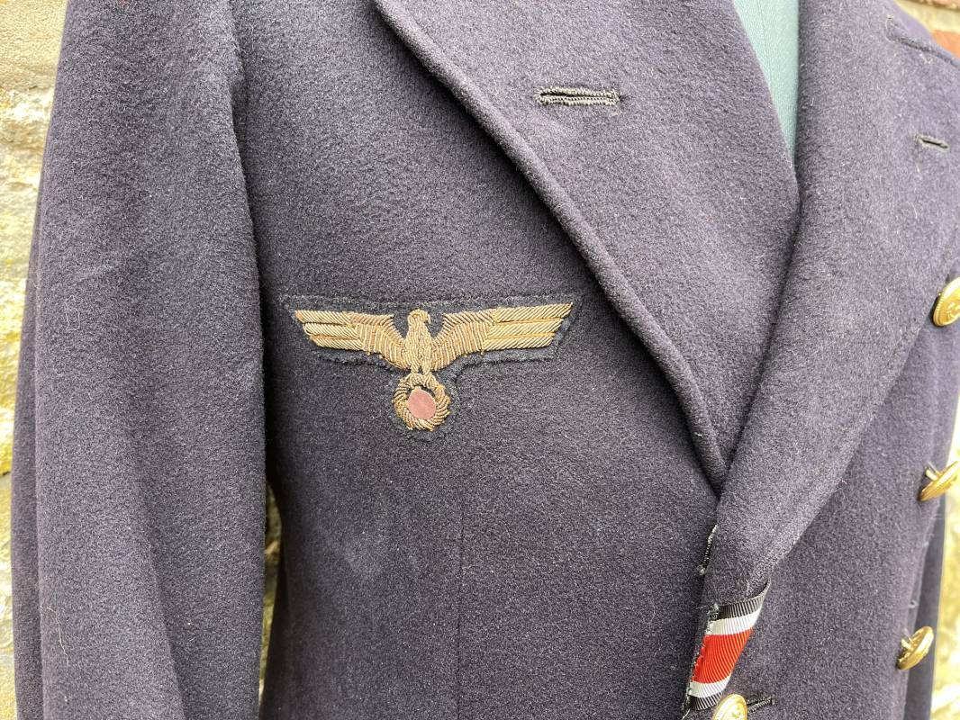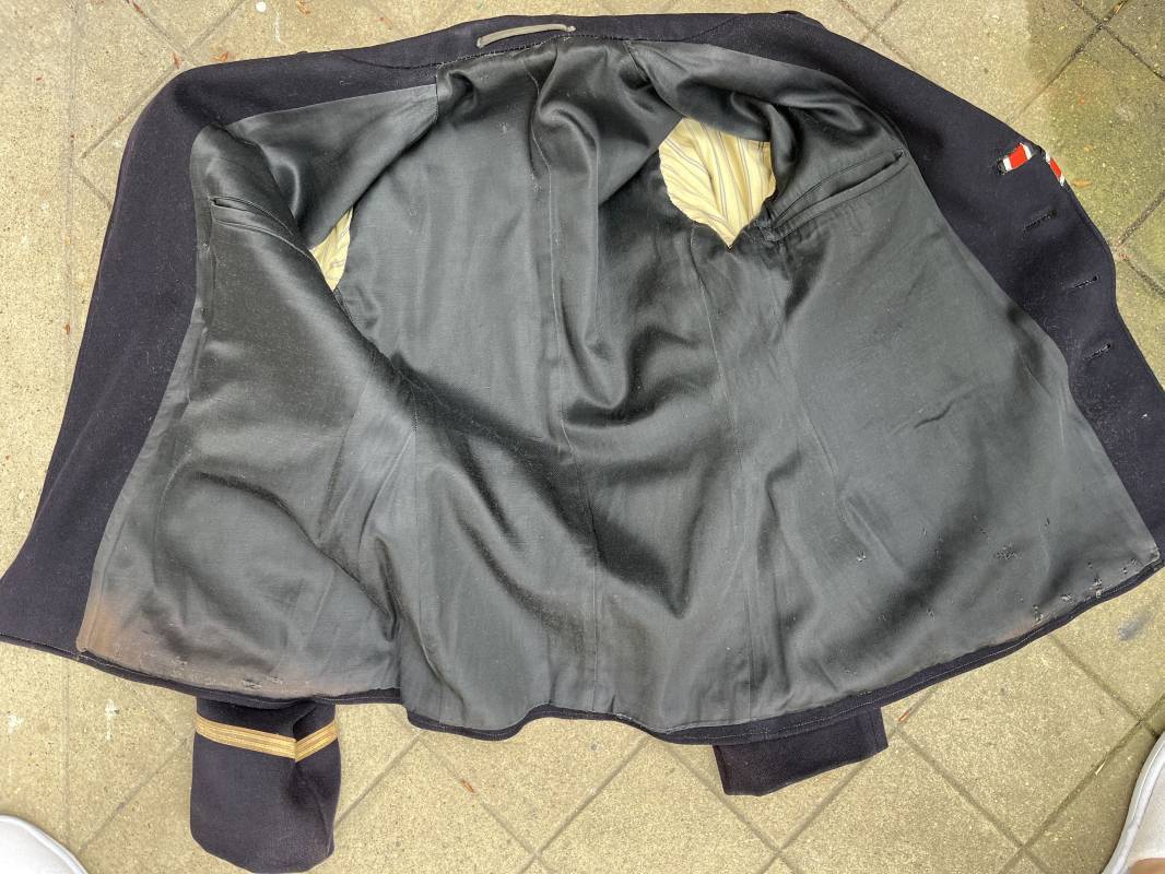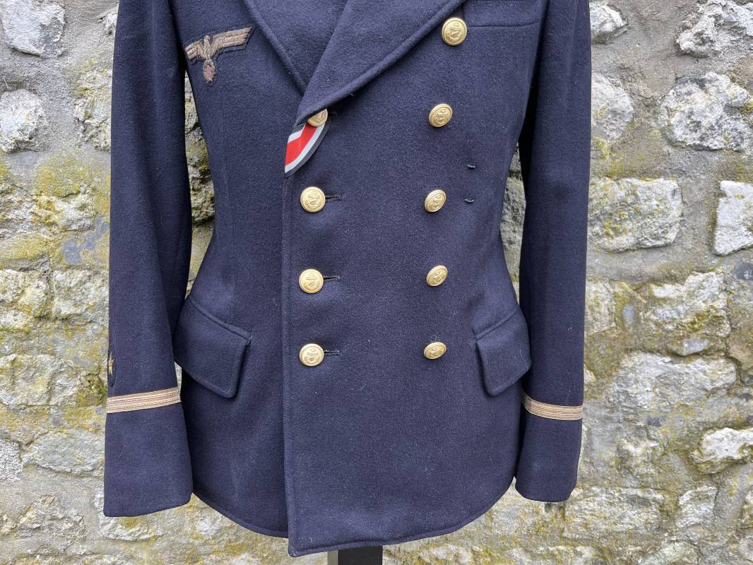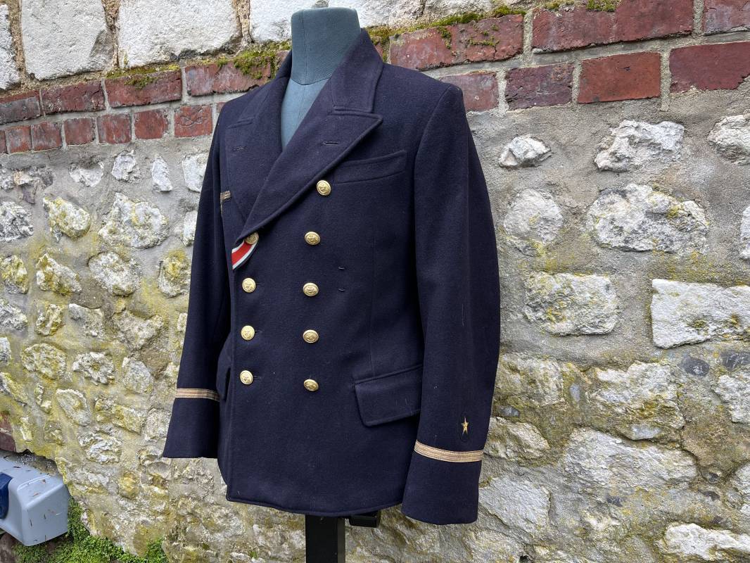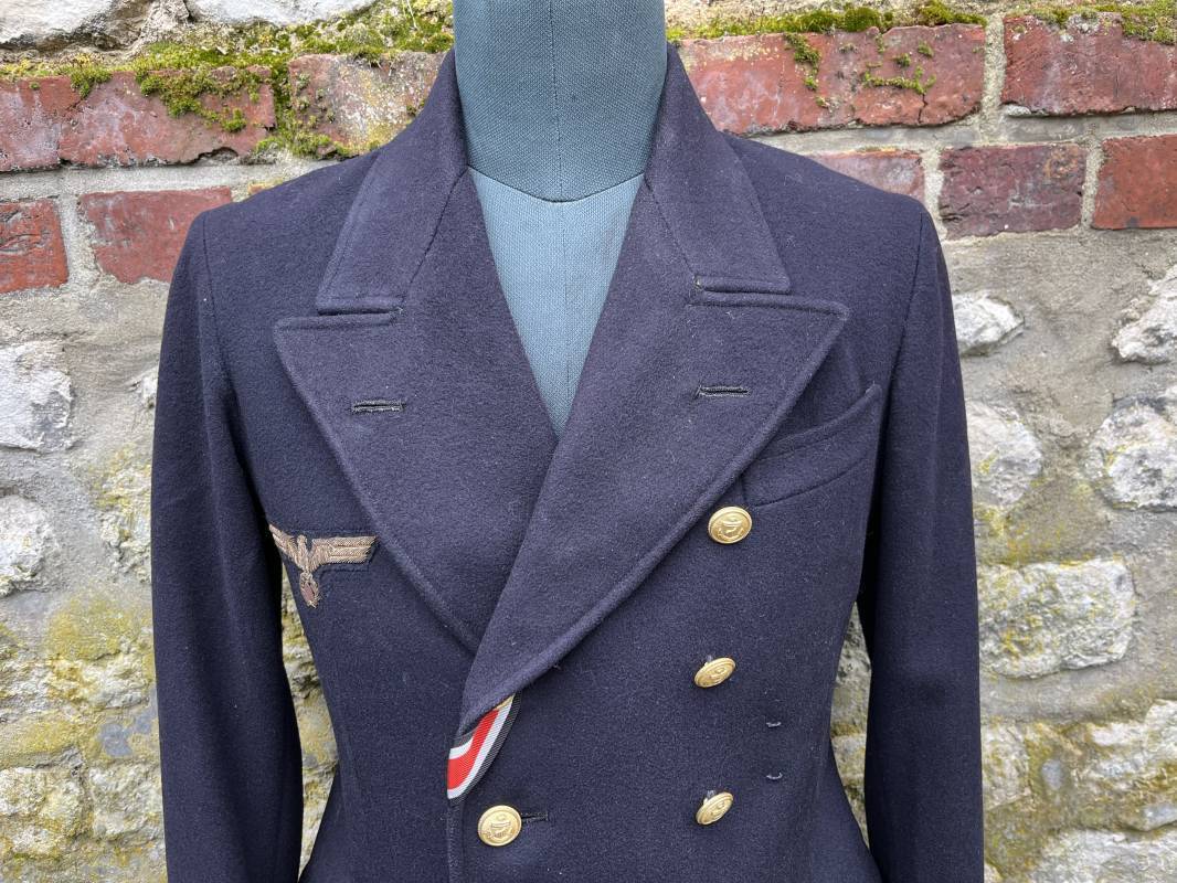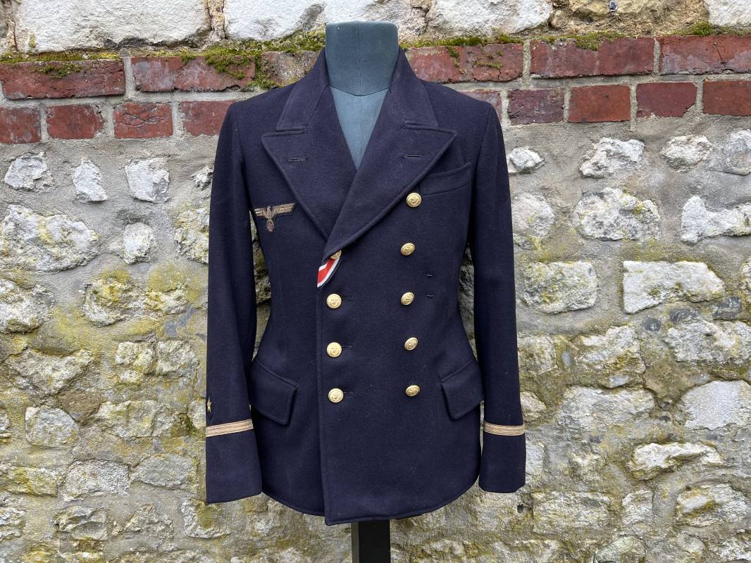 Rare veston croisé d'un officier navigant de la Kriegsmarine . Veston en drap de laine bleu nuit entièrement monté d'origine , trouvé en Allemagne directement en famille . Ce veston n'a jamais été en collection . Veston croisé à deux rangées de boutons dorés à ancre . Ruban de croix de fer 2éme classe 1939 cousu à la boutonnière . Galons de manches dorés et étoile brodée cannetille dorée de navigant , Grade de enseigne de vaisseau 2me Classe Leutnant zur see) . Passants pour le port d un badge de poitrine . Petite poche de poitrine sans rabat , deux poches basses à rabats . Aigle de poitrine en cannetille dorée . Intérieur du veston doublé en satinette noire , deux poches intérieures , manches doublées en satinette rayée . Largeur épaules 40 cm , longueur 67 cm , manche 60 cm . Veston légèrement porté en tres bel état . Rare veston d'un officier navigant de la KM 1940/45 Ref 19837