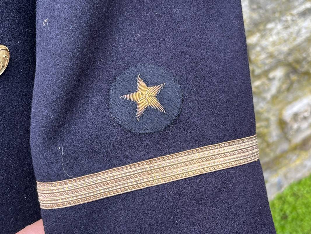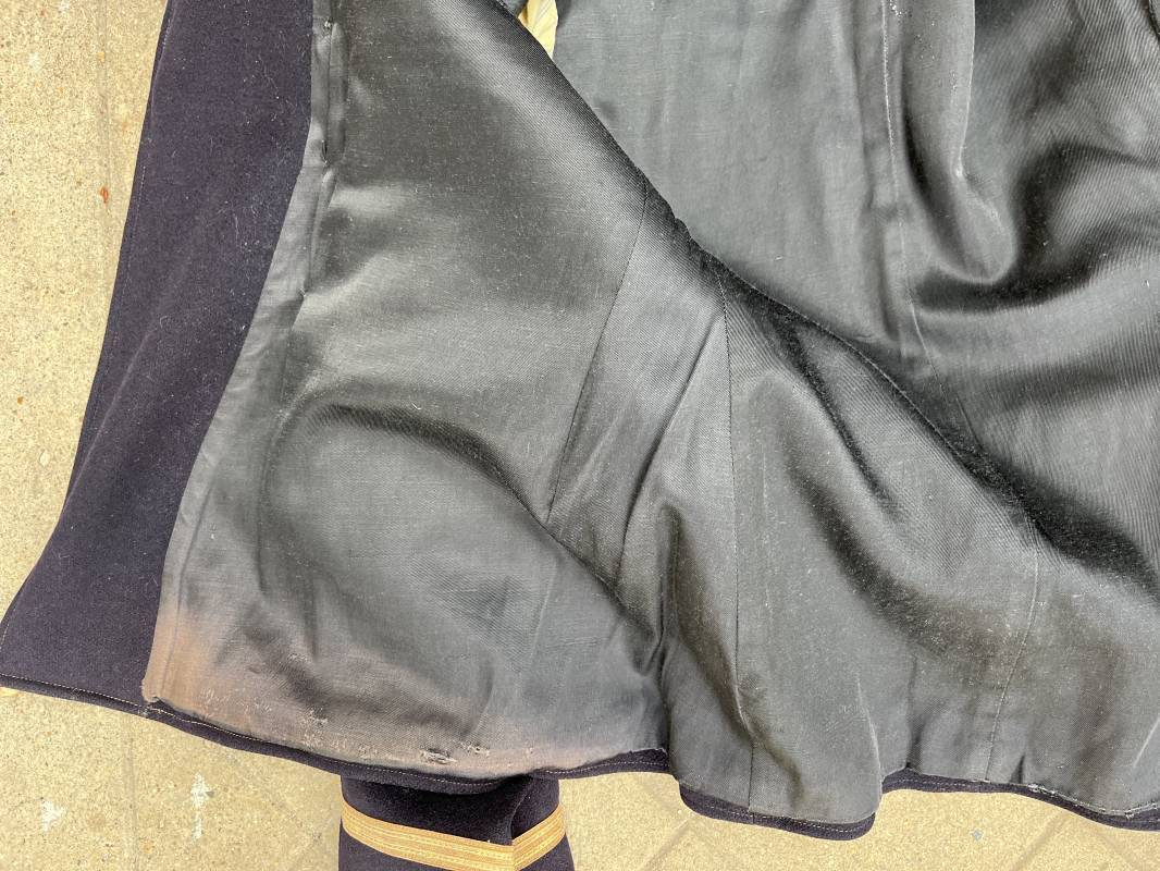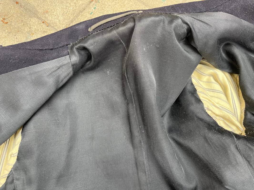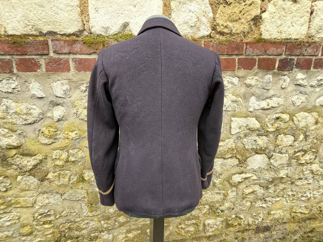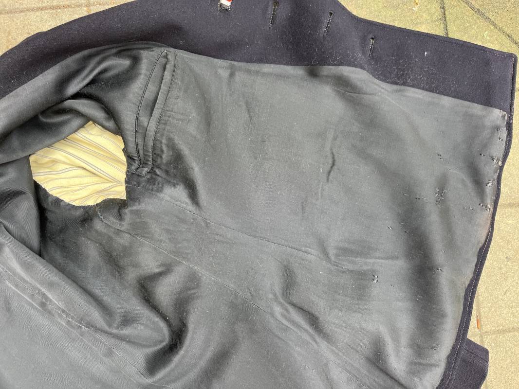 Rare veston croisé d'un officier navigant de la Kriegsmarine . Veston en drap de laine bleu nuit entièrement monté d'origine , trouvé en Allemagne directement en famille . Ce veston n'a jamais été en collection . Veston croisé à deux rangées de boutons dorés à ancre . Ruban de croix de fer 2éme classe 1939 cousu à la boutonnière . Galons de manches dorés et étoile brodée cannetille dorée de navigant , Grade de enseigne de vaisseau 2me Classe Leutnant zur see) . Passants pour le port d un badge de poitrine . Petite poche de poitrine sans rabat , deux poches basses à rabats . Aigle de poitrine en cannetille dorée . Intérieur du veston doublé en satinette noire , deux poches intérieures , manches doublées en satinette rayée . Largeur épaules 40 cm , longueur 67 cm , manche 60 cm . Veston légèrement porté en tres bel état . Rare veston d'un officier navigant de la KM 1940/45 Ref 19837