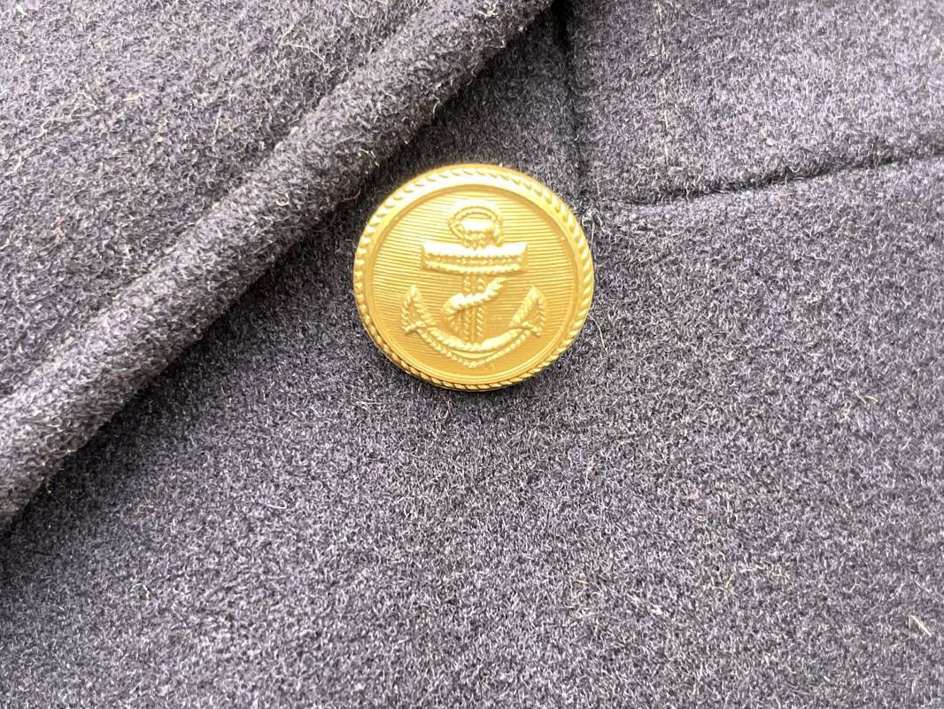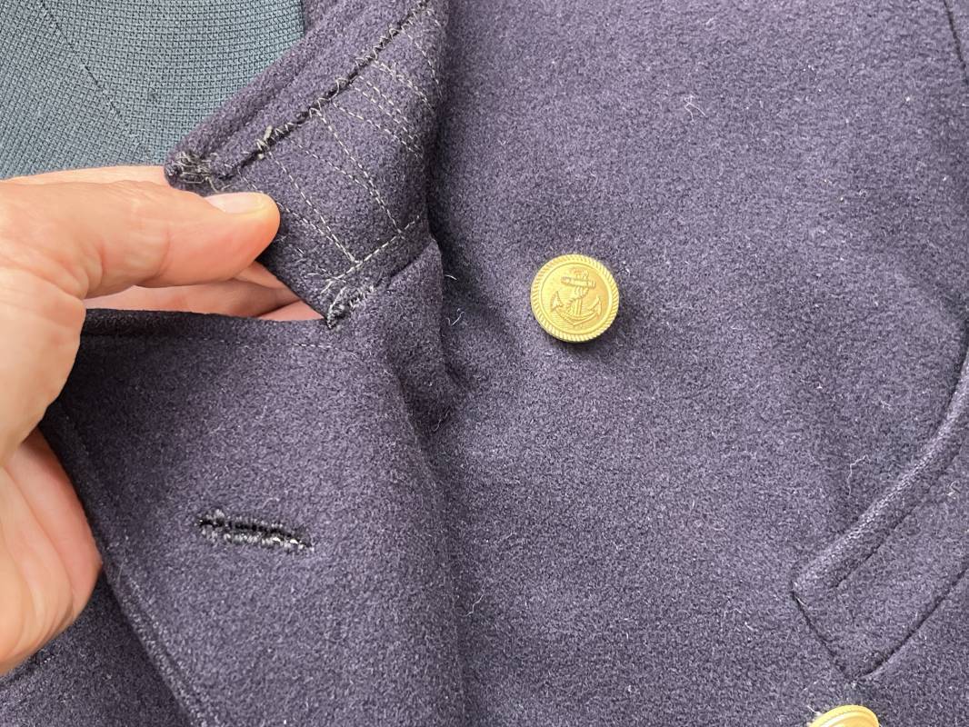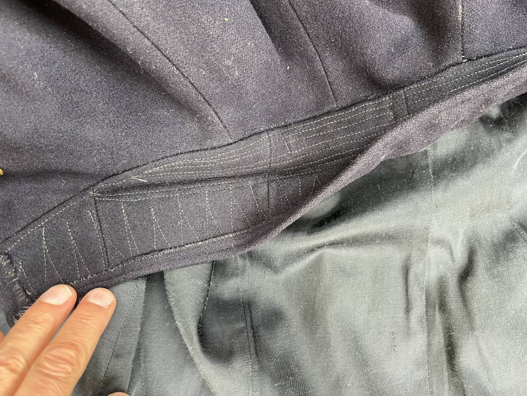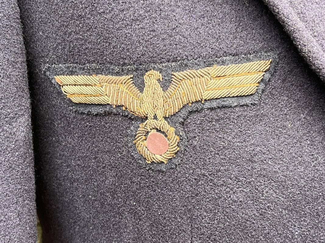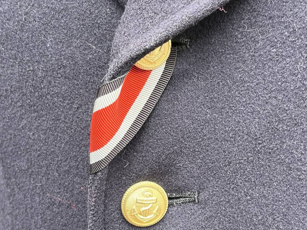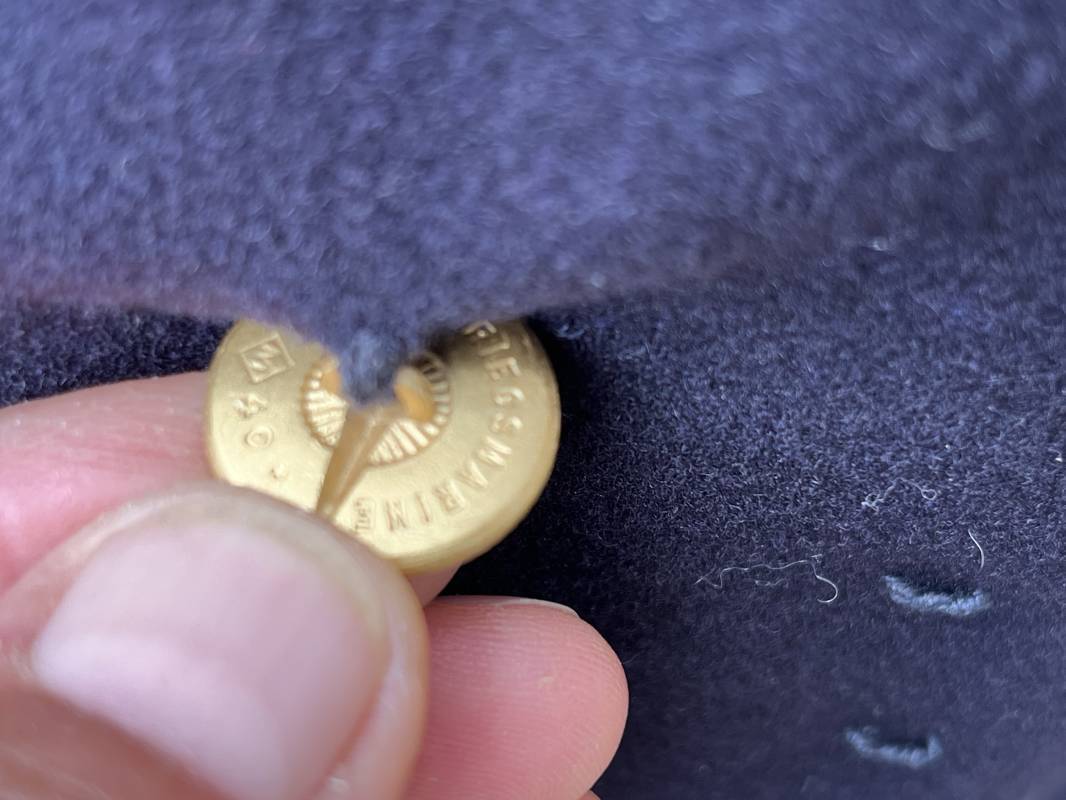 Rare veston croisé d'un officier navigant de la Kriegsmarine . Veston en drap de laine bleu nuit entièrement monté d'origine , trouvé en Allemagne directement en famille . Ce veston n'a jamais été en collection . Veston croisé à deux rangées de boutons dorés à ancre . Ruban de croix de fer 2éme classe 1939 cousu à la boutonnière . Galons de manches dorés et étoile brodée cannetille dorée de navigant , Grade de enseigne de vaisseau 2me Classe Leutnant zur see) . Passants pour le port d un badge de poitrine . Petite poche de poitrine sans rabat , deux poches basses à rabats . Aigle de poitrine en cannetille dorée . Intérieur du veston doublé en satinette noire , deux poches intérieures , manches doublées en satinette rayée . Largeur épaules 40 cm , longueur 67 cm , manche 60 cm . Veston légèrement porté en tres bel état . Rare veston d'un officier navigant de la KM 1940/45 Ref 19837