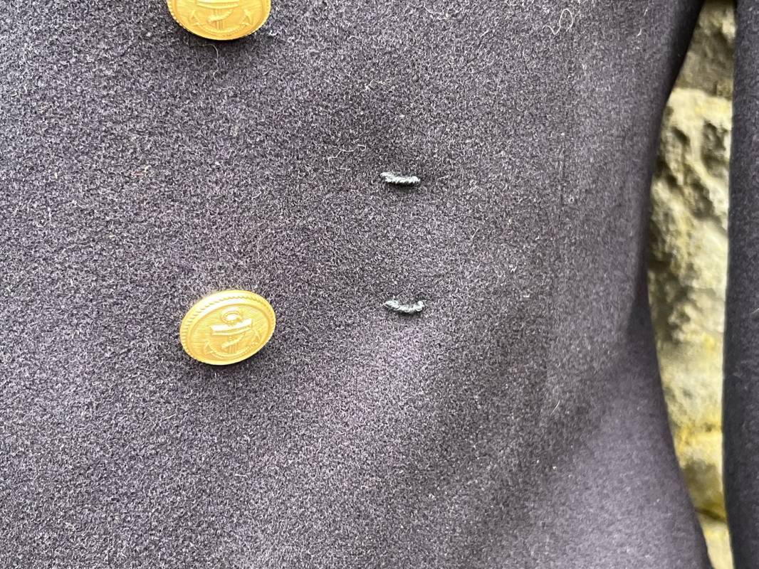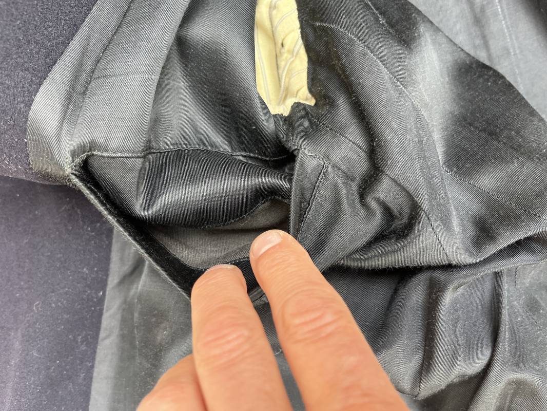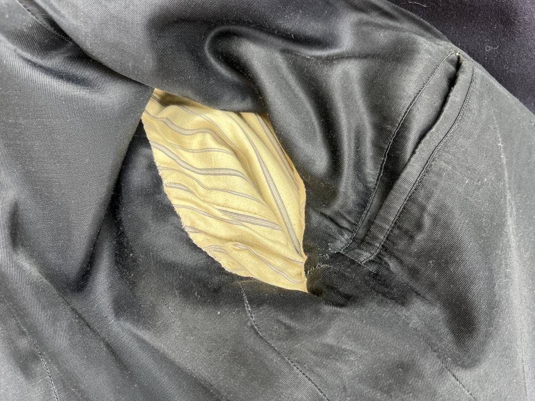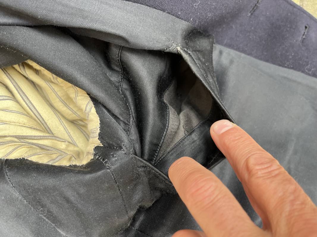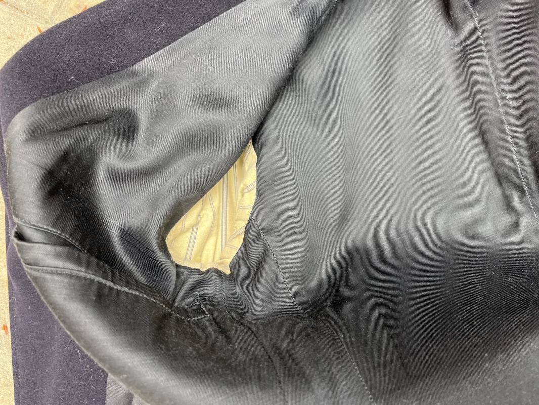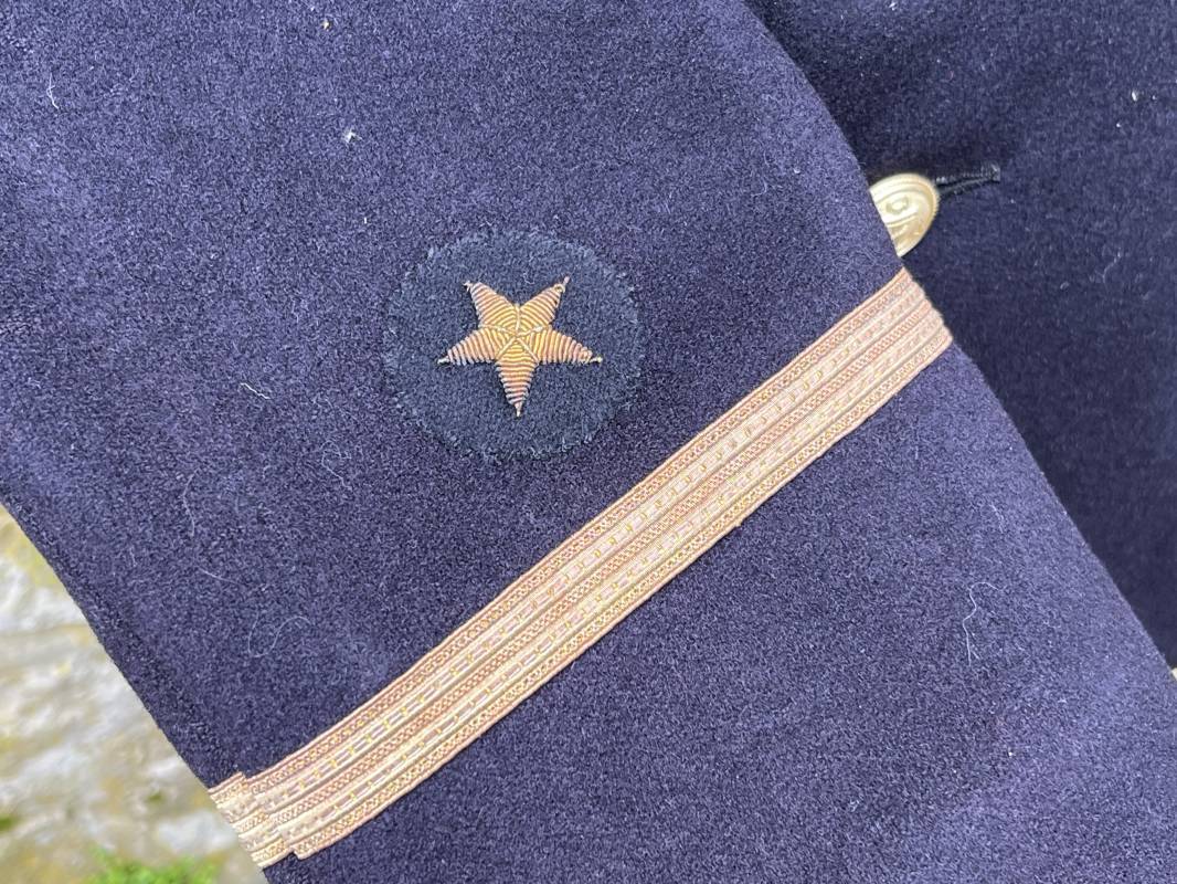 Rare veston croisé d'un officier navigant de la Kriegsmarine . Veston en drap de laine bleu nuit entièrement monté d'origine , trouvé en Allemagne directement en famille . Ce veston n'a jamais été en collection . Veston croisé à deux rangées de boutons dorés à ancre . Ruban de croix de fer 2éme classe 1939 cousu à la boutonnière . Galons de manches dorés et étoile brodée cannetille dorée de navigant , Grade de enseigne de vaisseau 2me Classe Leutnant zur see) . Passants pour le port d un badge de poitrine . Petite poche de poitrine sans rabat , deux poches basses à rabats . Aigle de poitrine en cannetille dorée . Intérieur du veston doublé en satinette noire , deux poches intérieures , manches doublées en satinette rayée . Largeur épaules 40 cm , longueur 67 cm , manche 60 cm . Veston légèrement porté en tres bel état . Rare veston d'un officier navigant de la KM 1940/45 Ref 19837