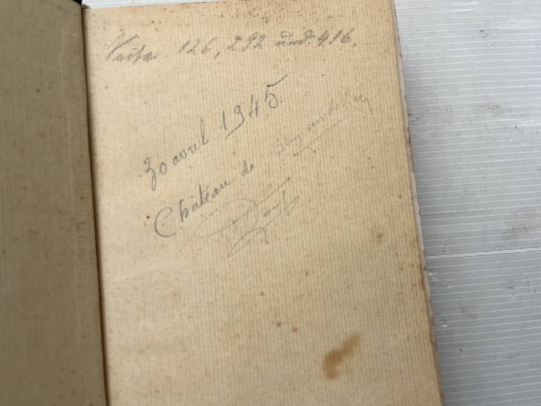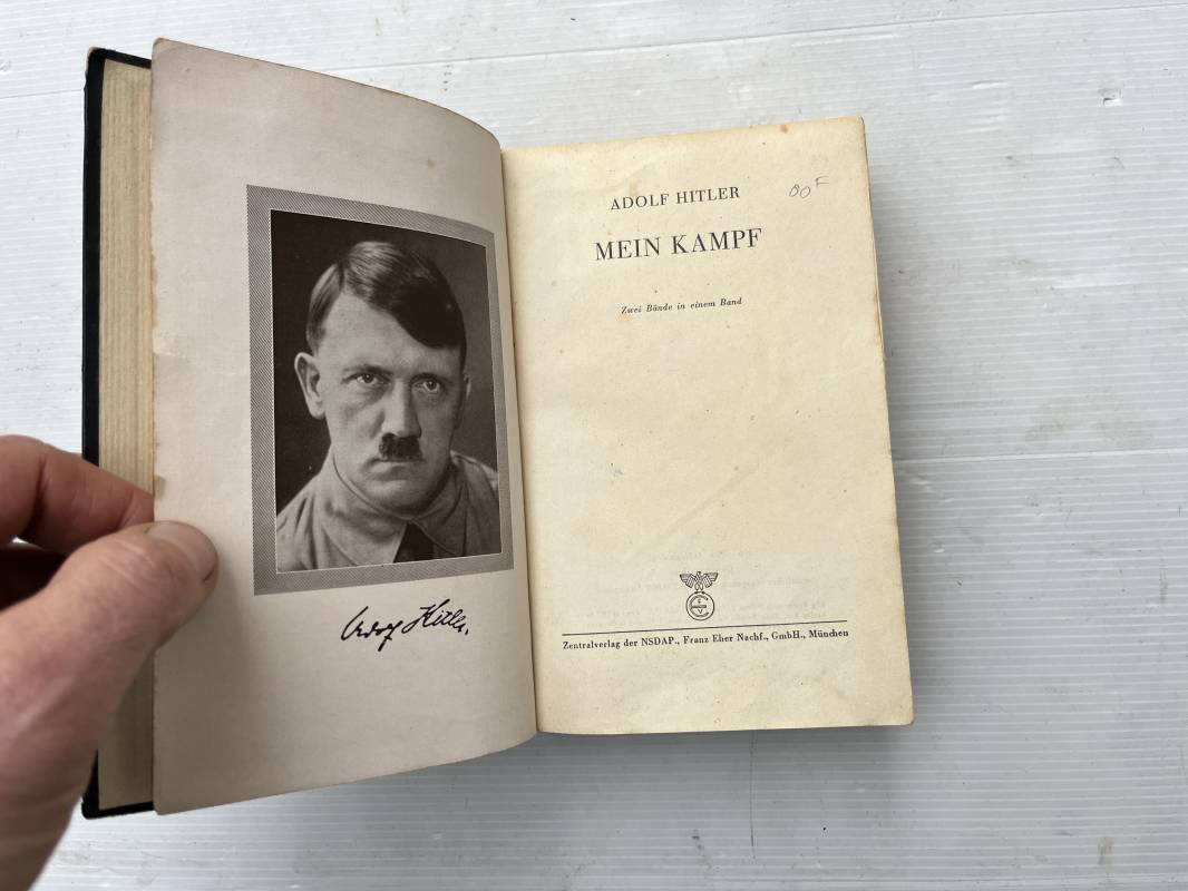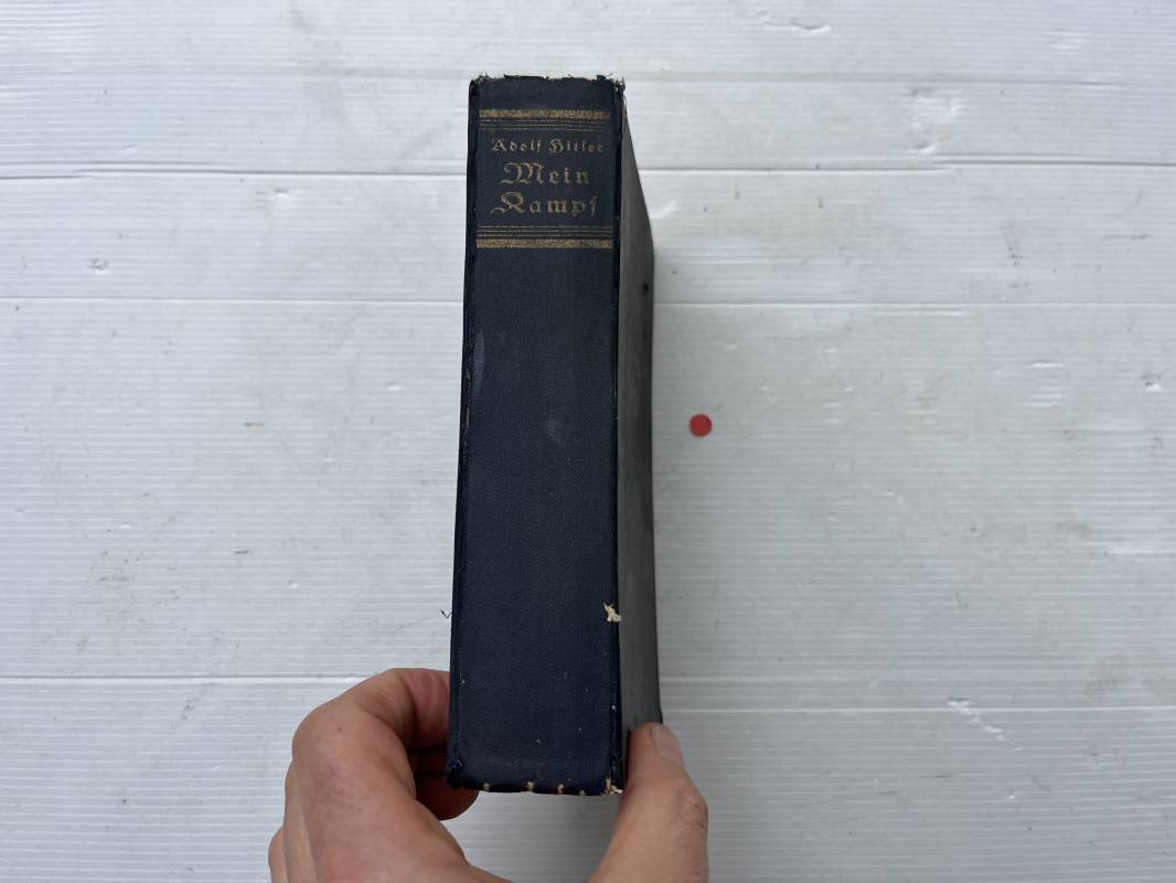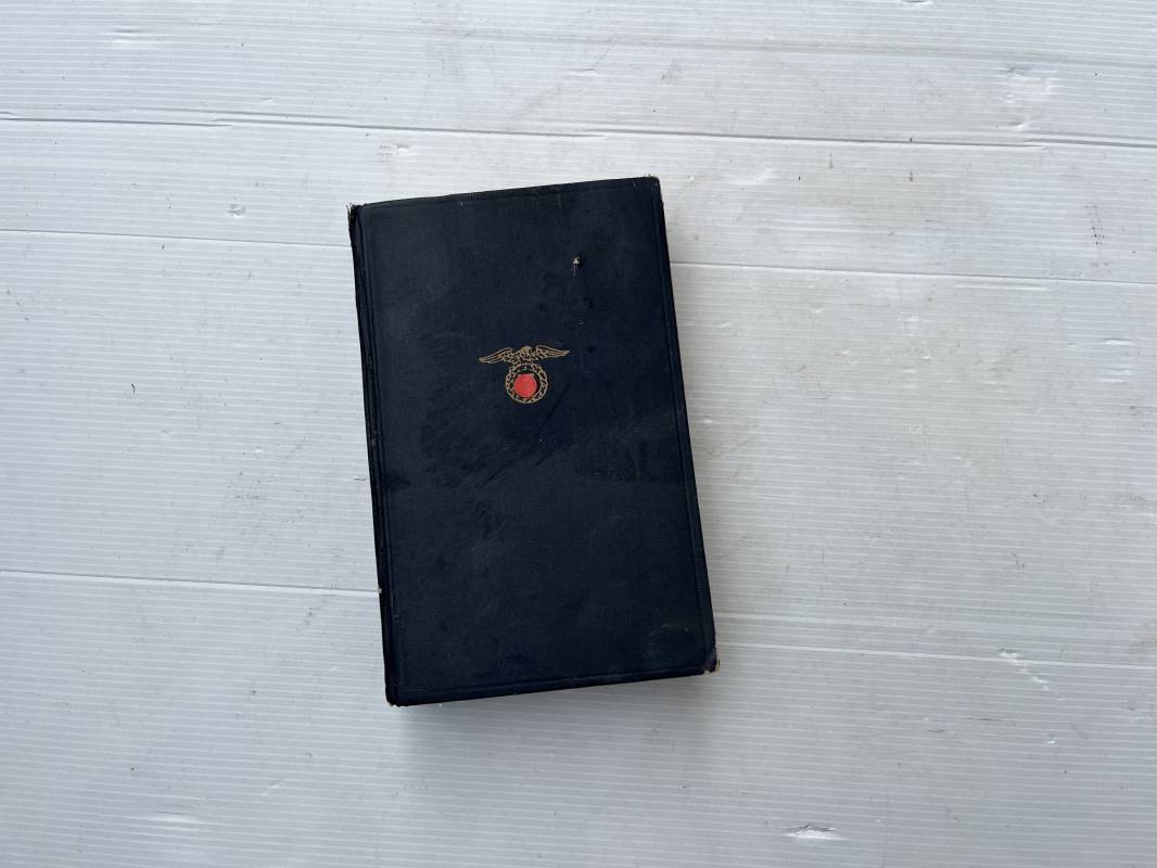 Livre Mein Kampf par Adolf Hitler . Edition originale en langue allemande édition 1942 Livre dimension 130X195 mm . Huit cents pages . Complet . . Bel état .Ce livre a ete ramené d Allemagne par un militaire francais de la 1ére Armée . Mention manuscrite d origine en première page ; ' 30 Avril 1945 chateau de Zingaudalkeen ' et signature , en deuxième page article de presse du pusch des generaux du 20 juillet 1944 ; Rare témoignage historique Ref 21823