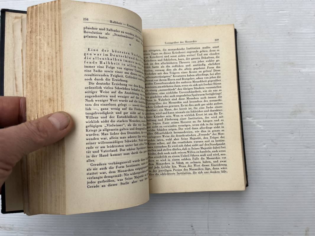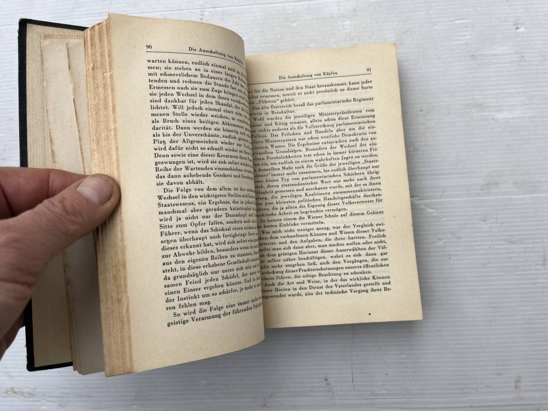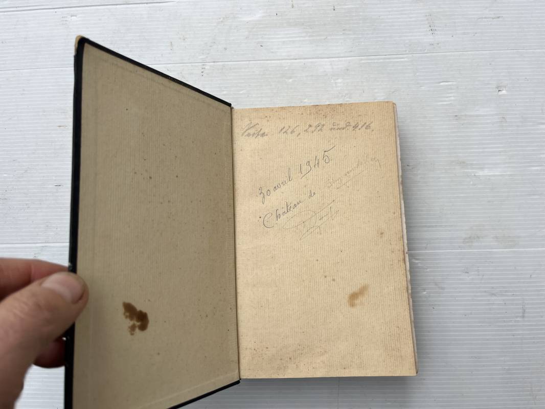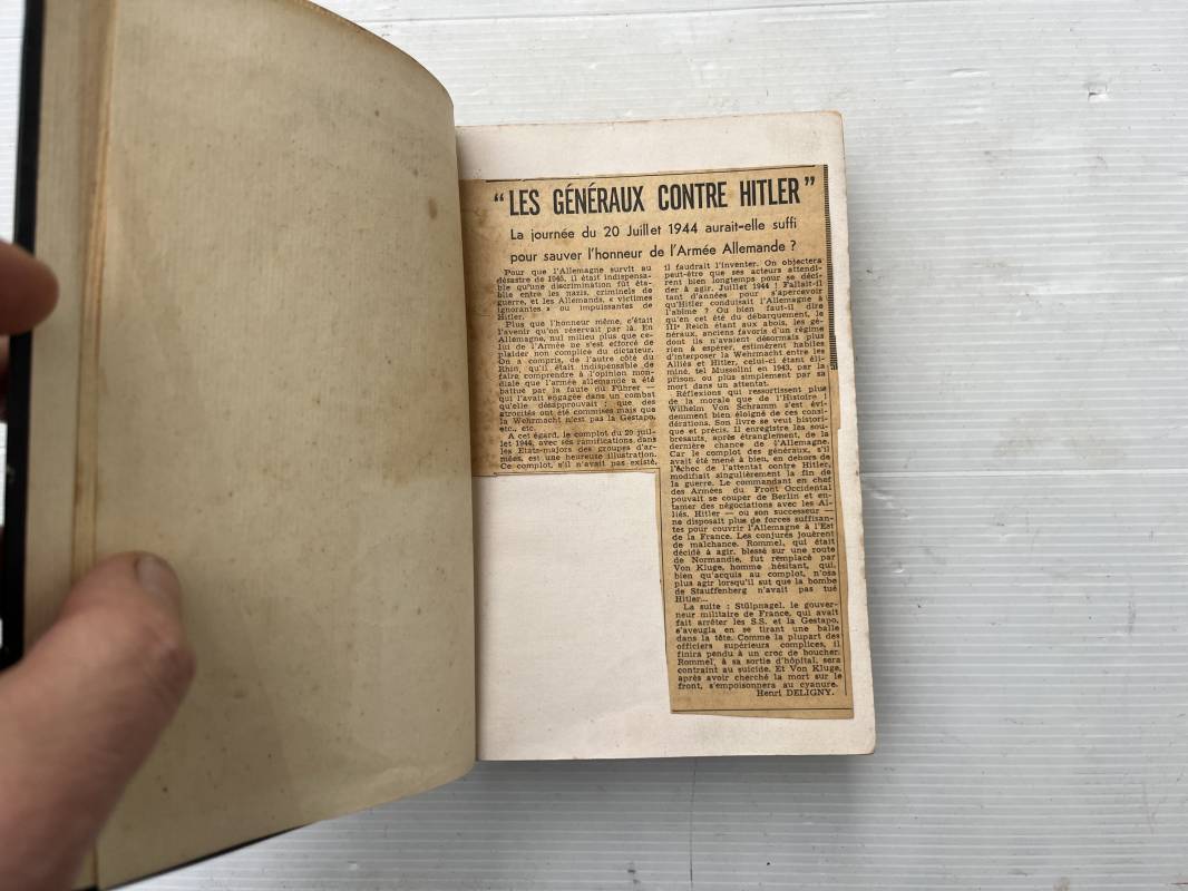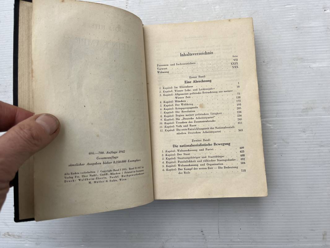 Livre Mein Kampf par Adolf Hitler . Edition originale en langue allemande édition 1942 Livre dimension 130X195 mm . Huit cents pages . Complet . . Bel état .Ce livre a ete ramené d Allemagne par un militaire francais de la 1ére Armée . Mention manuscrite d origine en première page ; ' 30 Avril 1945 chateau de Zingaudalkeen ' et signature , en deuxième page article de presse du pusch des generaux du 20 juillet 1944 ; Rare témoignage historique Ref 21823