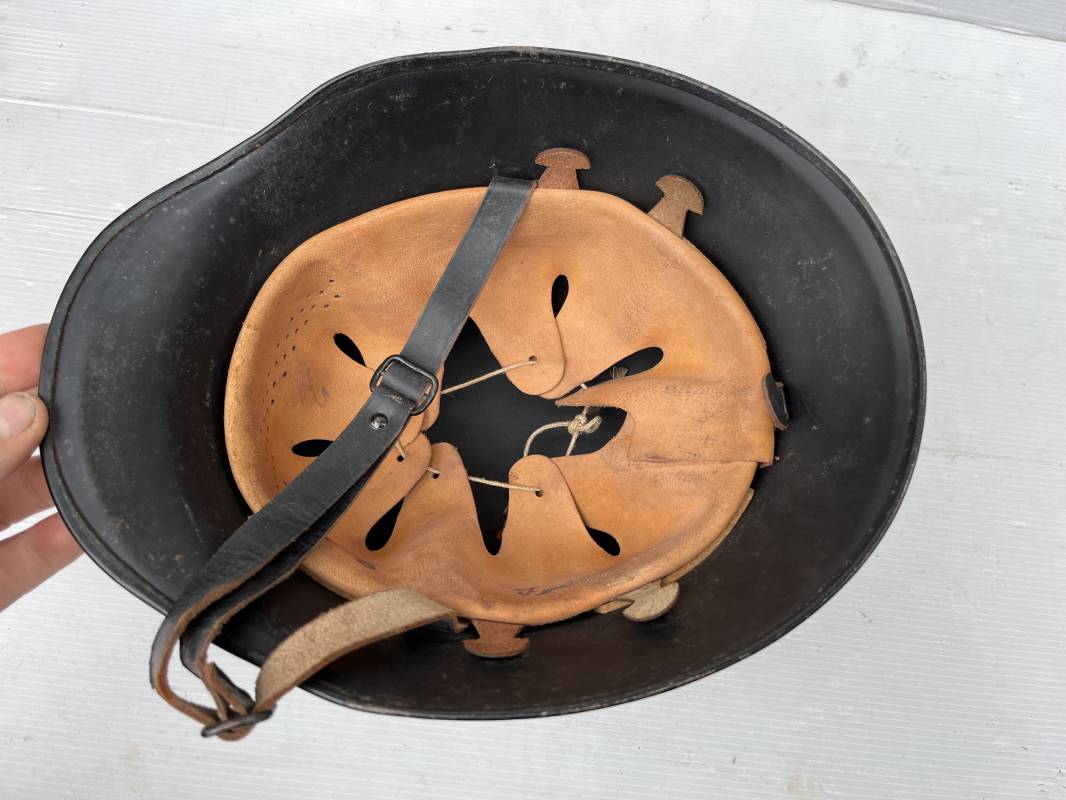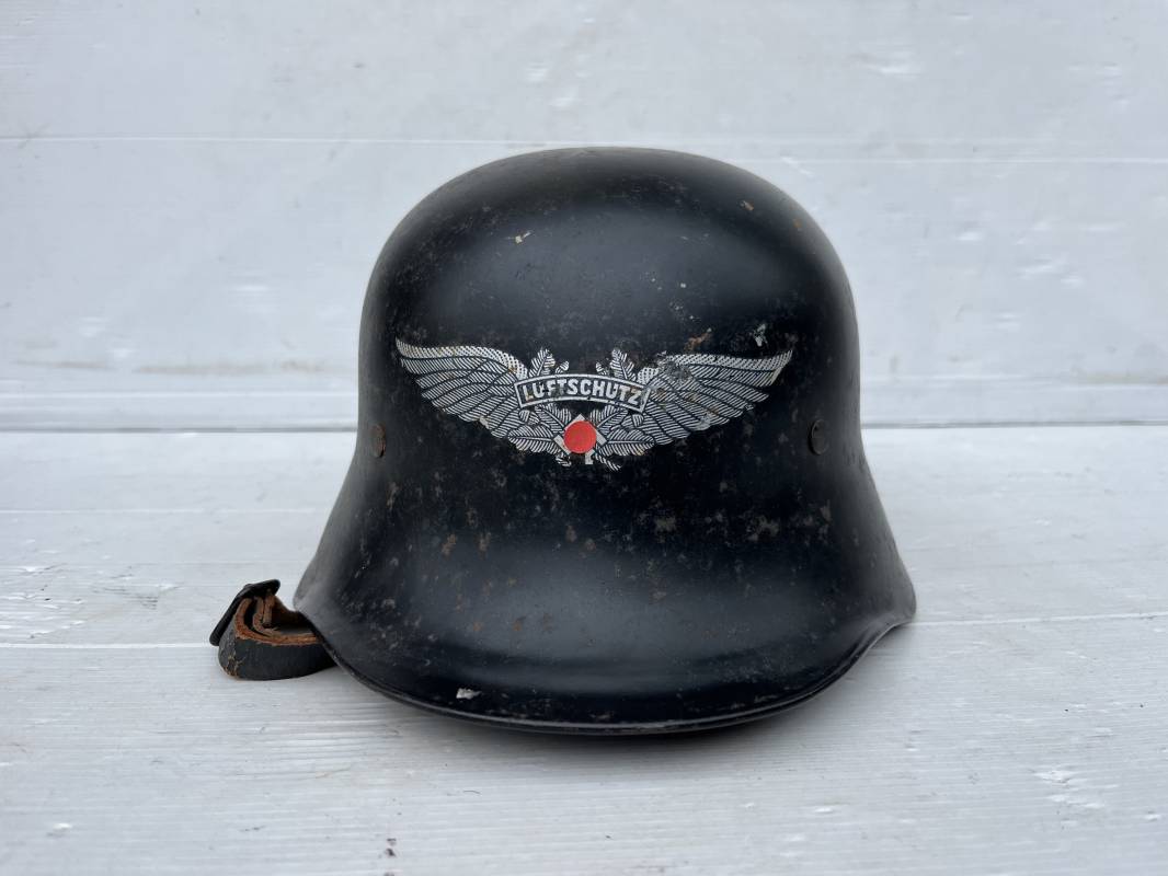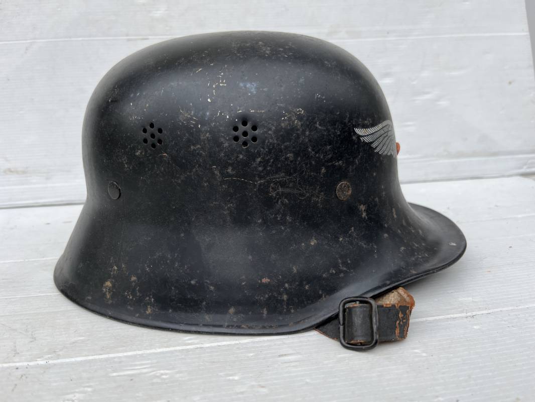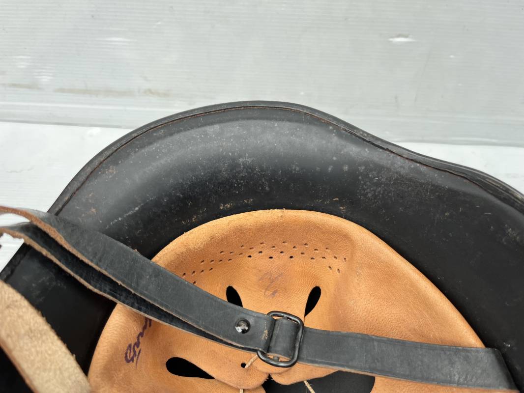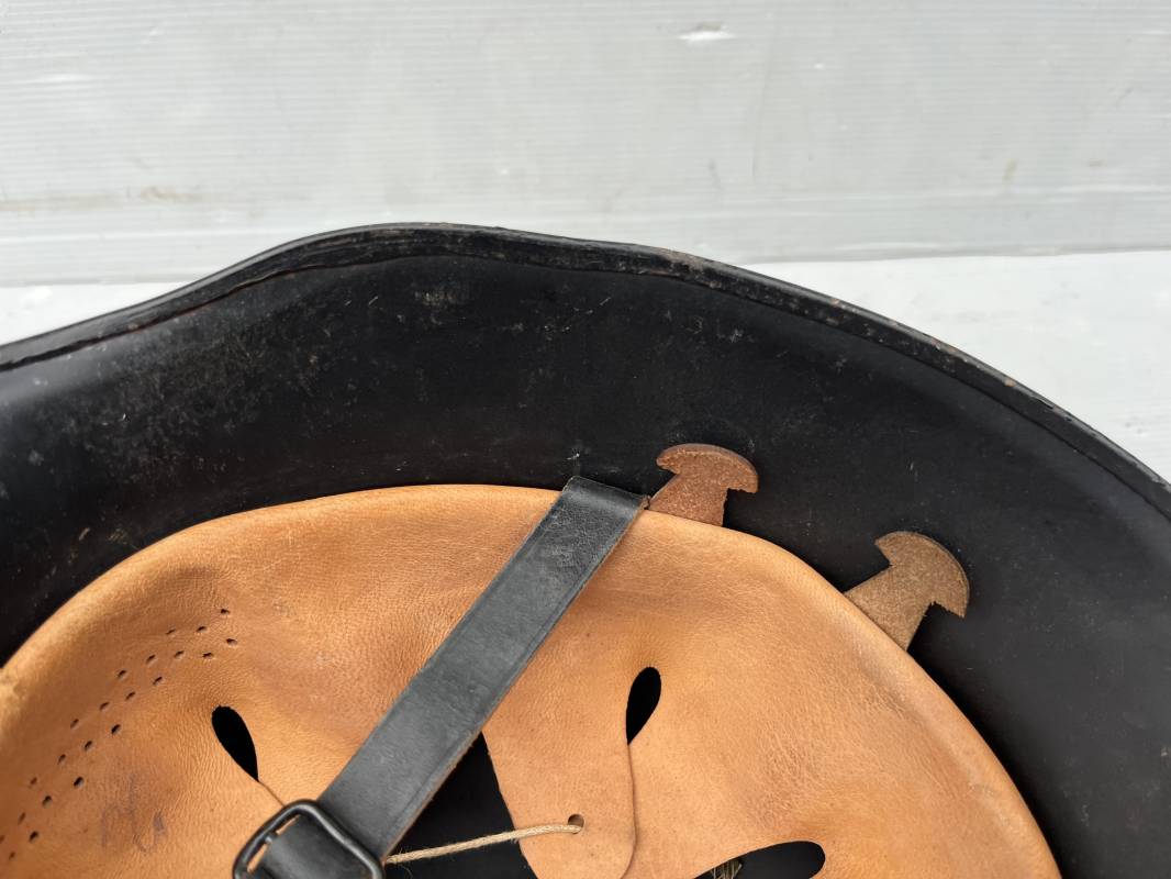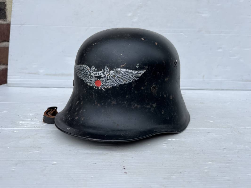Tres beau casque modele 1934 de la Luftschutz ( défense passive du Reich ) . Casque en acier , peinture bleu nuit d'usinage , oeillets de ventilation . Insigne frontal de la LS sur le devant . Jugulaire en cuir noir et boucles metalliques , cuir souple . Coiffe interieure en cuir naturel fauve , cuir souple . Lacet coton d'origine taille 56 . Casque légérement porté en tres bel état 1940/45 Ref 19842