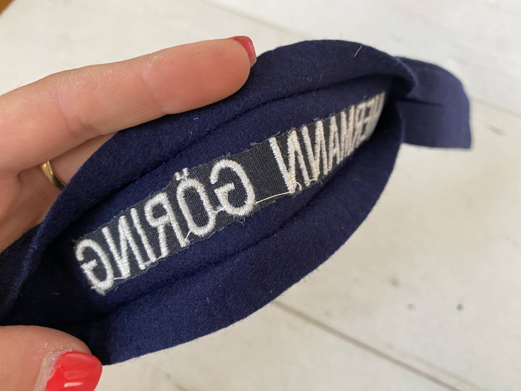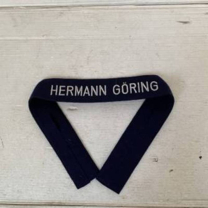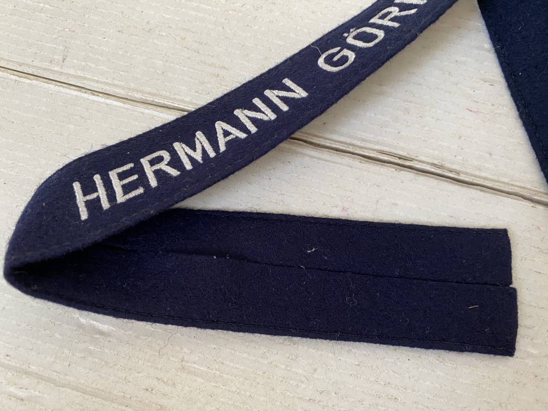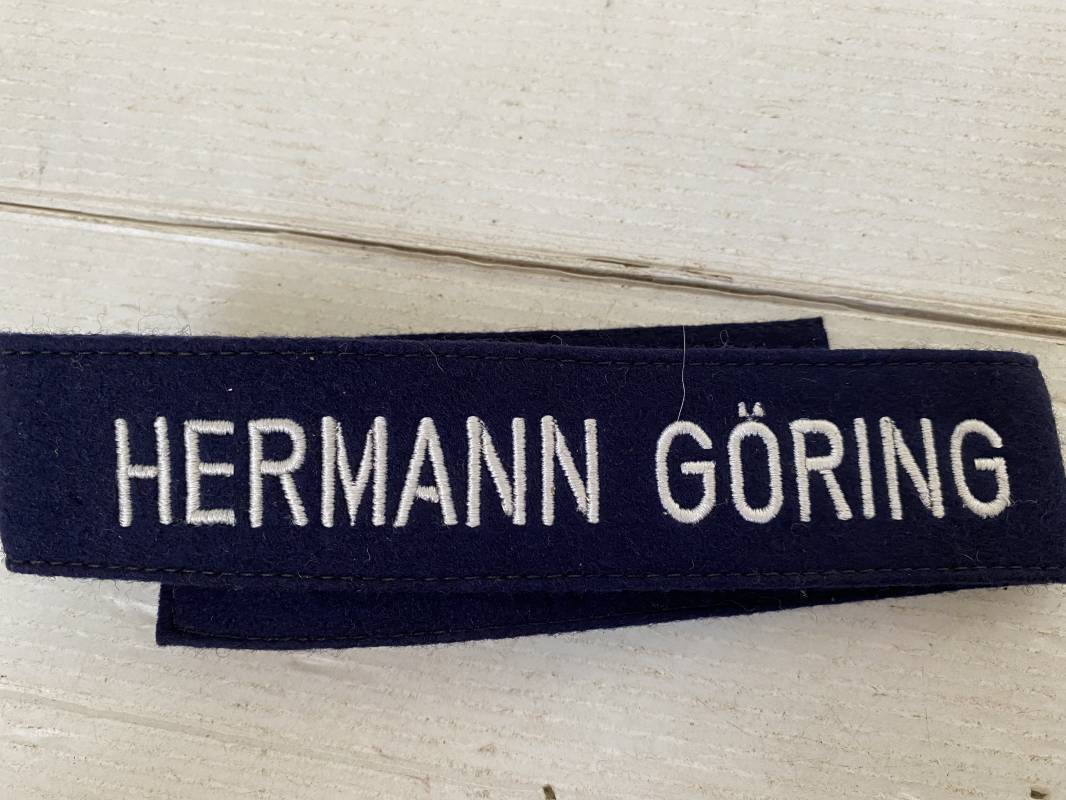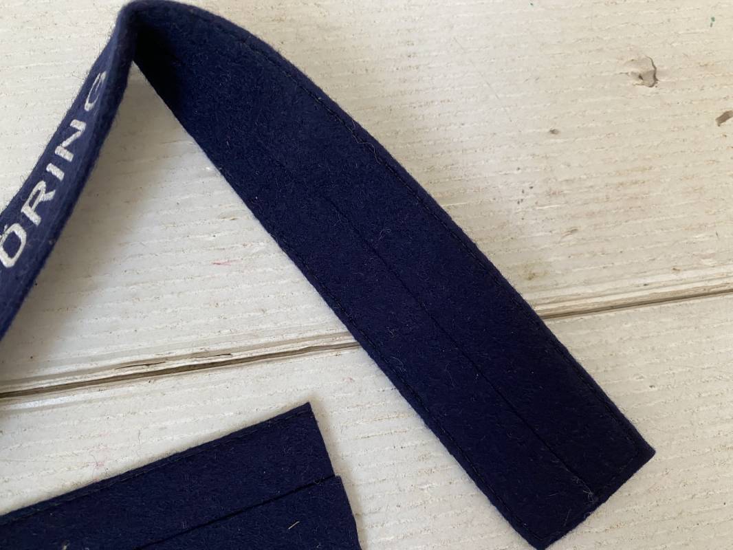 Rare bande de bras troupe de dotation du régiment Hermann Goring. Bande réglementaire du 2ème type en drap bleu nuit. Lettres tissées en fil de coton blanc. Pleine longueur 440mm. Cette bande n'a jamais été montée sur une vareuse. Bande retrouvée en succession familiale en Allemagne. Superbe état 1940/45. Ref 13985