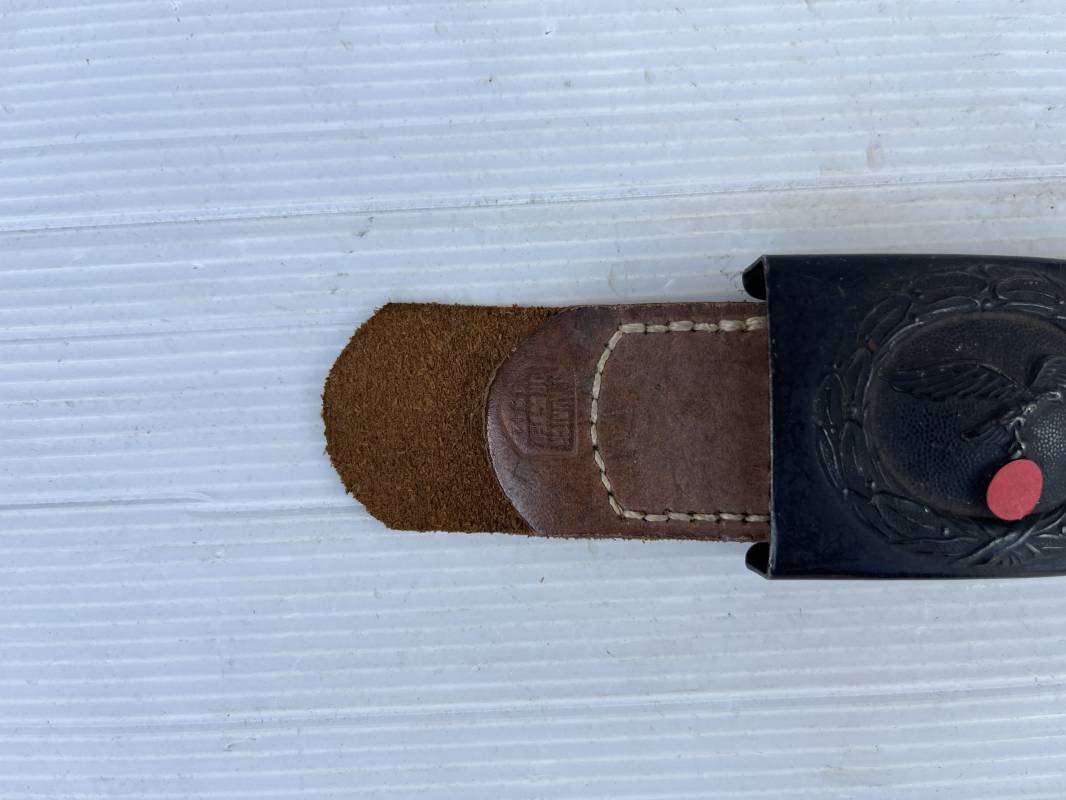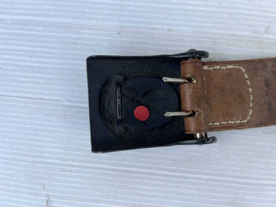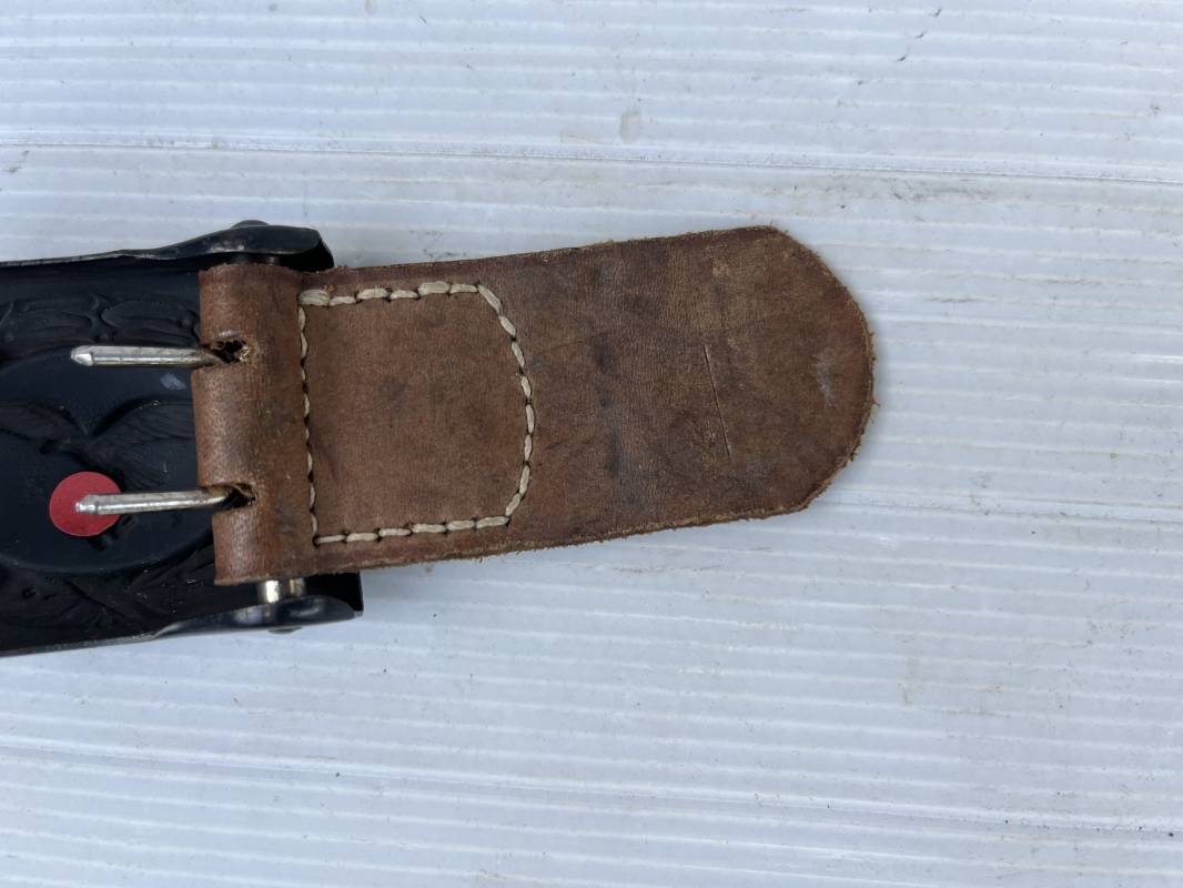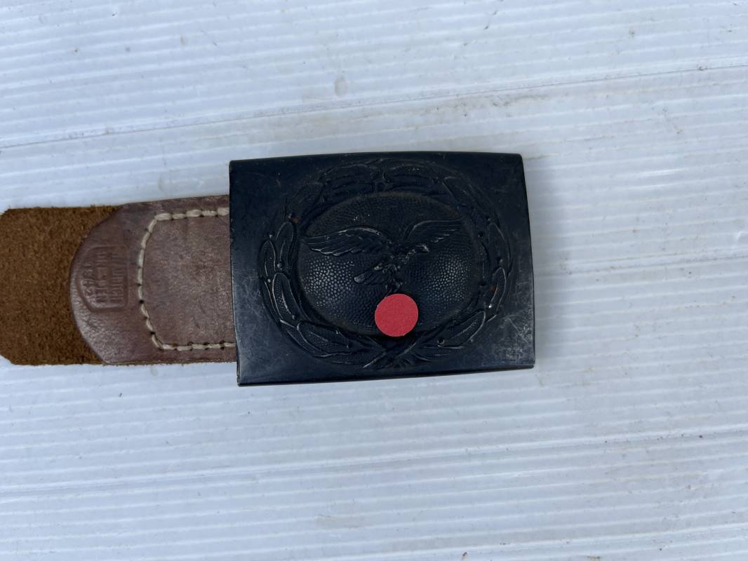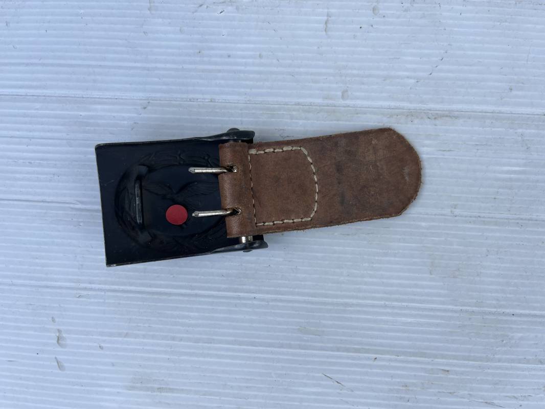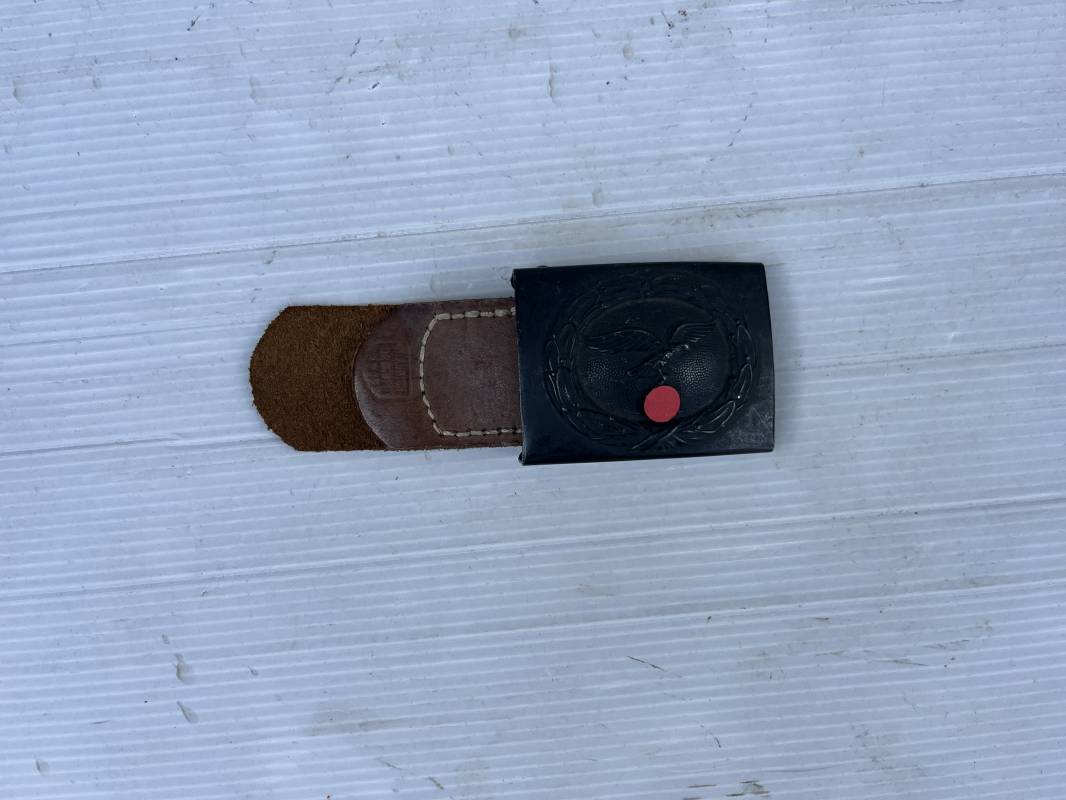 Trés belle boucle fer troupe de la Luftwaffe modéle 1940 . Peinture gris bleu d usinage en parfait état . Boucle fer avec trés beaux reliefs Passant et crochet métallique . Patelette en cuir marron , marquage fabricant H. Aurich Dresden 1942 . Etat quasi neuf . Ref 21561