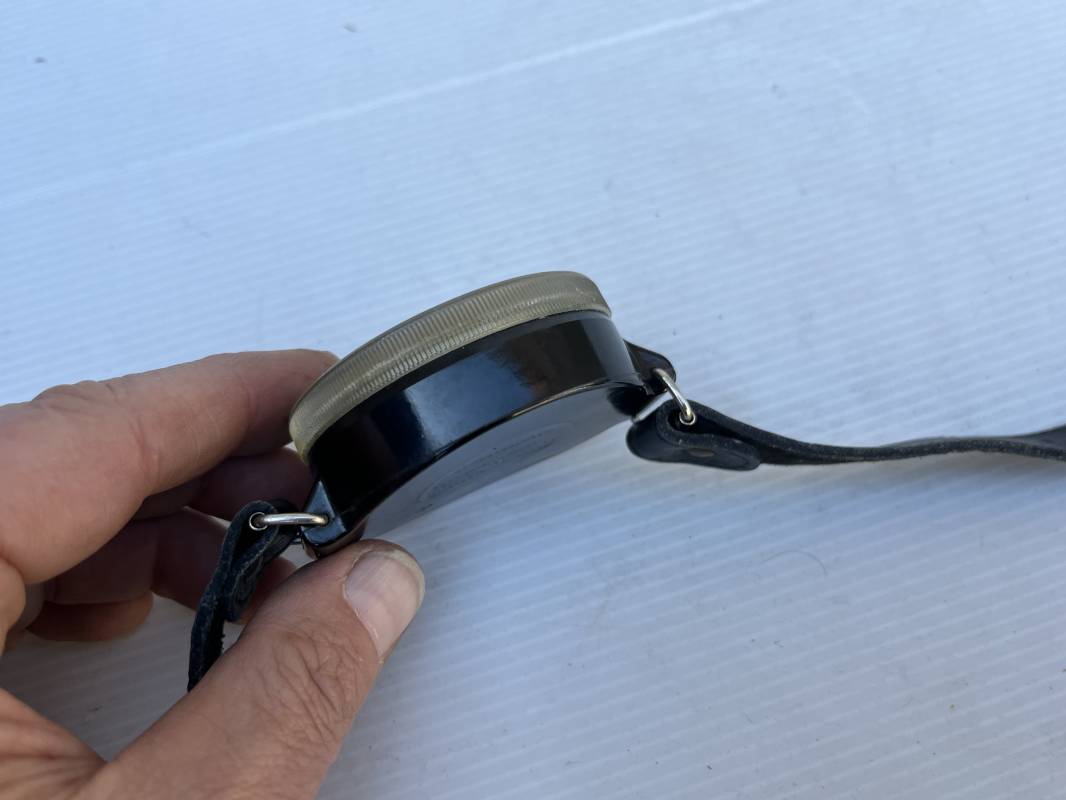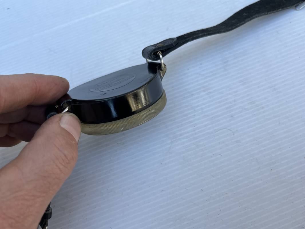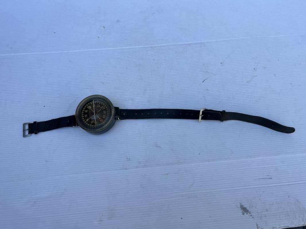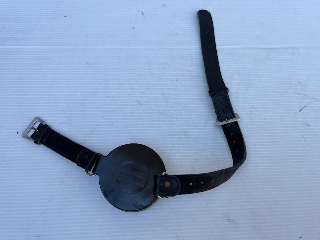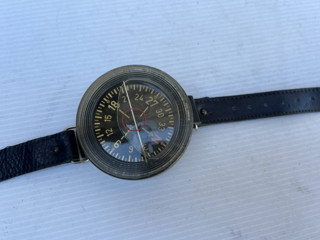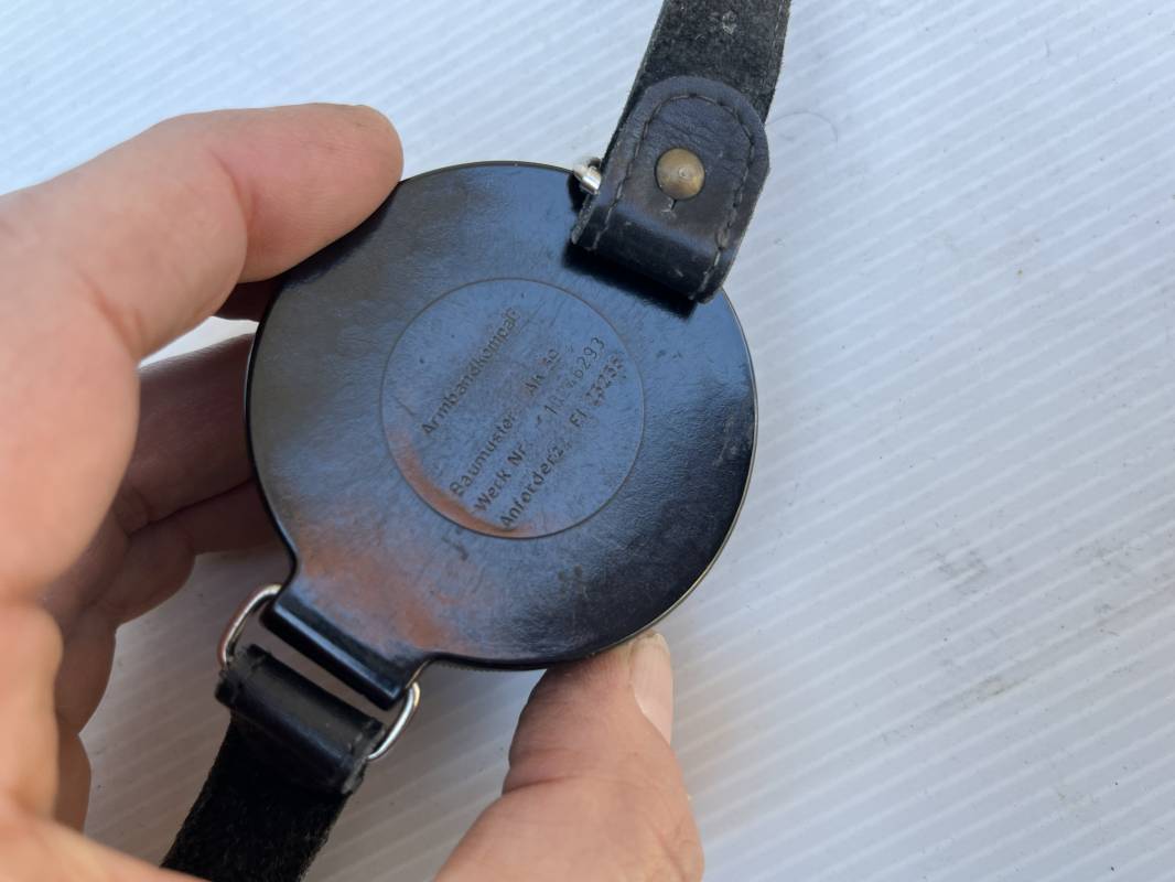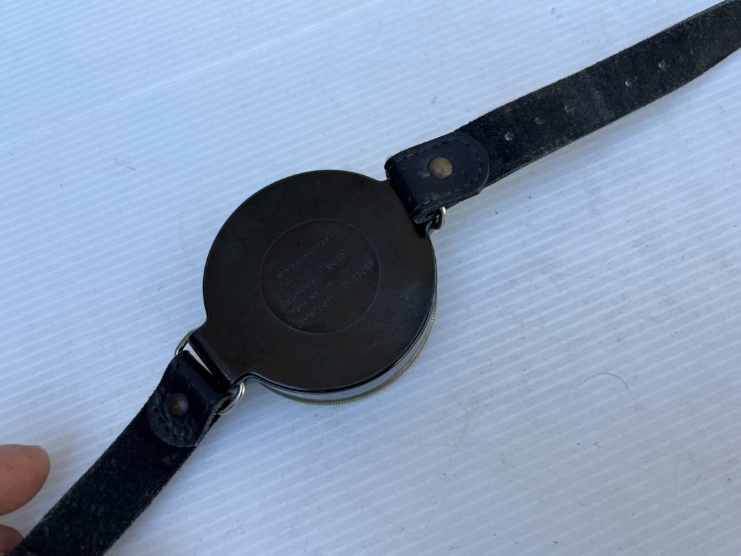 Trés belle boussole de poignée d'un navigant de la Luftwaffe. Boussole AK39 en bakélite noir. Cadran rotatif en pléxi. Aiguille et millièmes. Boussole fonctionnelle.Marquages au dos AK 39 Fl 232 35 . Bracelet en cuir fin noir d'origine avec sa ralonge . Boucle plate à un ardillon en alu. Légèrement utilisé en parfait état 1939/45. Ref 19800