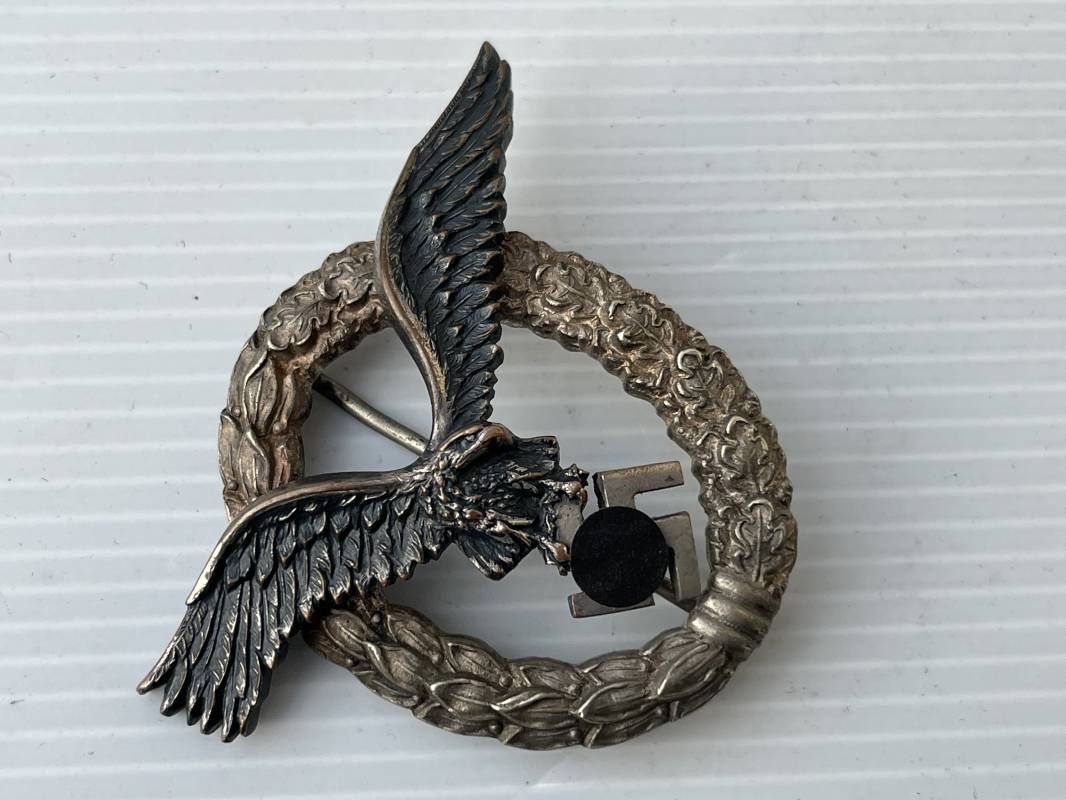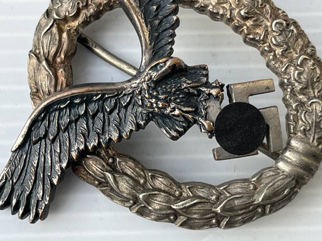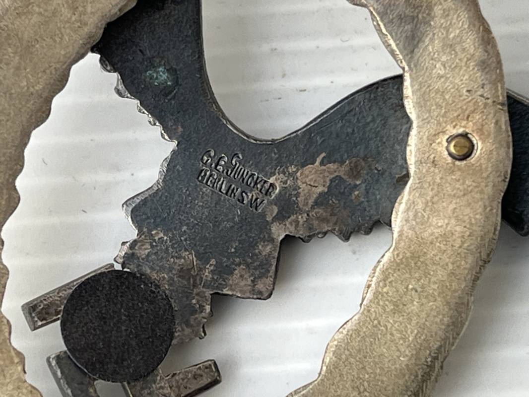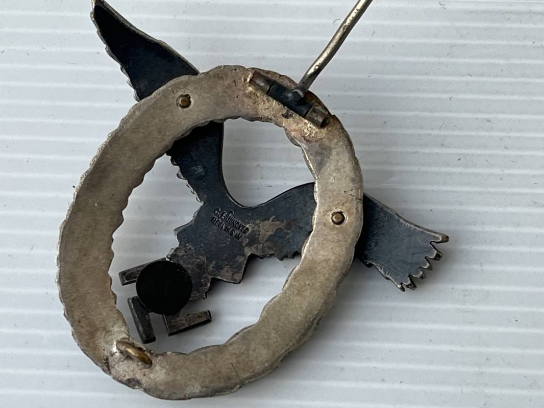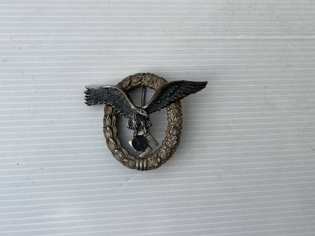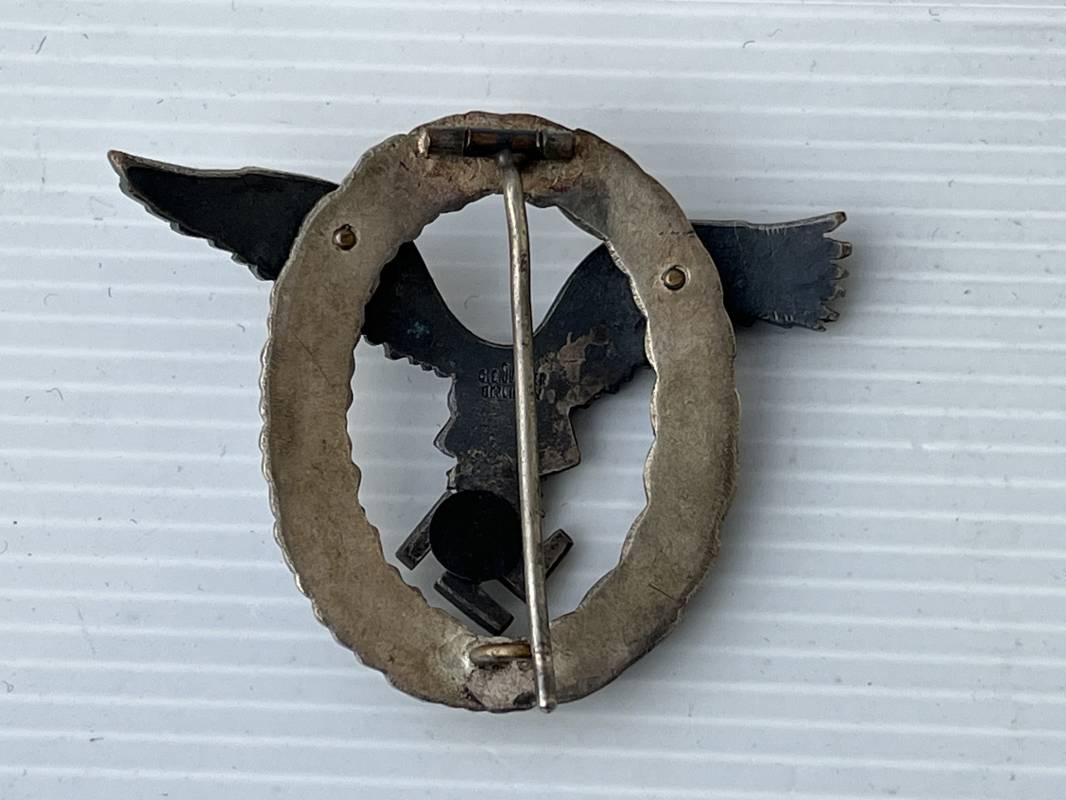 Très beau brevet de pilote de la Luftwaffe fabricant C.E. Juncker Berlin . Très belle fabrication soignée légèrement bombée. Couronne et feuilles de chêne. Aigle riveté, très beaux relief . Marquage fabricant au dos C.E. Juncker Berlin . Attache et crochet d'origines au dos. Légèrement porté en parfait état 1940/45.Ref 21610