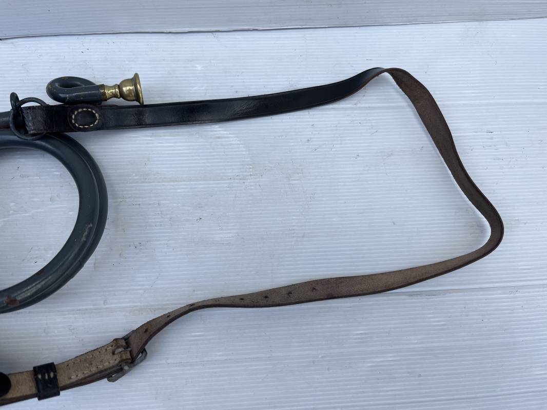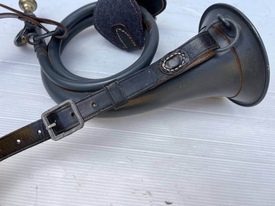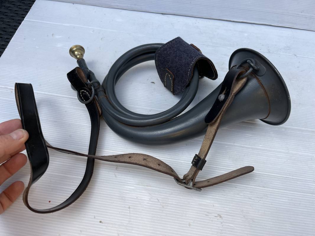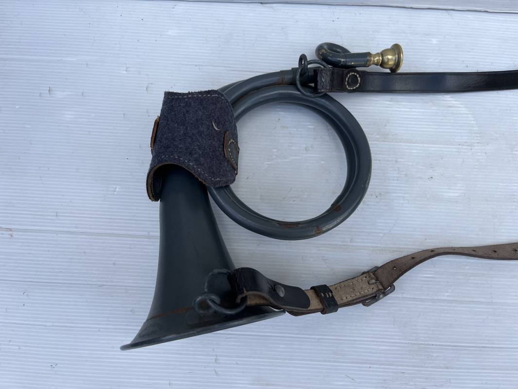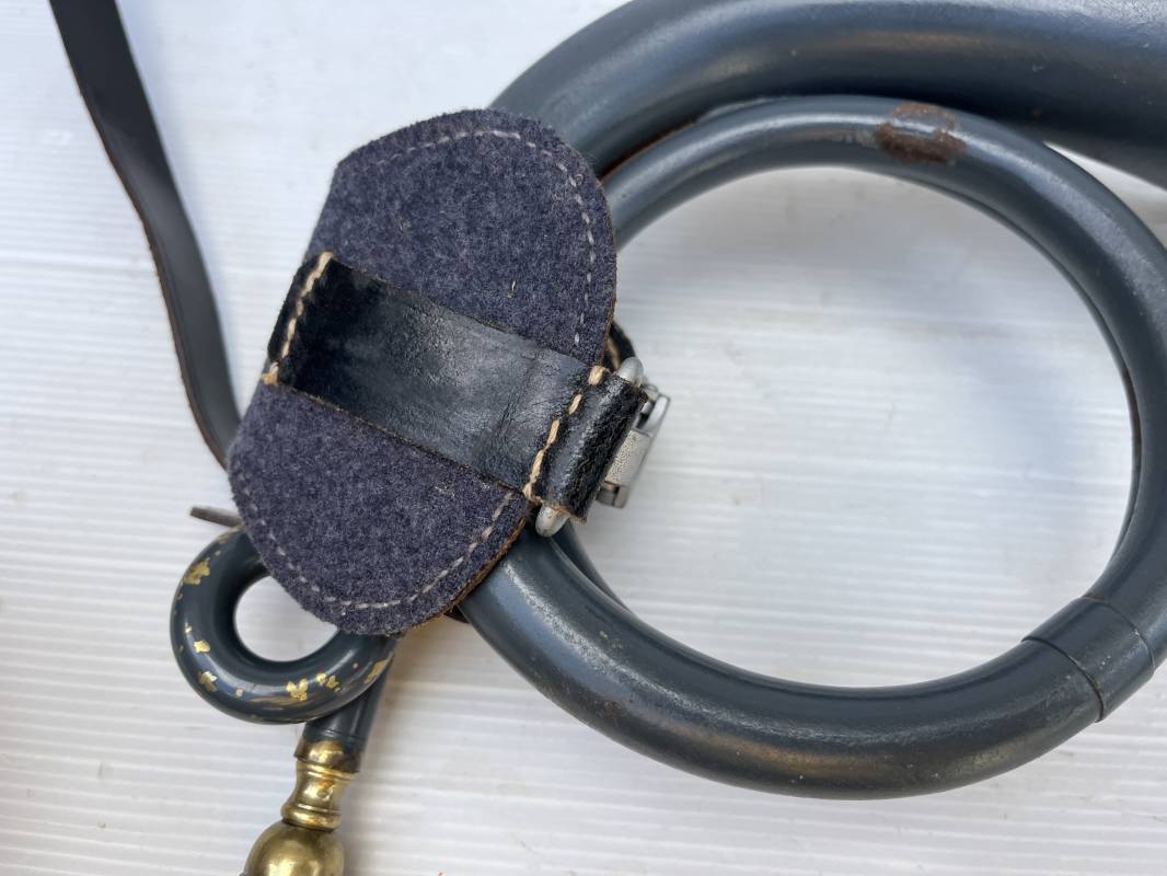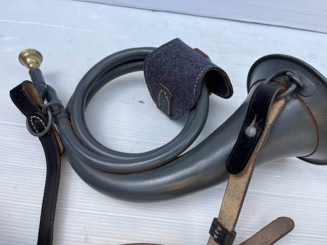 Rare bugle de la Luftwaffe avec son plastron et sa rare sangle . Bugle de dotation pour rassemblement ou fonction de transmission . Bugle acier , peinture gris bleu , marquage fabricant Bohland Fuchs 1944 . Etat fonctionnel . Rare plastron pour le maintien au ceinturon , drap gris bleu et cuir noir , crochet et boucle alu . Rare sangle de portage en cuir noir , boucle fer , marquage fabricant daté 1944 . Rare ensemble homogéne en parfait état . Peu courant Ref 21477