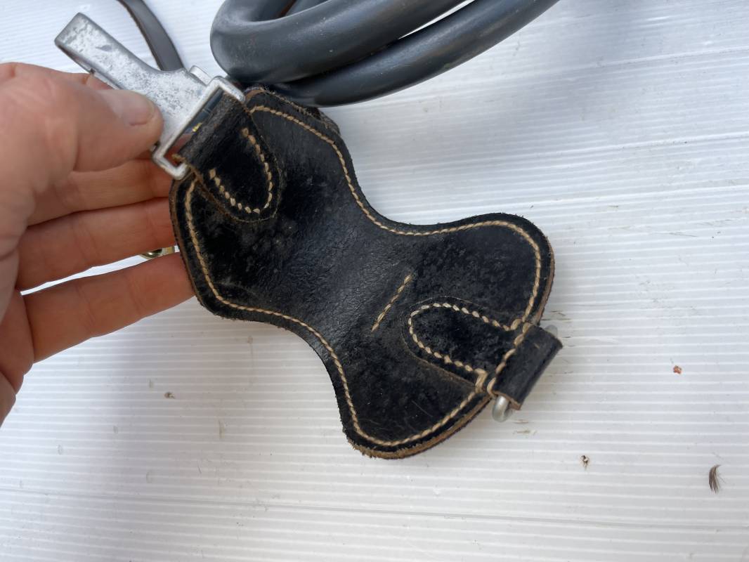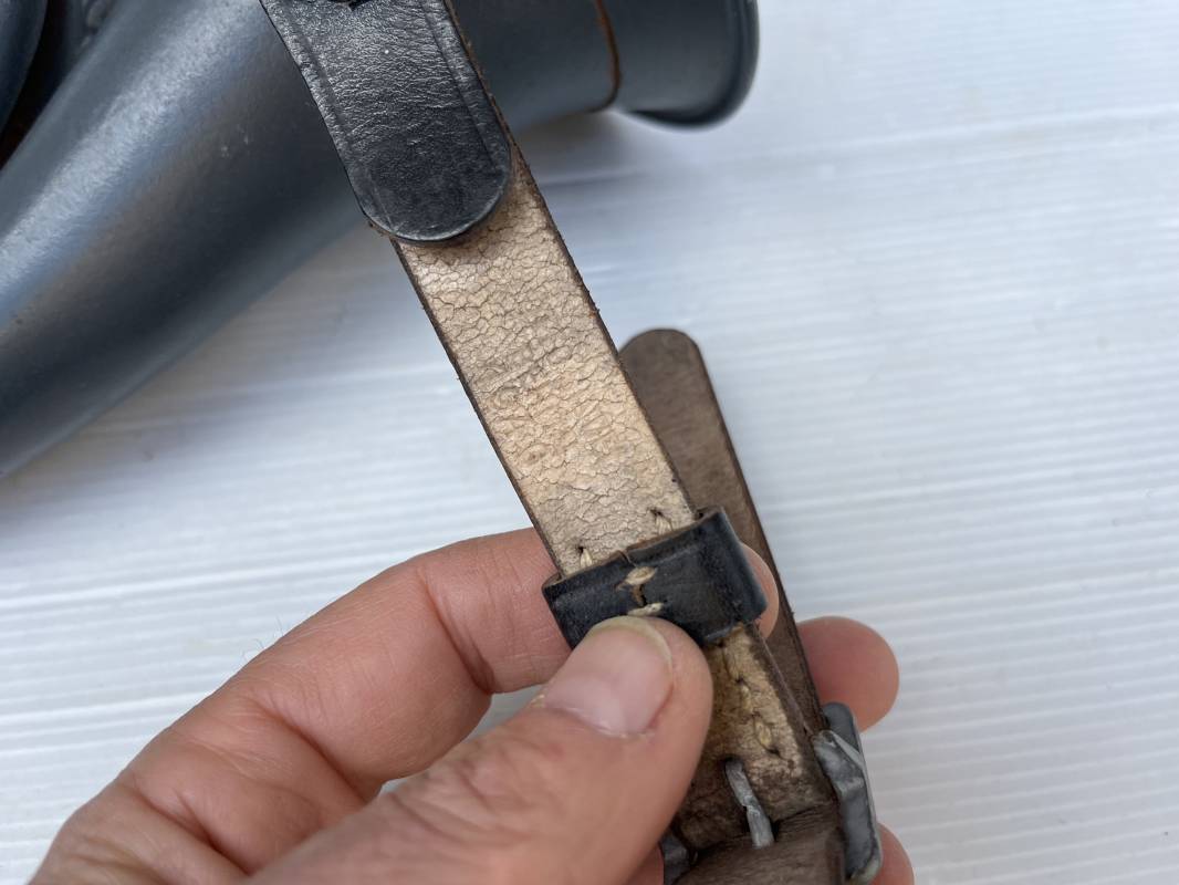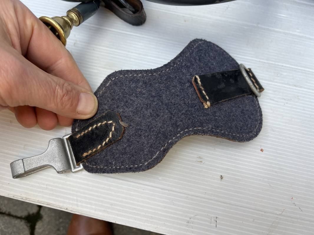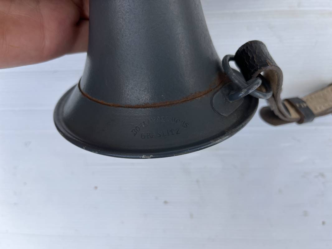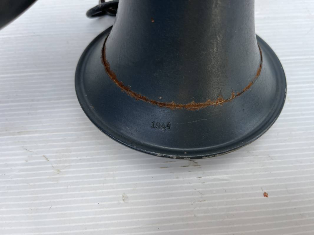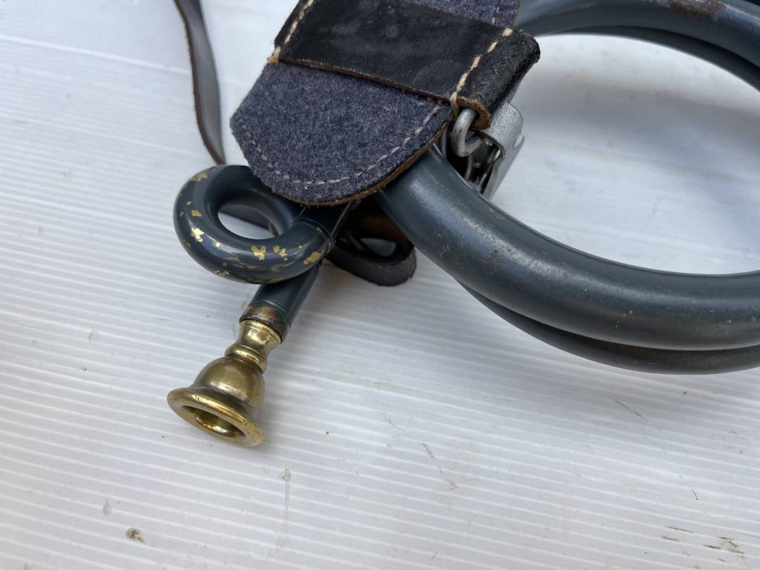 Rare bugle de la Luftwaffe avec son plastron et sa rare sangle . Bugle de dotation pour rassemblement ou fonction de transmission . Bugle acier , peinture gris bleu , marquage fabricant Bohland Fuchs 1944 . Etat fonctionnel . Rare plastron pour le maintien au ceinturon , drap gris bleu et cuir noir , crochet et boucle alu . Rare sangle de portage en cuir noir , boucle fer , marquage fabricant daté 1944 . Rare ensemble homogéne en parfait état . Peu courant Ref 21477