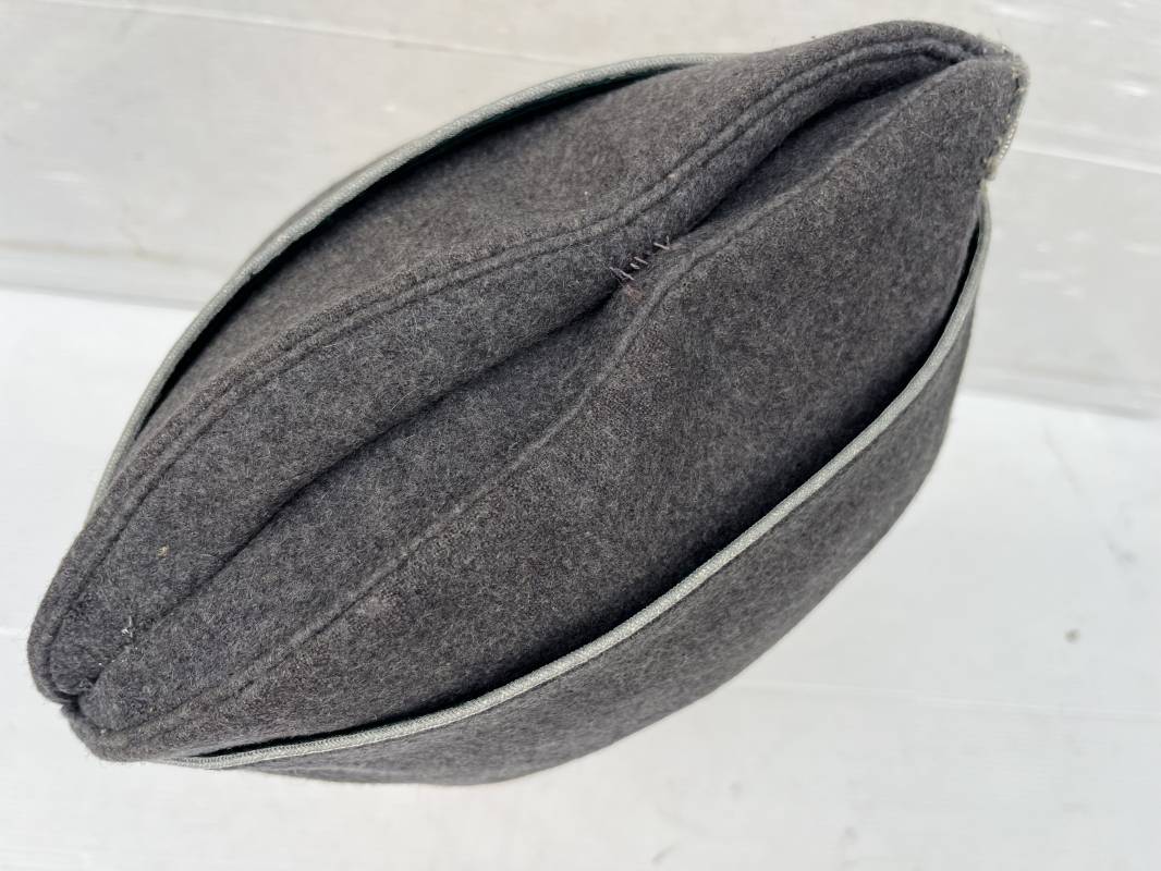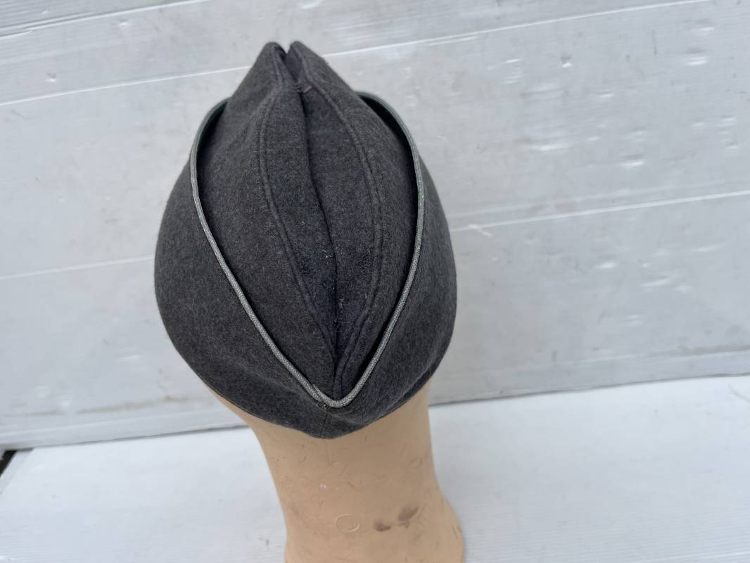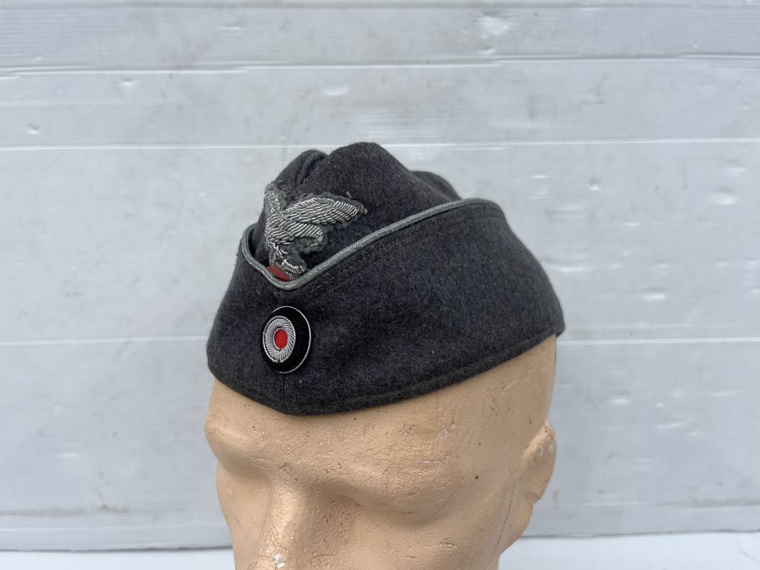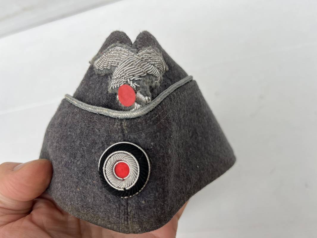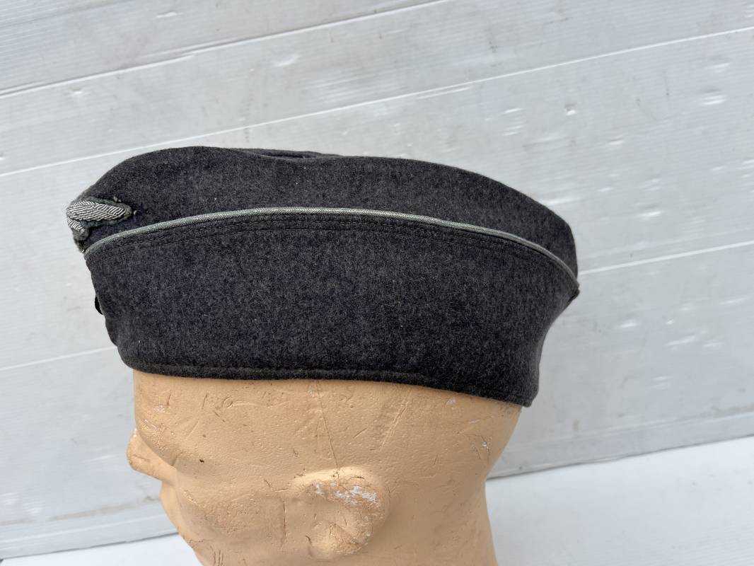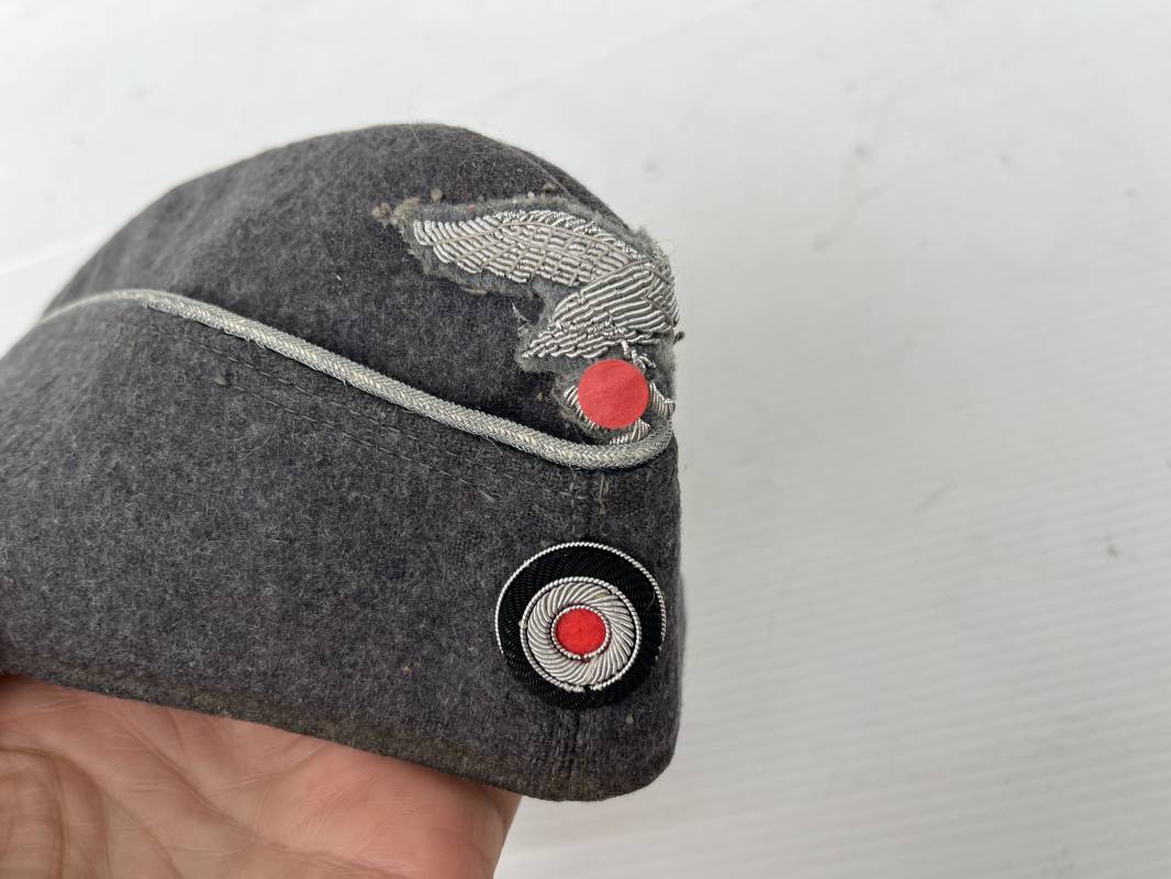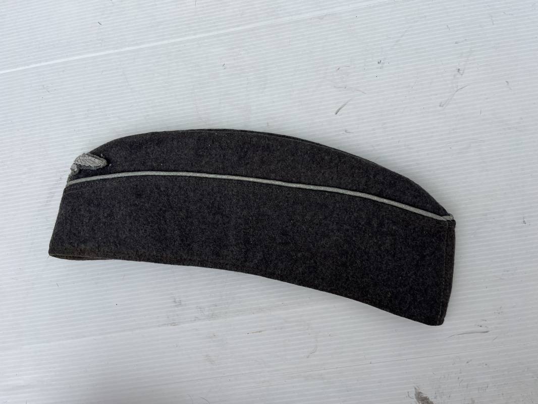 Trés beau calot officier de la Luftwaffe en drap gris bleu.Liseré argent toute arme pour officier , aigle et cocarde du modéle brodé cannetille . Rabats en drap, belle forme banane. Intèrieur doublé en coton gris bleu . Taille 58. Calot légèrement porté en trés bel état, 100% dans son jus et intouché.