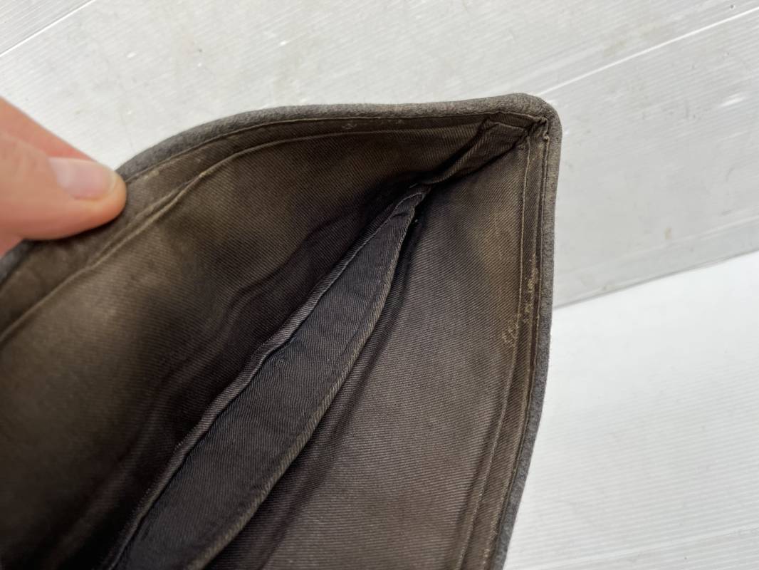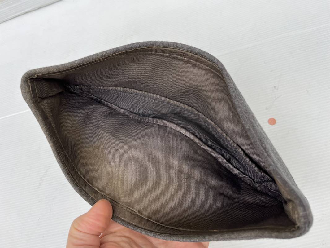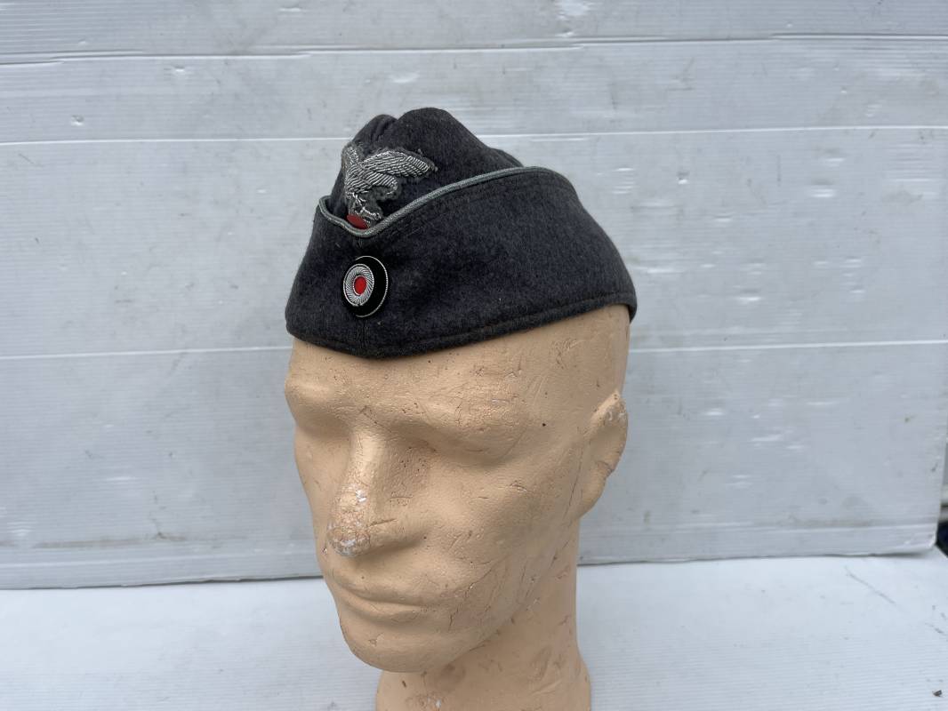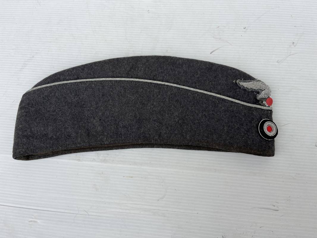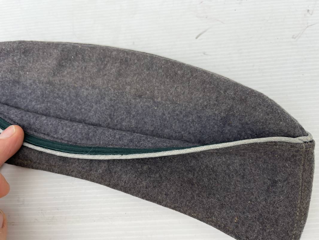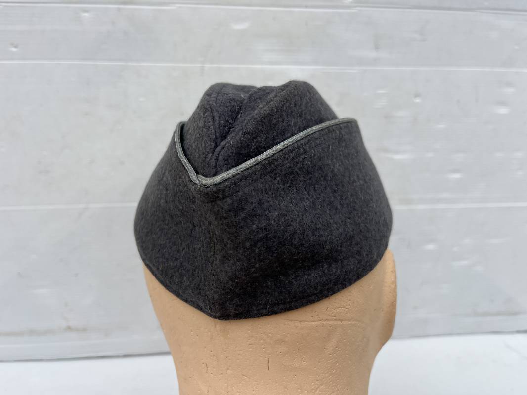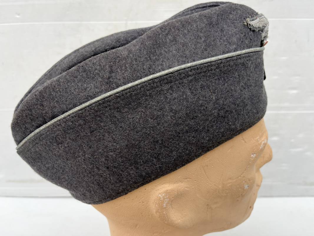 Trés beau calot officier de la Luftwaffe en drap gris bleu.Liseré argent toute arme pour officier , aigle et cocarde du modéle brodé cannetille . Rabats en drap, belle forme banane. Intèrieur doublé en coton gris bleu . Taille 58. Calot légèrement porté en trés bel état, 100% dans son jus et intouché.