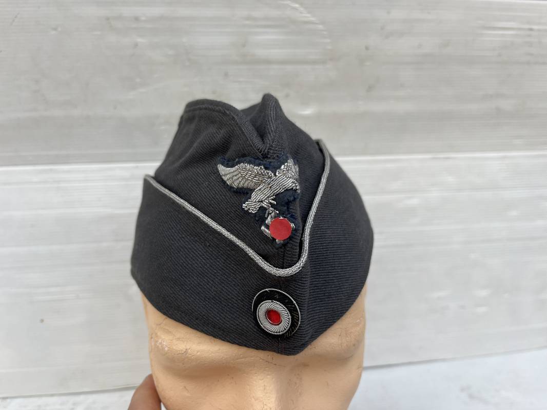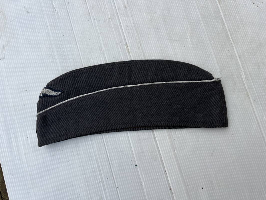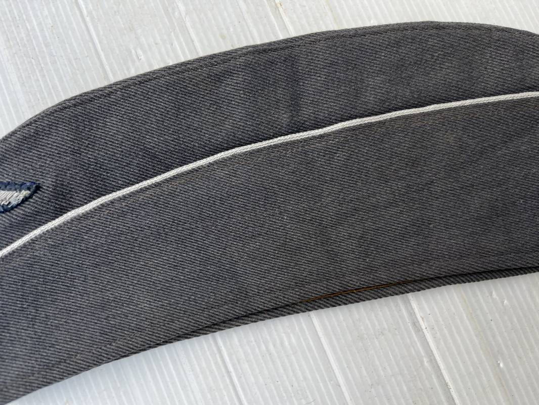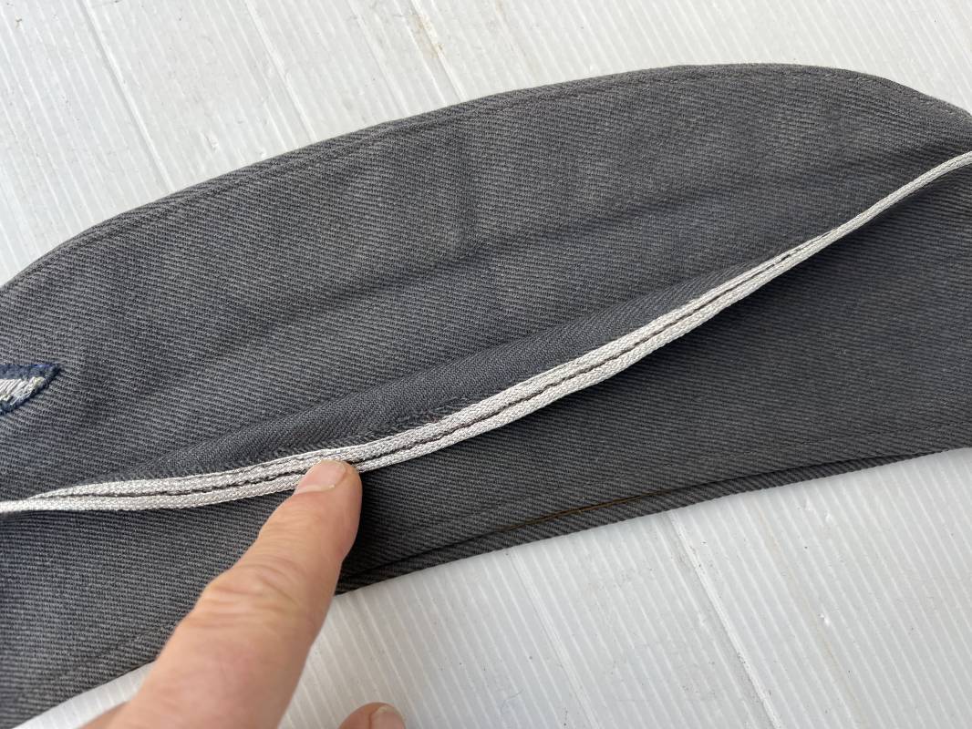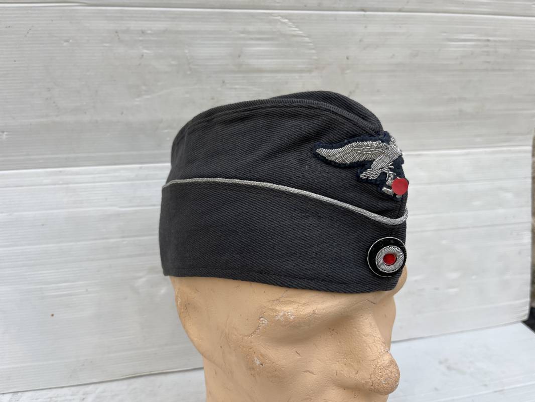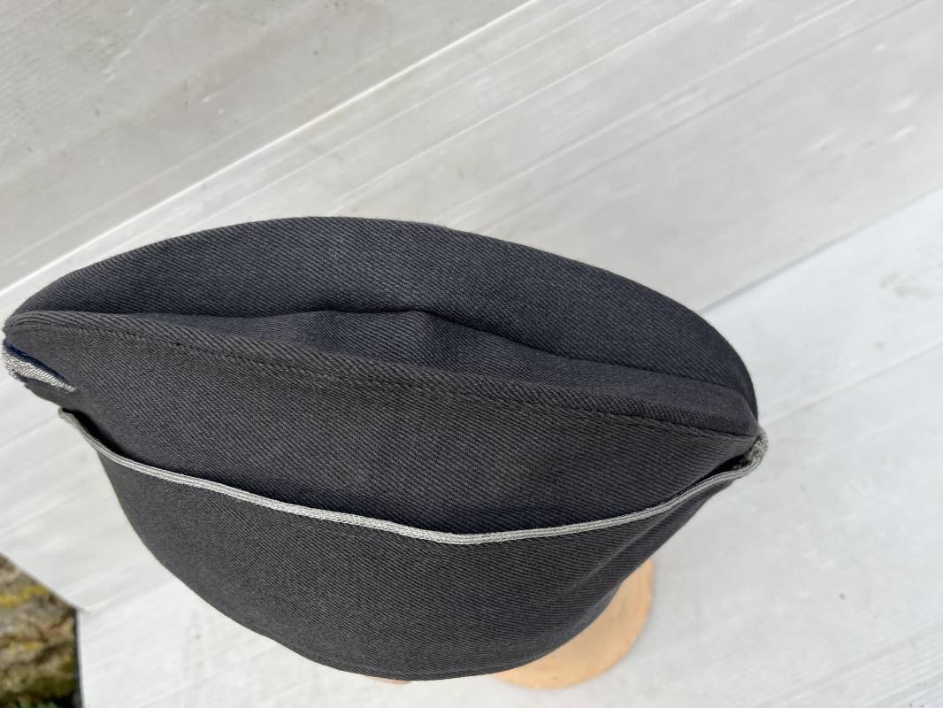 Rare calot officier modéle 1935 de la Luftwaffe en tricotine gris bleu . Rabats en tricotine , liseré argent toute arme pour officier .Insignes brodés aigle et cocarde brodés cannetille argent pour officier . Intérieur doublé en satinette brune , marquage encre noire de la taille '59' . Calot Légèrement porté en trés bel état . Rare variante de cnfection en tricotine gris bleu 1935/45 Ref 21558