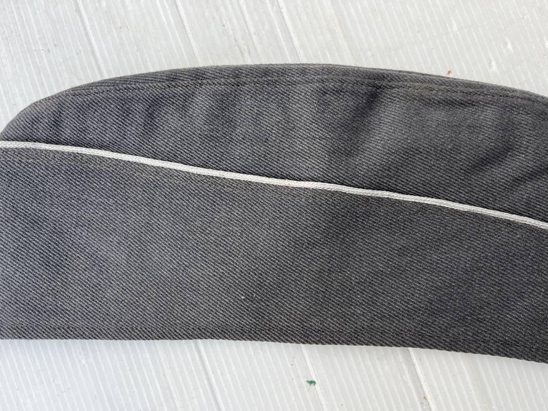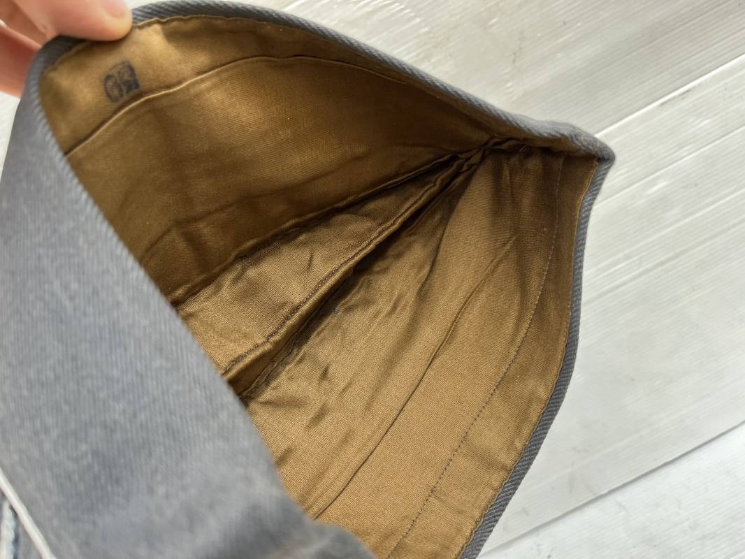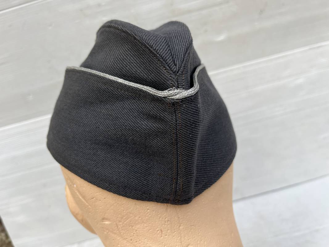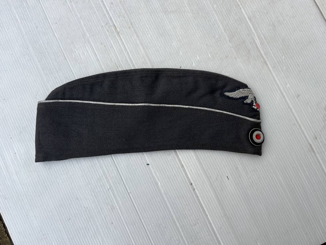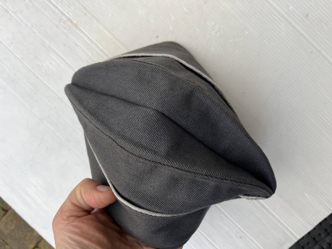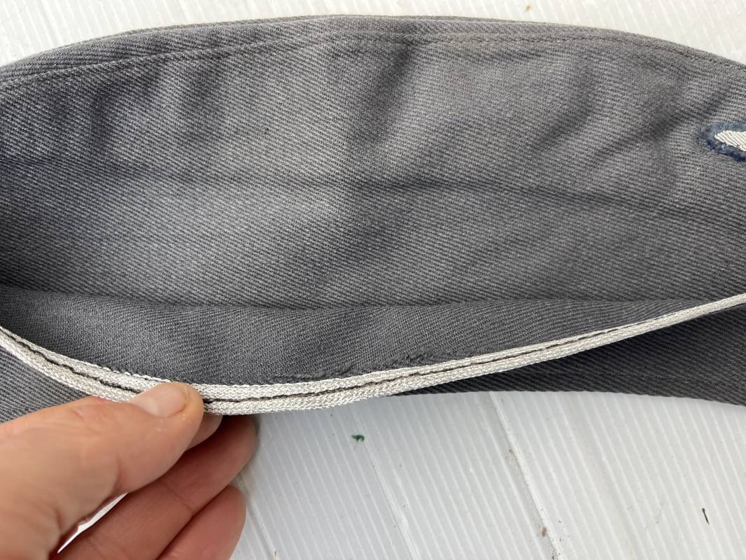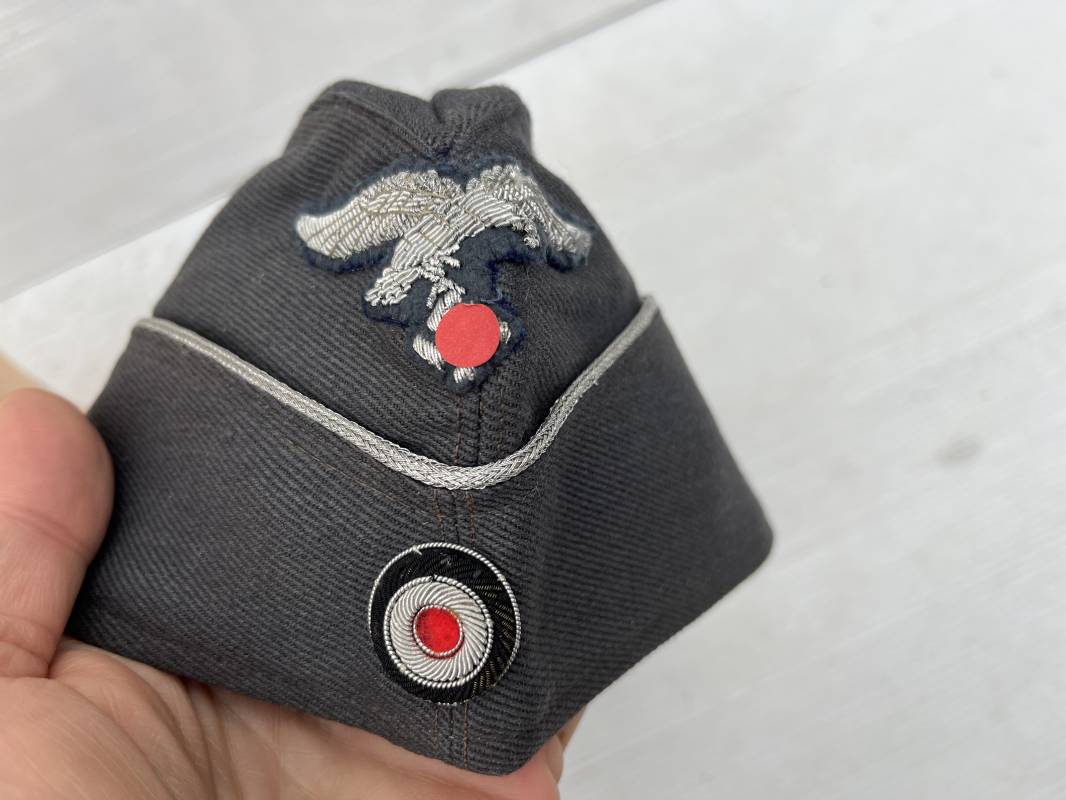 Rare calot officier modéle 1935 de la Luftwaffe en tricotine gris bleu . Rabats en tricotine , liseré argent toute arme pour officier .Insignes brodés aigle et cocarde brodés cannetille argent pour officier . Intérieur doublé en satinette brune , marquage encre noire de la taille '59' . Calot Légèrement porté en trés bel état . Rare variante de cnfection en tricotine gris bleu 1935/45 Ref 21558